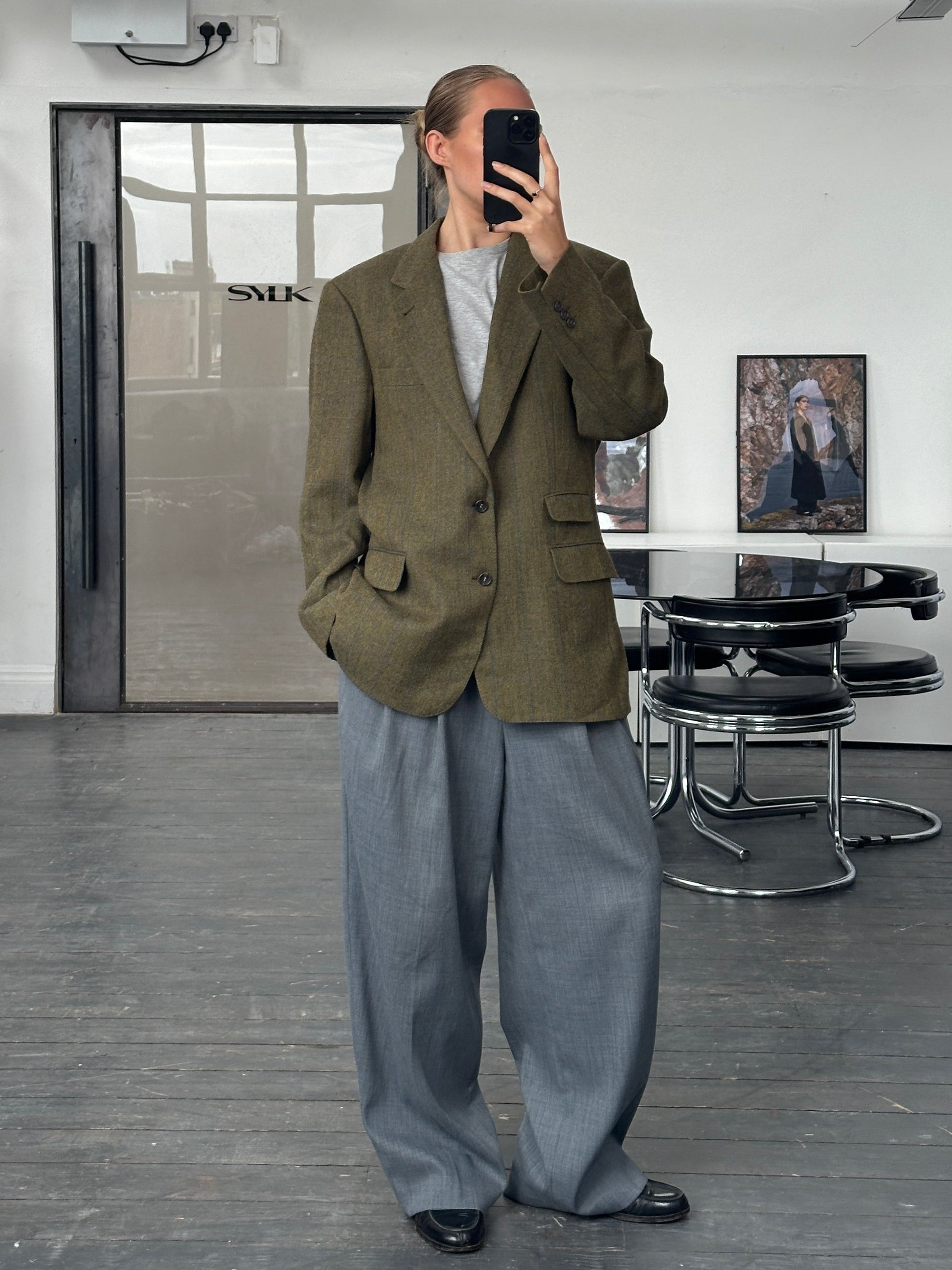 Burberrys 1980s alpaca wool blazer in heritage tweed with blue overcheck, featuring a structured British silhouette and signature monogram EKD lining. Made in Germany.