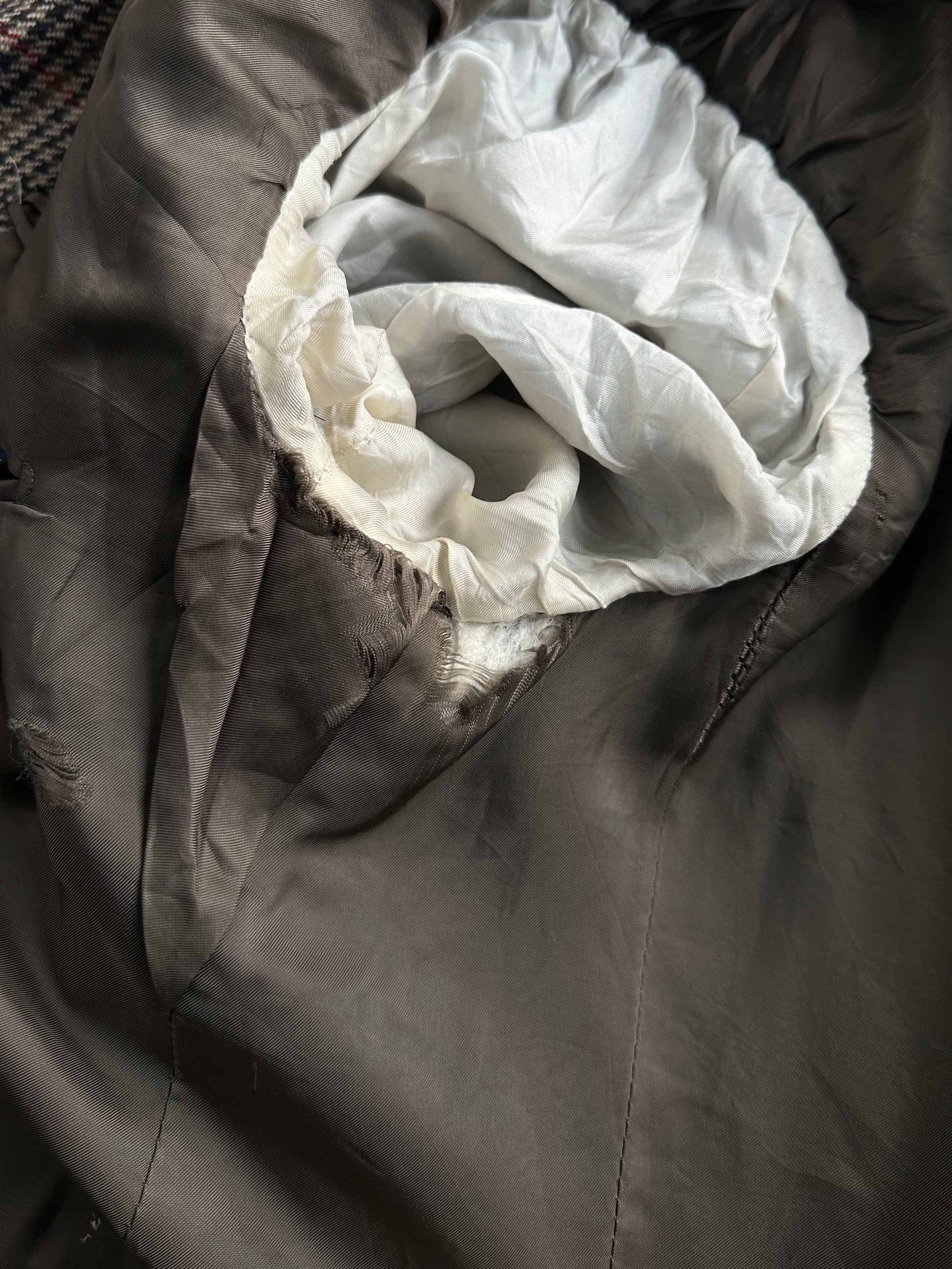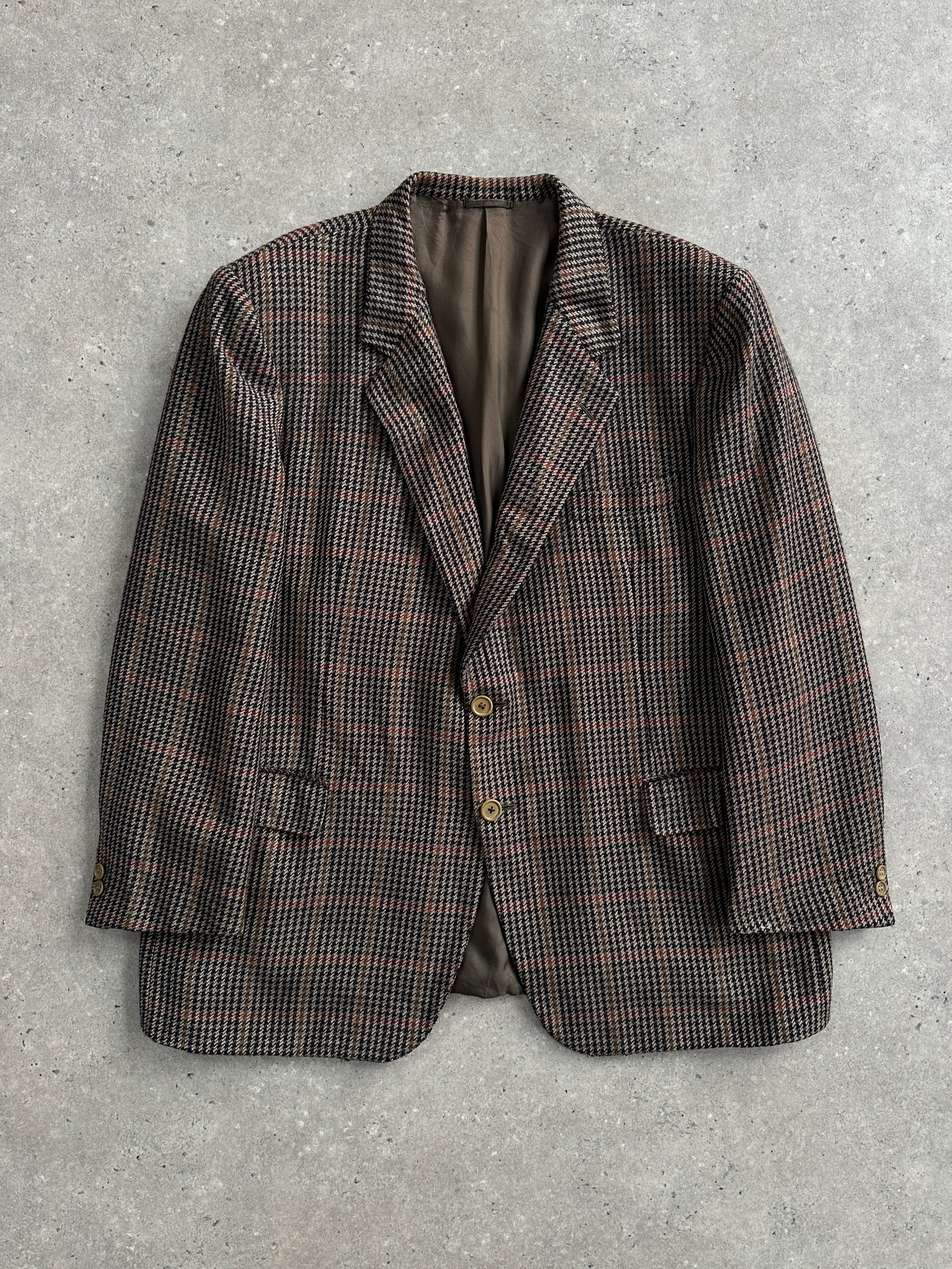 Vintage Burberrys of London 1990s wool and cashmere blazer featuring a rich multi-tone check pattern in warm brown and neutral hues. Classic single-breasted design with light shoulder structure and full lining for a refined tailored finish.