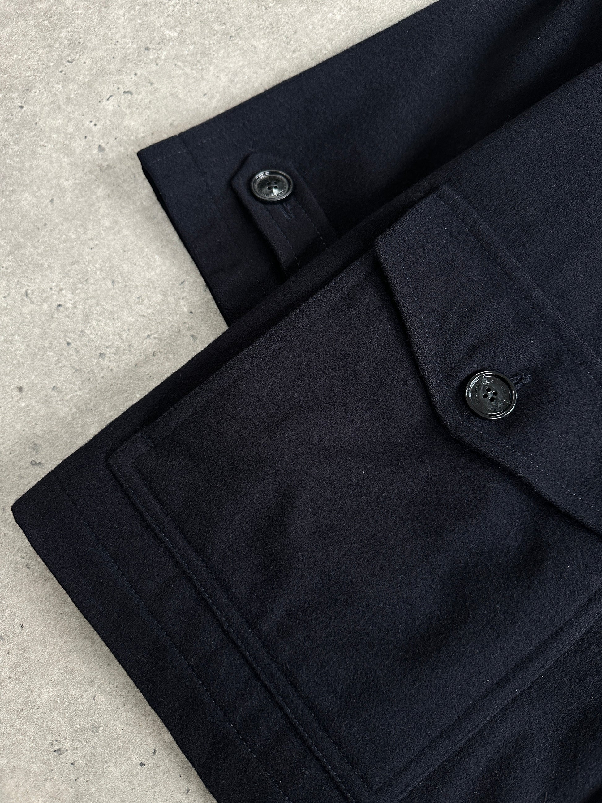 Vintage Burberry London coat in navy wool with a softly structured silhouette and subtle padding for warmth. Features engraved buttons, zip and button closure, and the signature Burberry Equestrian Knight embroidery on the pocket.