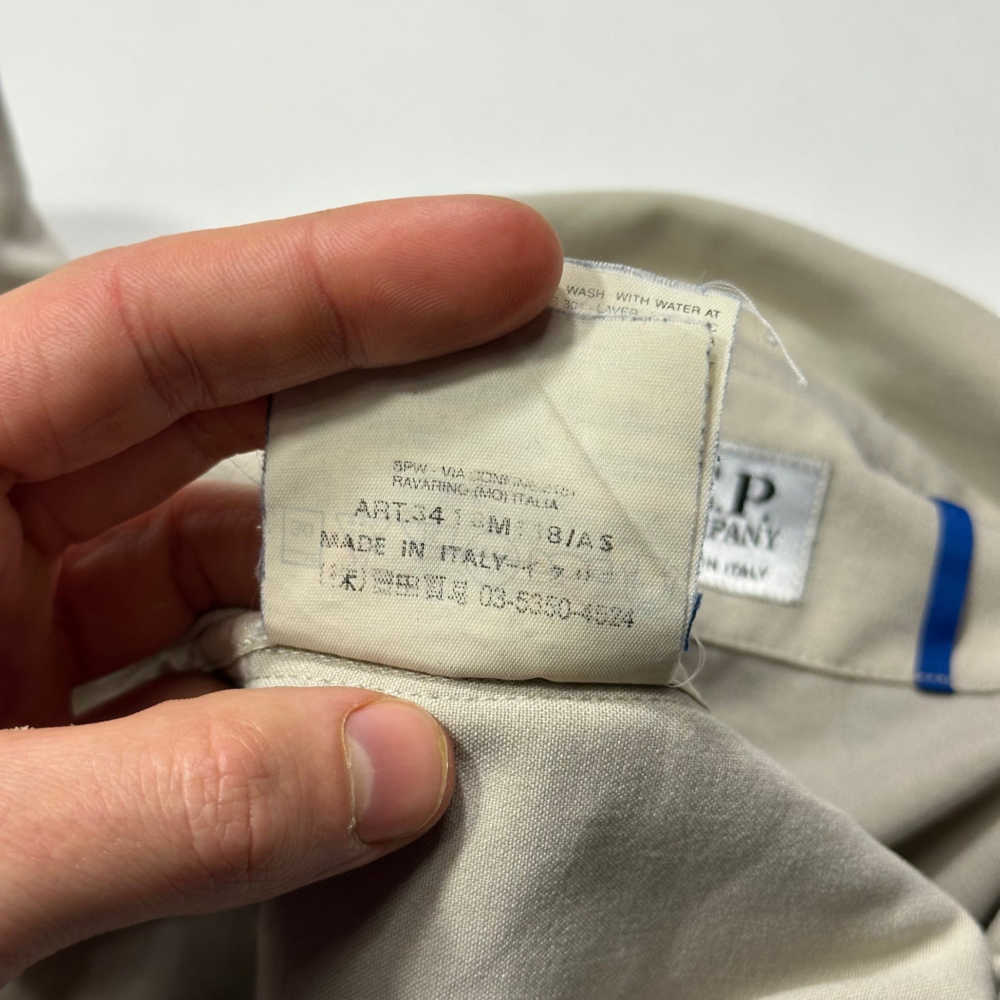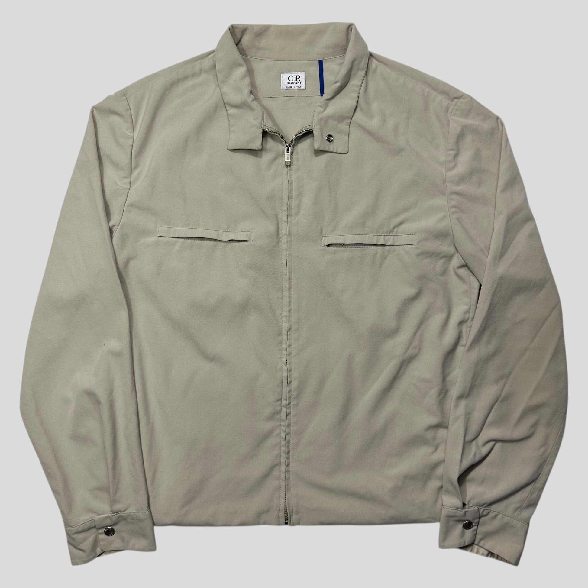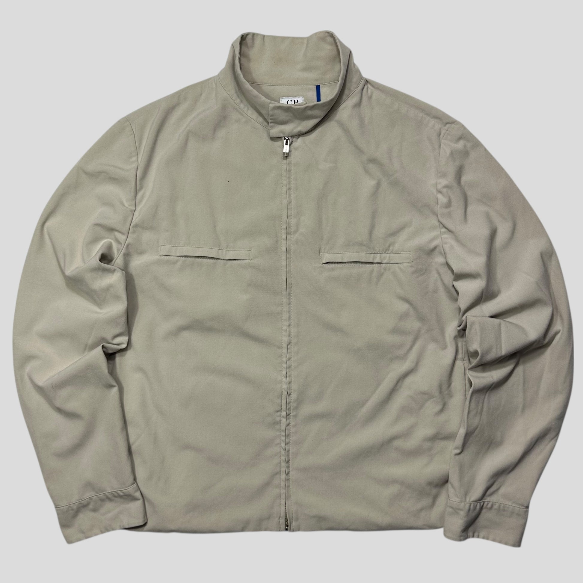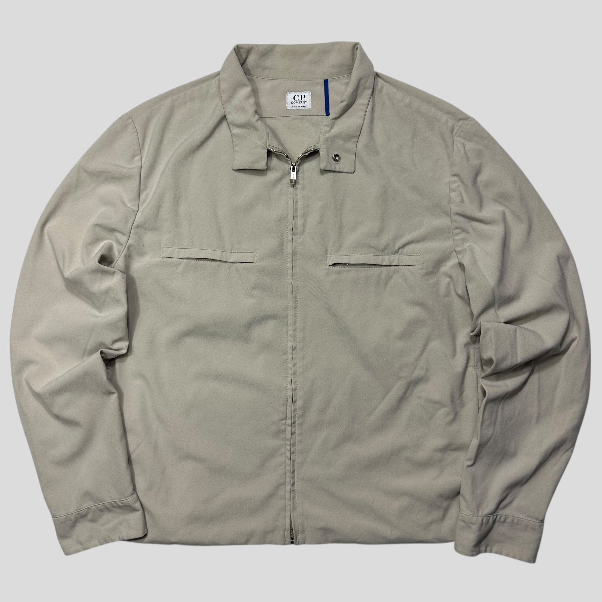 Rare cp company spring summer 2001 lightweight polyester and viscose stone / light grey beige blend work jacket, beautifully boxy cropped fit, with multipocket zips to chest and hand pockets to front, button flap closure neck, made in Italy, CP metal branded hardwear.