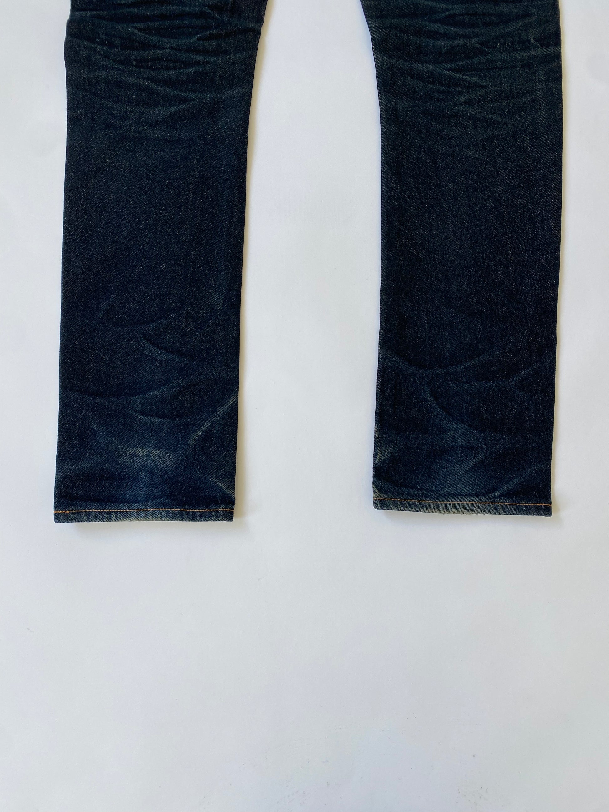 Evisu Daicock Jeans in Blue and Black. Straight leg dark blue jeans, with evisu logo printed on back pockets in black. Some signs of wear and fading due to age.