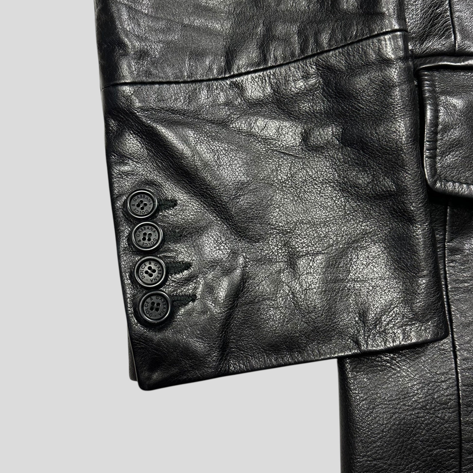 Very rare early 2000’s Dolce & Gabbana Full Black Leather long overcoat matrix style jacket, logo embossed buttons throughout, beautiful quality, made in Italy, soft monogram lining.