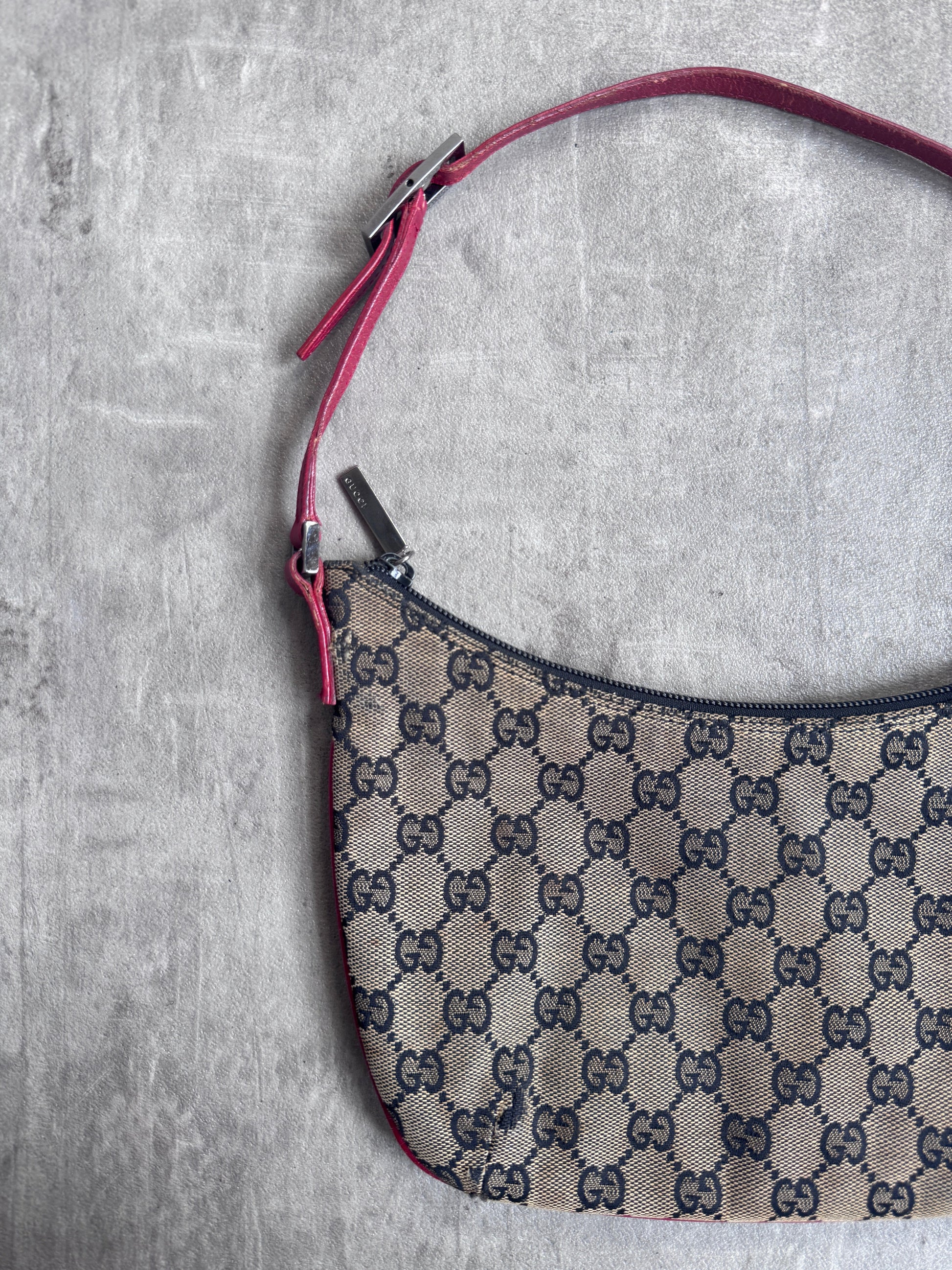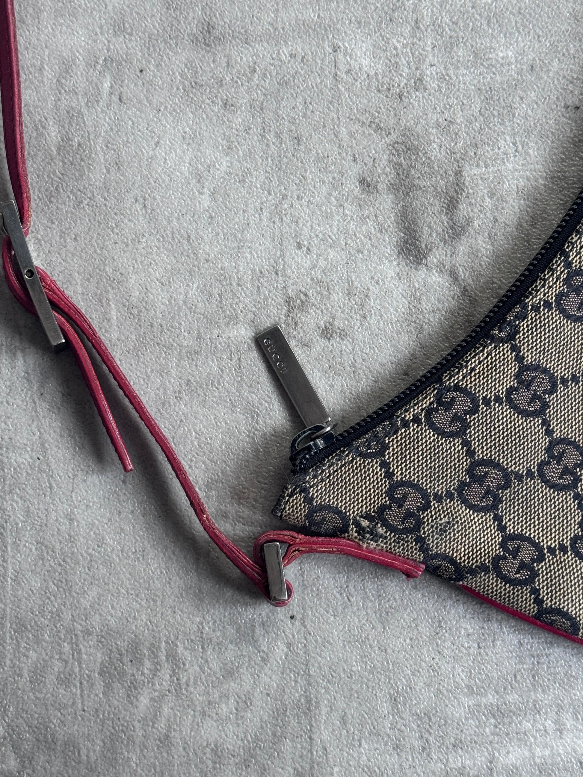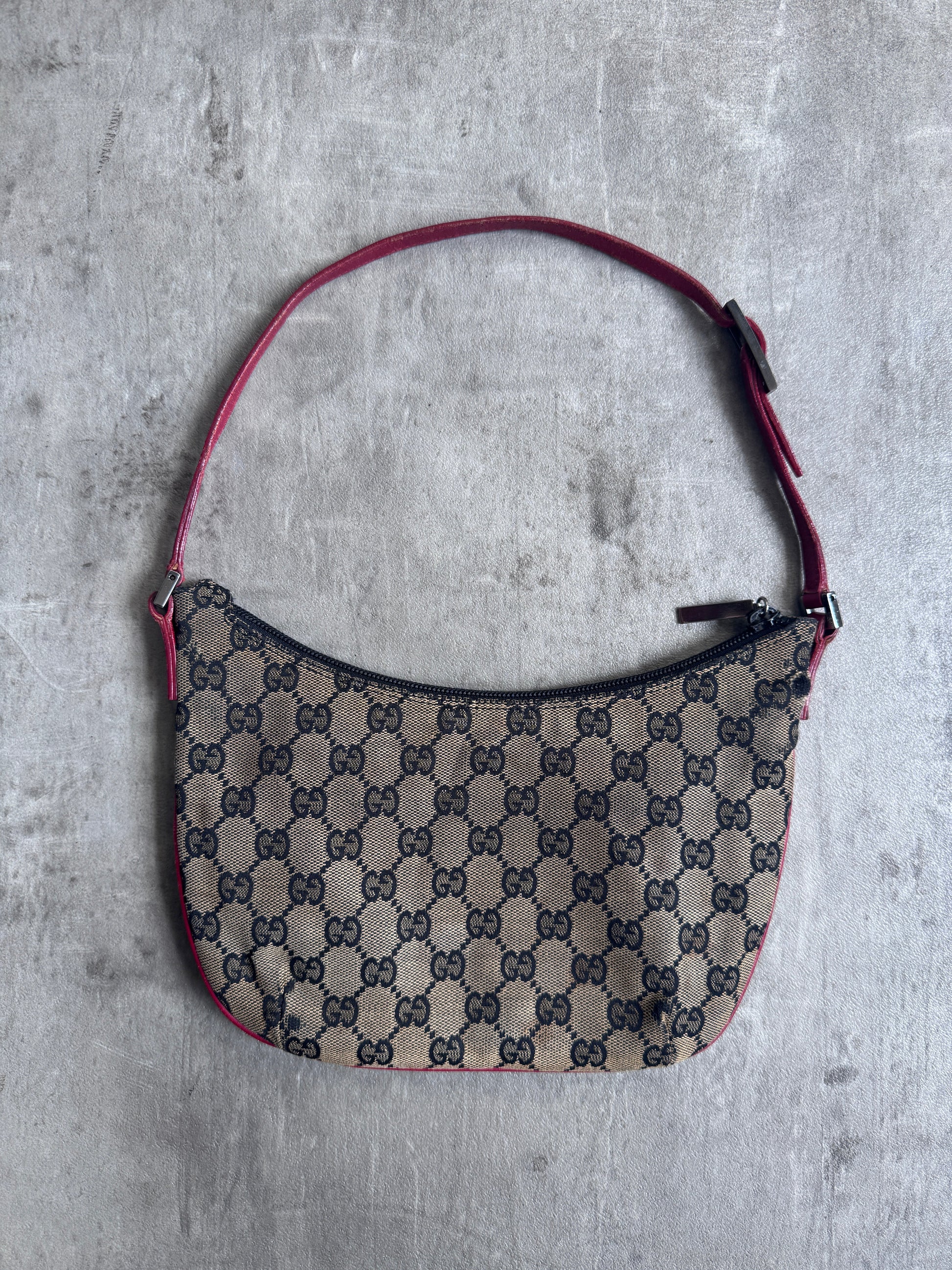 An iconic Gucci GG Red Leather Canvas Shoulder Bag, blending the house’s signature monogram design with bold red leather accents. Crafted in classic GG Supreme canvas, the piece is trimmed with rich red leather along the edges and strap, giving a vibrant contrast to the neutral monogram base. Designed in a minimal crescent silhouette, this shoulder bag embodies the effortless elegance and practicality Gucci is known for — perfect for day-to-night wear. The zip-top closure secures your essentials, while the adjustable red leather strap ensures a comfortable and versatile fit.