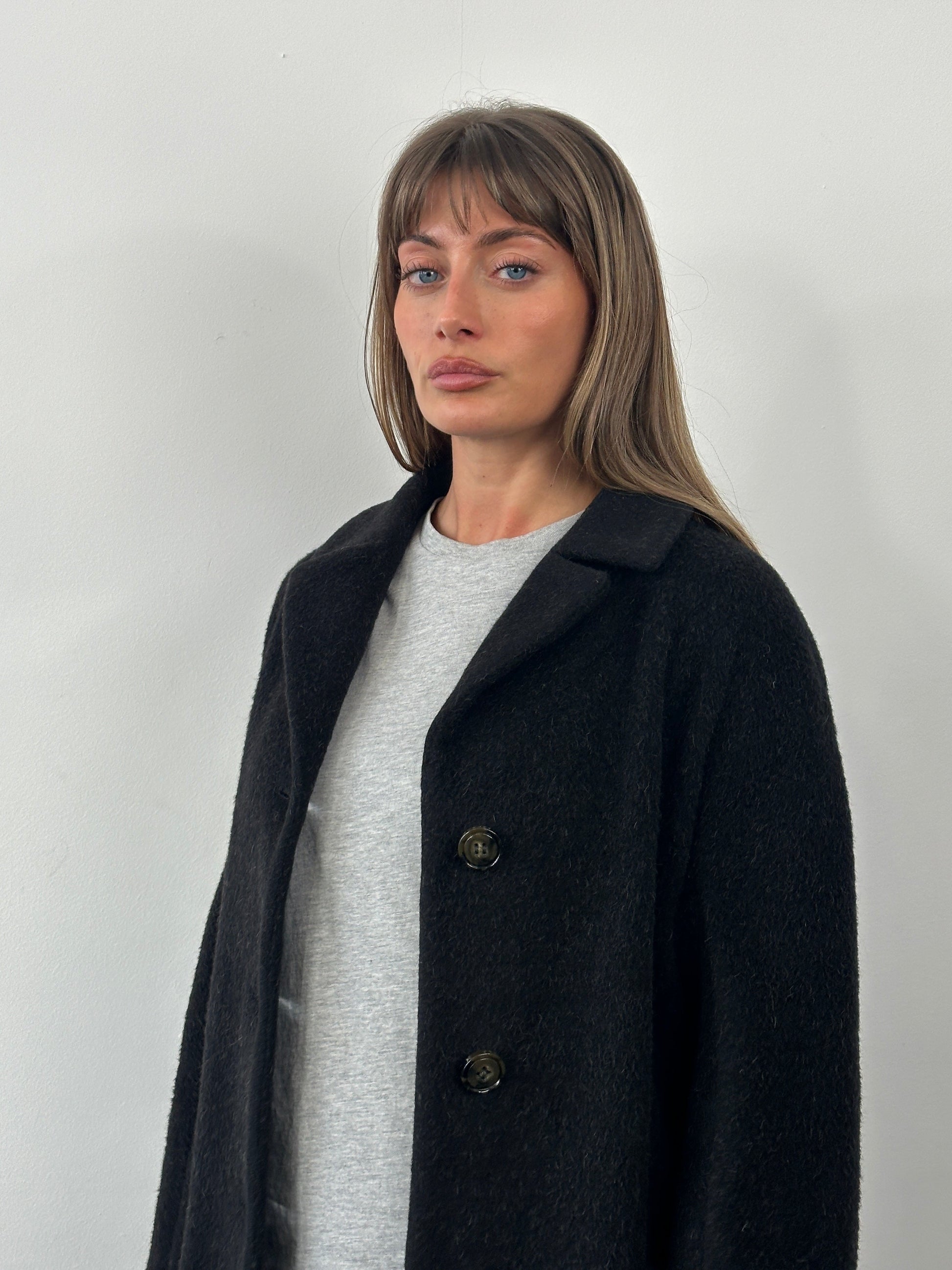 Vintage Max Mara Weekend single breasted coat with a softly structured silhouette and a textured wool mohair blend. Designed with a clean front, relaxed shoulder line, and practical patch pockets, finished in a charcoal grey tone typical of refined outerwear from the 1990s.