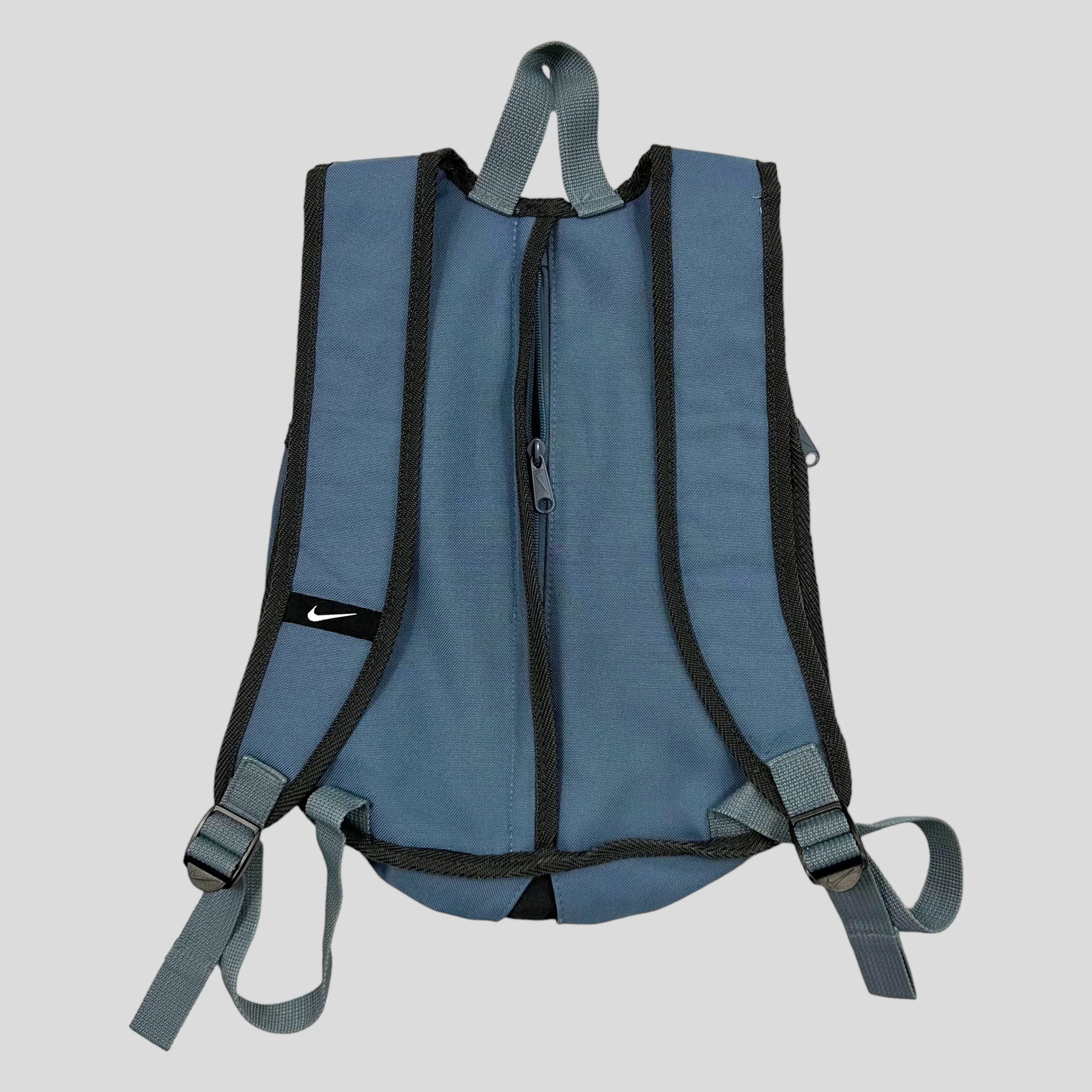 Unique Spring Summer 2000 Nike Backpack, blue and deep grey panelling with blue Nike swoosh to front and back, interesting pocket designs with 2 large zip compartments.