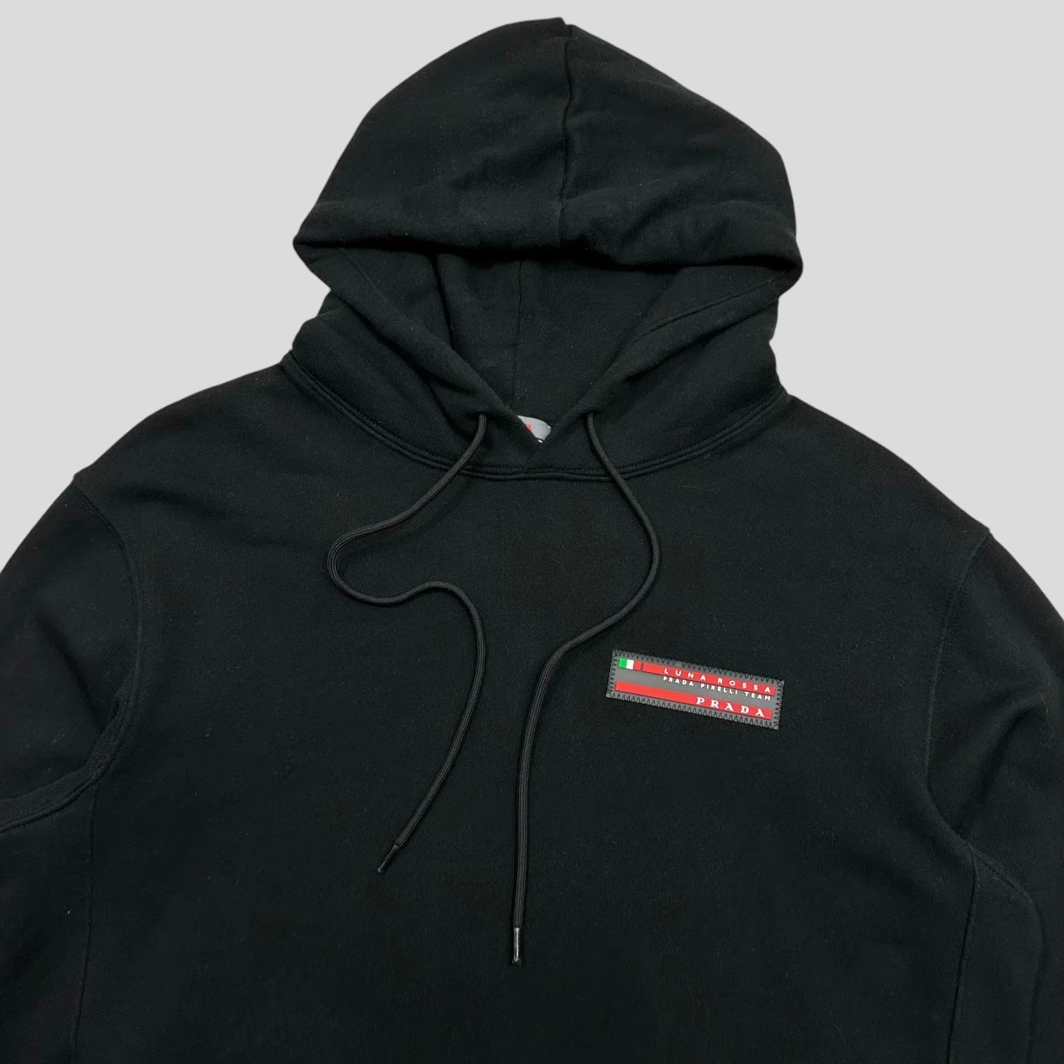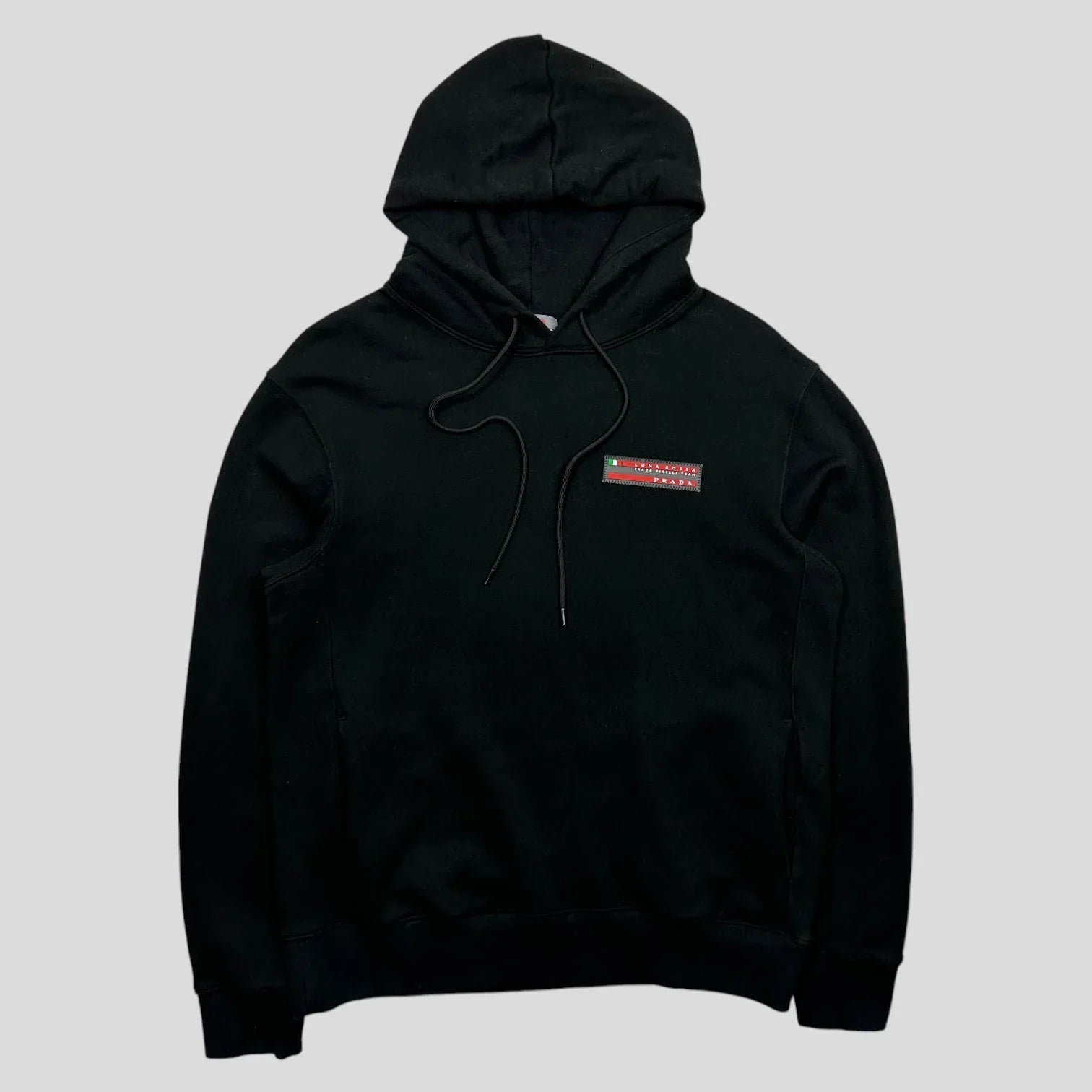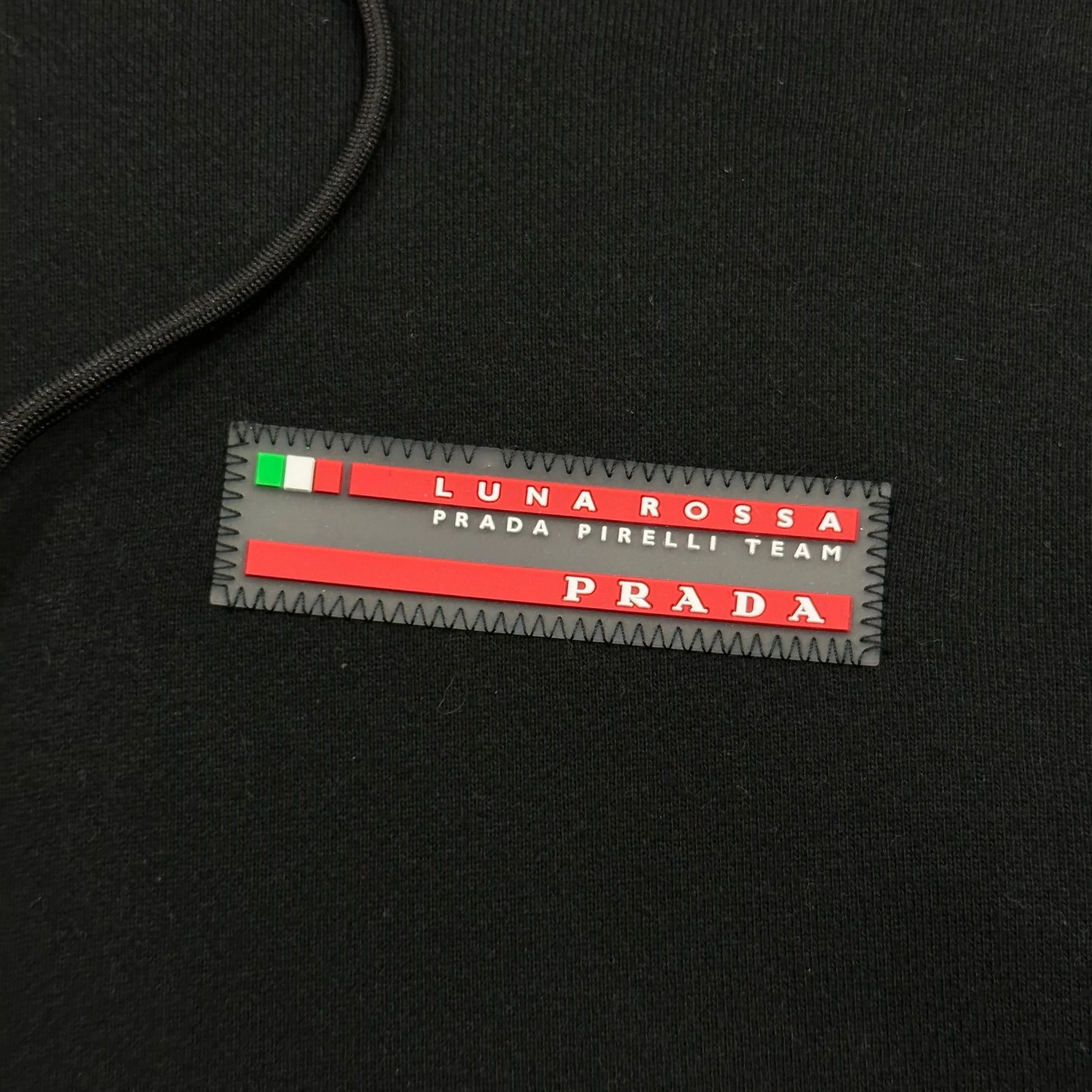 Very rare 2020 Luna Rossa Pirelli black cotton hoodie, embroidered rubber logo to chest, nylon lined hand pockets at each side, drawstrings to adjust hood, elasticated cuff and hem.