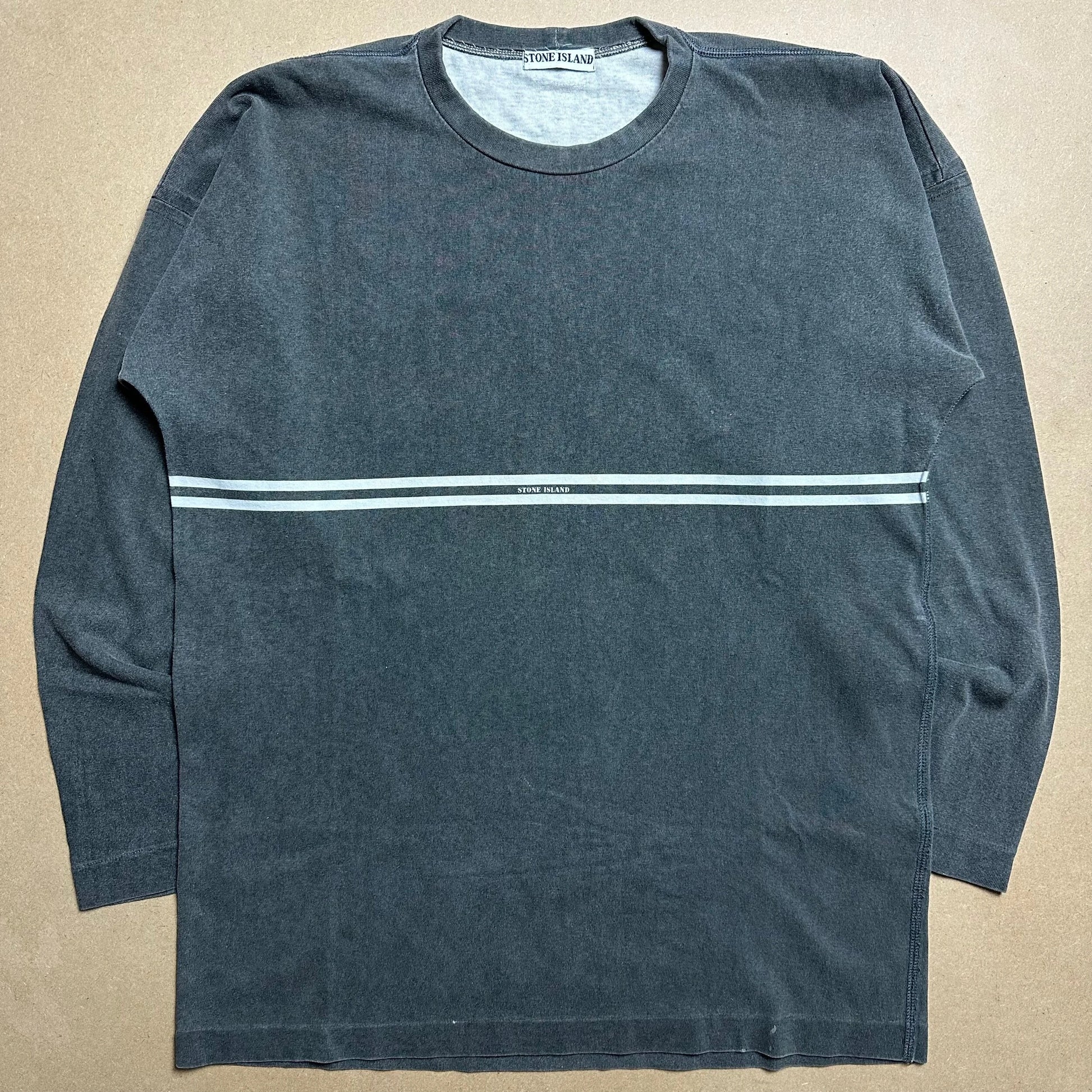 Designed by Massimo Osti. Made in Italy exclusively for the Japanese market. Cotton rich fabric with a soft touch. Central marina striping around the body of the piece with a mini stencil spell out. Classic crew neck with modular construction and amazing stitching details throughout.