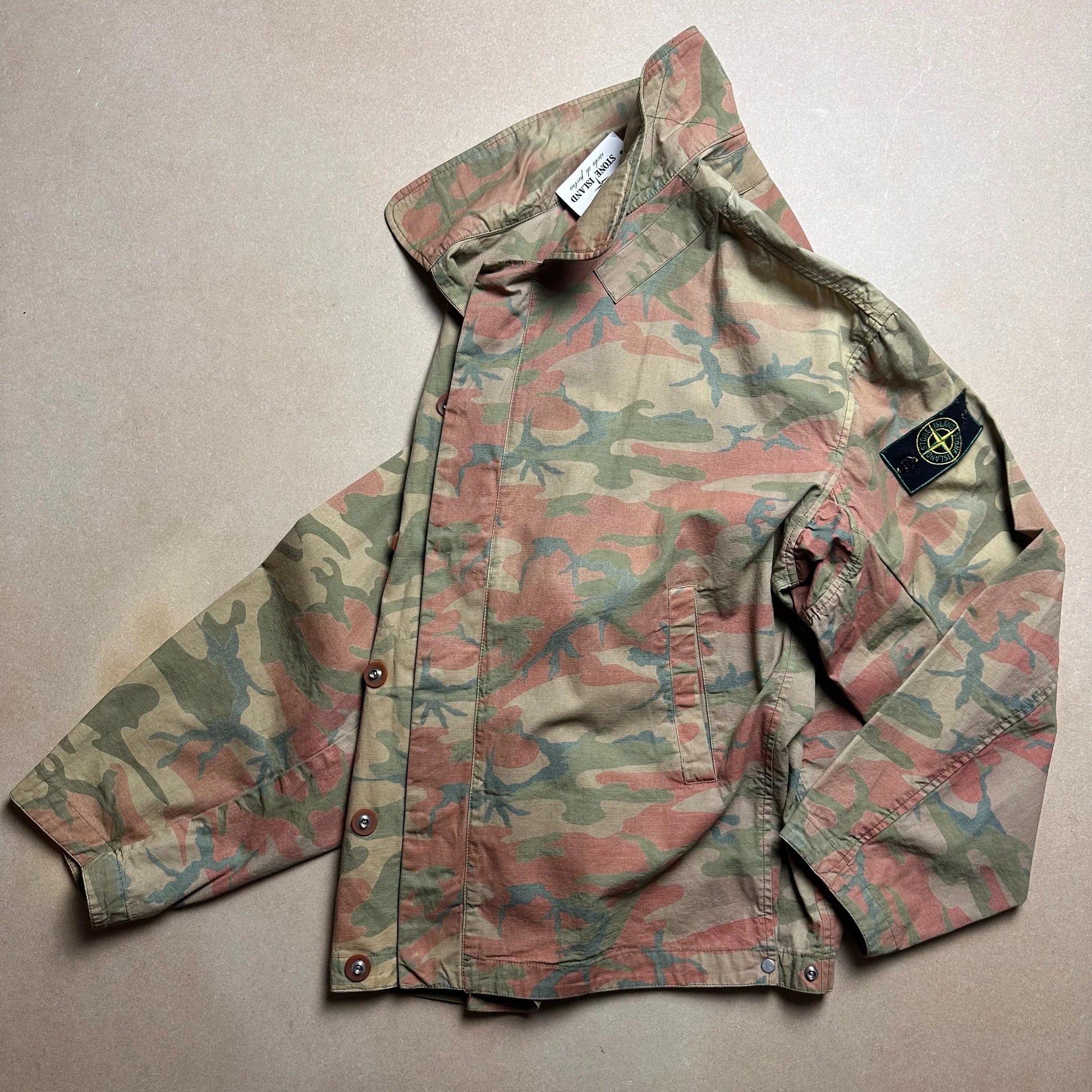 Designed by Massimo Osti. One of Stone Islands most iconic fabric innovations, ice camouflage constructed in a bomber jacket style. Featuring a dual track press stud closure and adjustable hem. Wide spread collar and slash pockets. Complete in an Oak and Tiger Orange colour way with functional colour change.