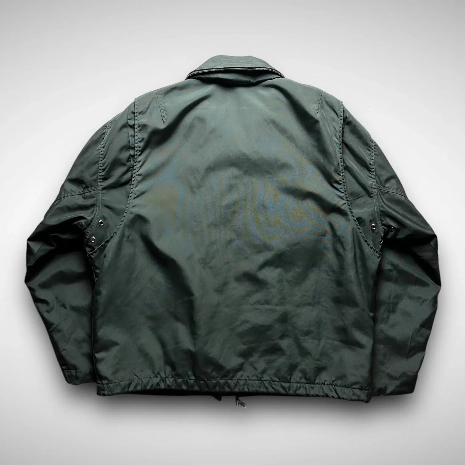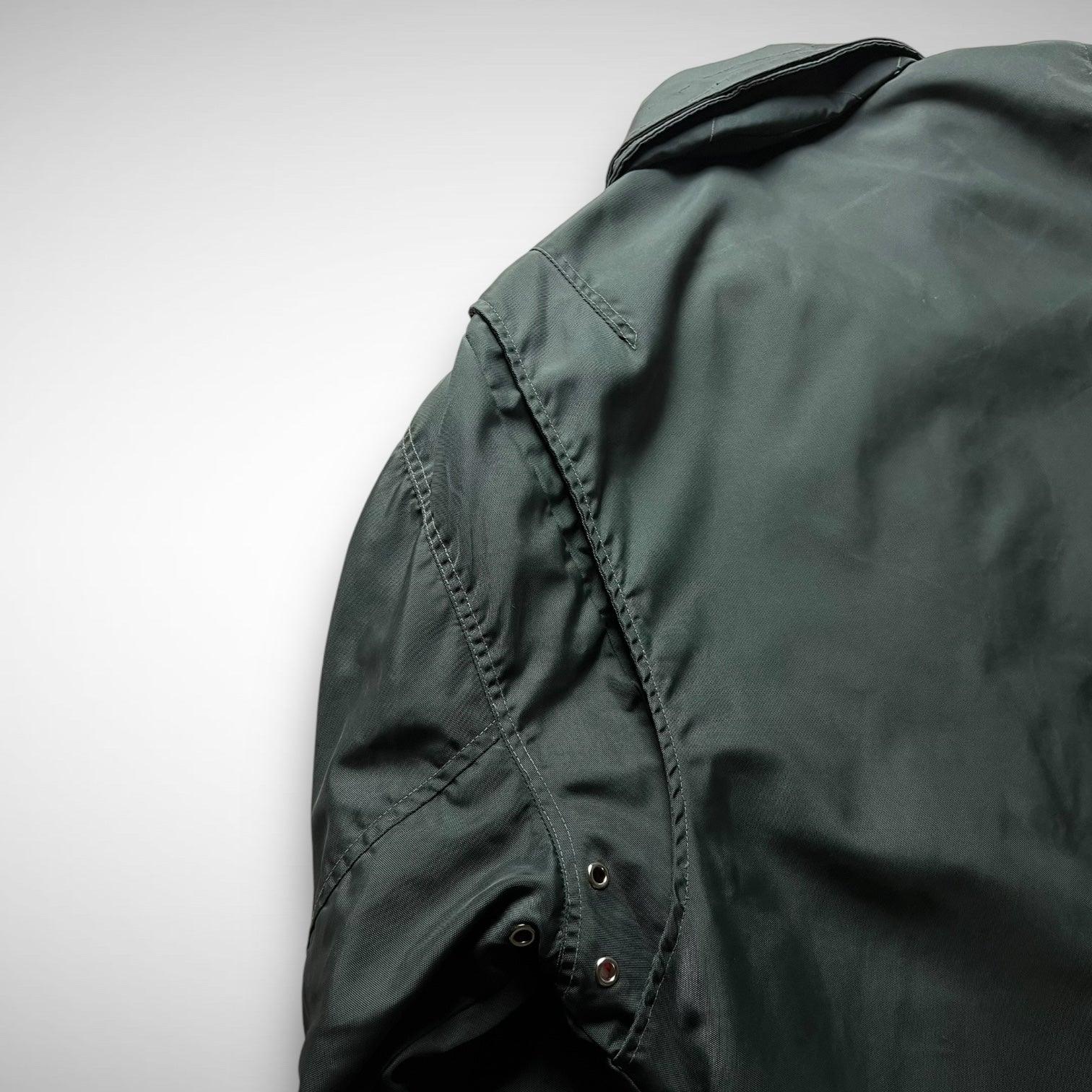 This rare Sabotage outerwear piece is a functional and visually striking jacket, likely from the late 1980s or early 1990s. Crafted from a shimmering nylon that shifts subtly between green, grey, and hints of blue depending on the light, the jacket blends utilitarian design with bold contrasts — most notably the bright solar orange quilted lining.