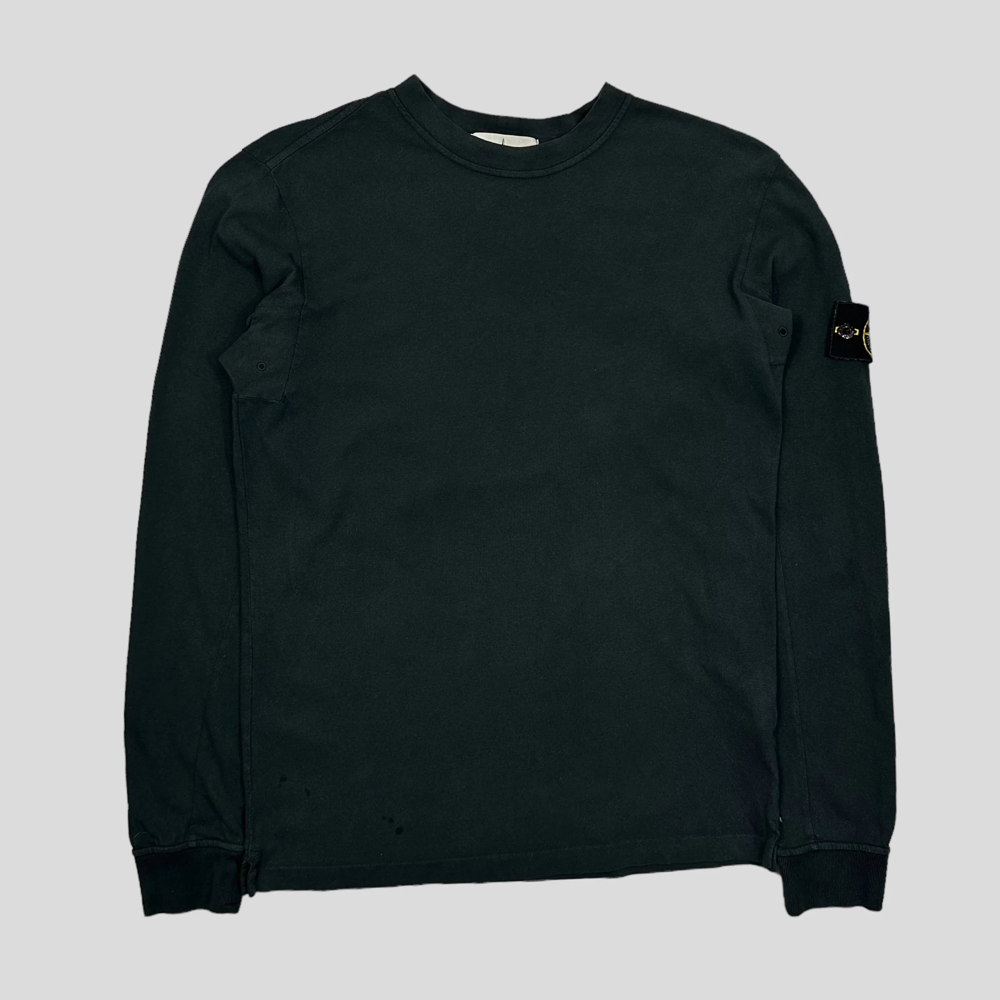 Stone Island longsleeve t-shirt crewneck, nice lighter alternative to a sweatshirt class for summer has ventilated rivets under arms aswell, navy / washed black colourway.