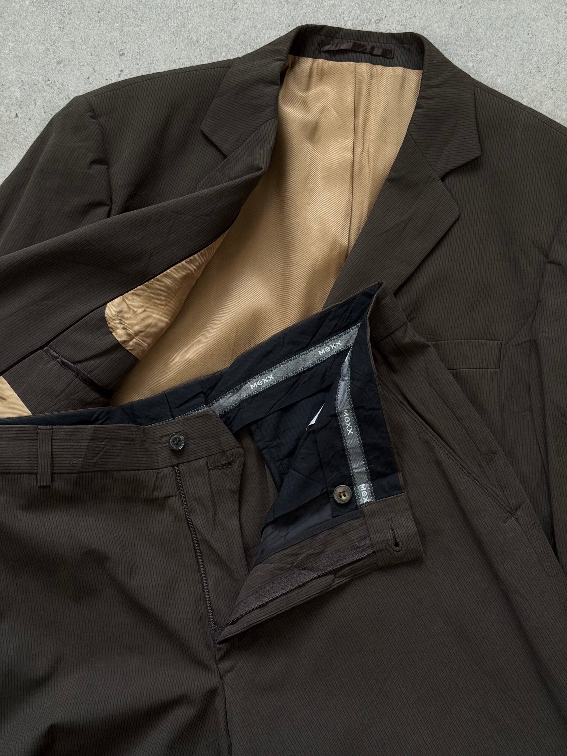 Vintage 1990s Mexx two piece suit in muted green with a subtle tonal stripe, cut in a clean single breasted silhouette. The cotton blend fabric has a structured mid weight feel with straight leg trousers for a classic tailored profile.