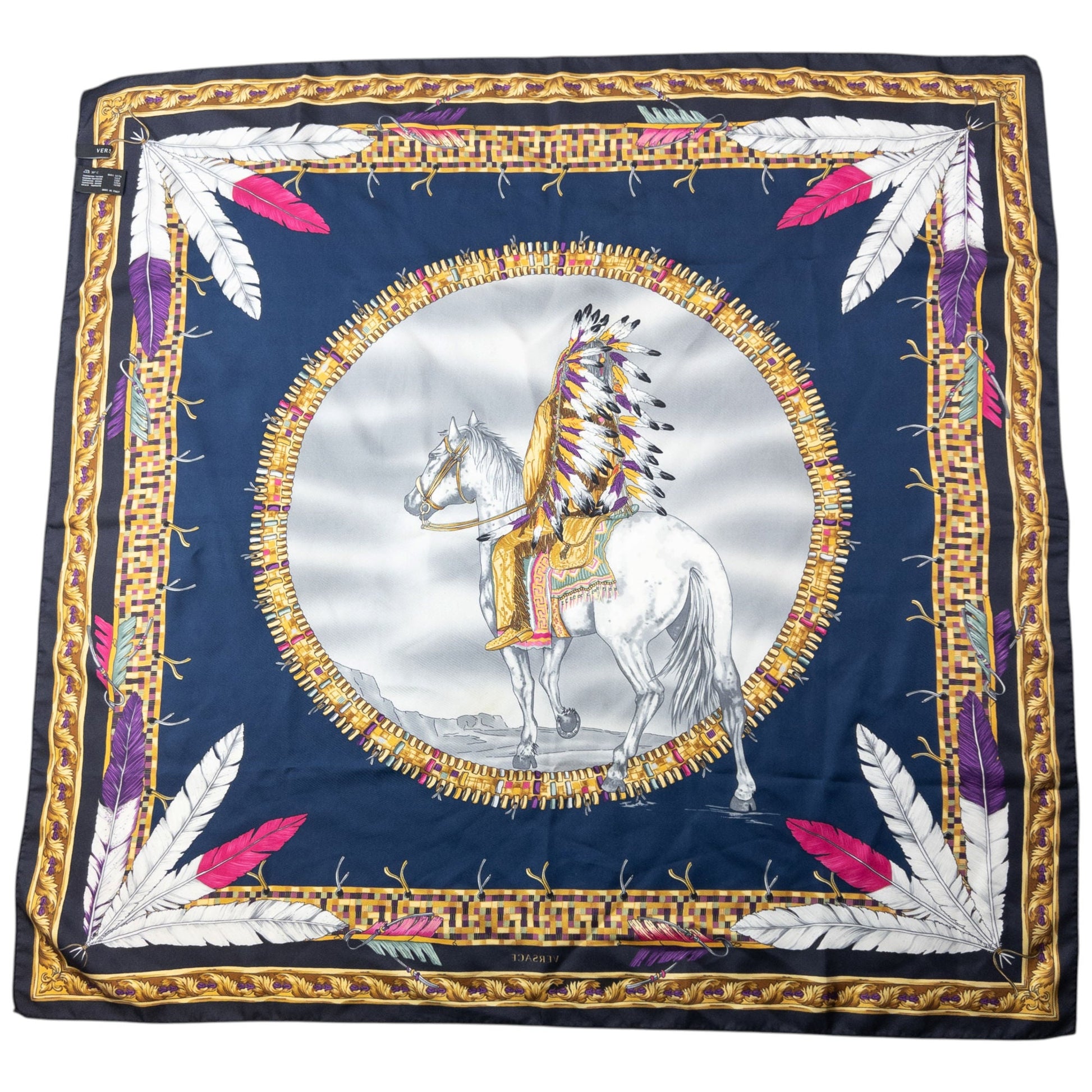Versace Native American Print Silk Scarf | O/S, Navy Blue, Gold, Red, White, Yellow