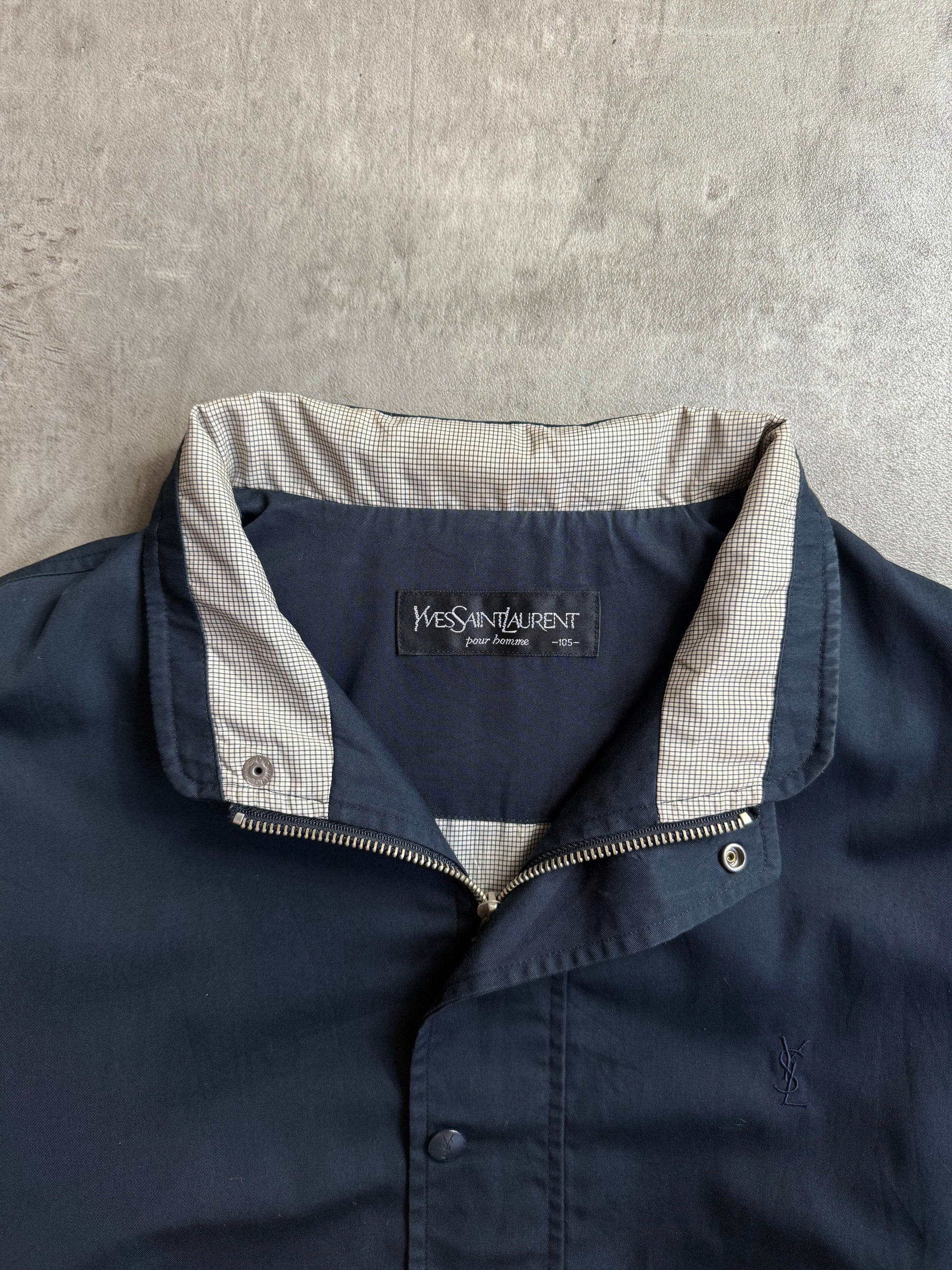 YSL Navy Plaid Collar Cinched Waist Bomber Jacket