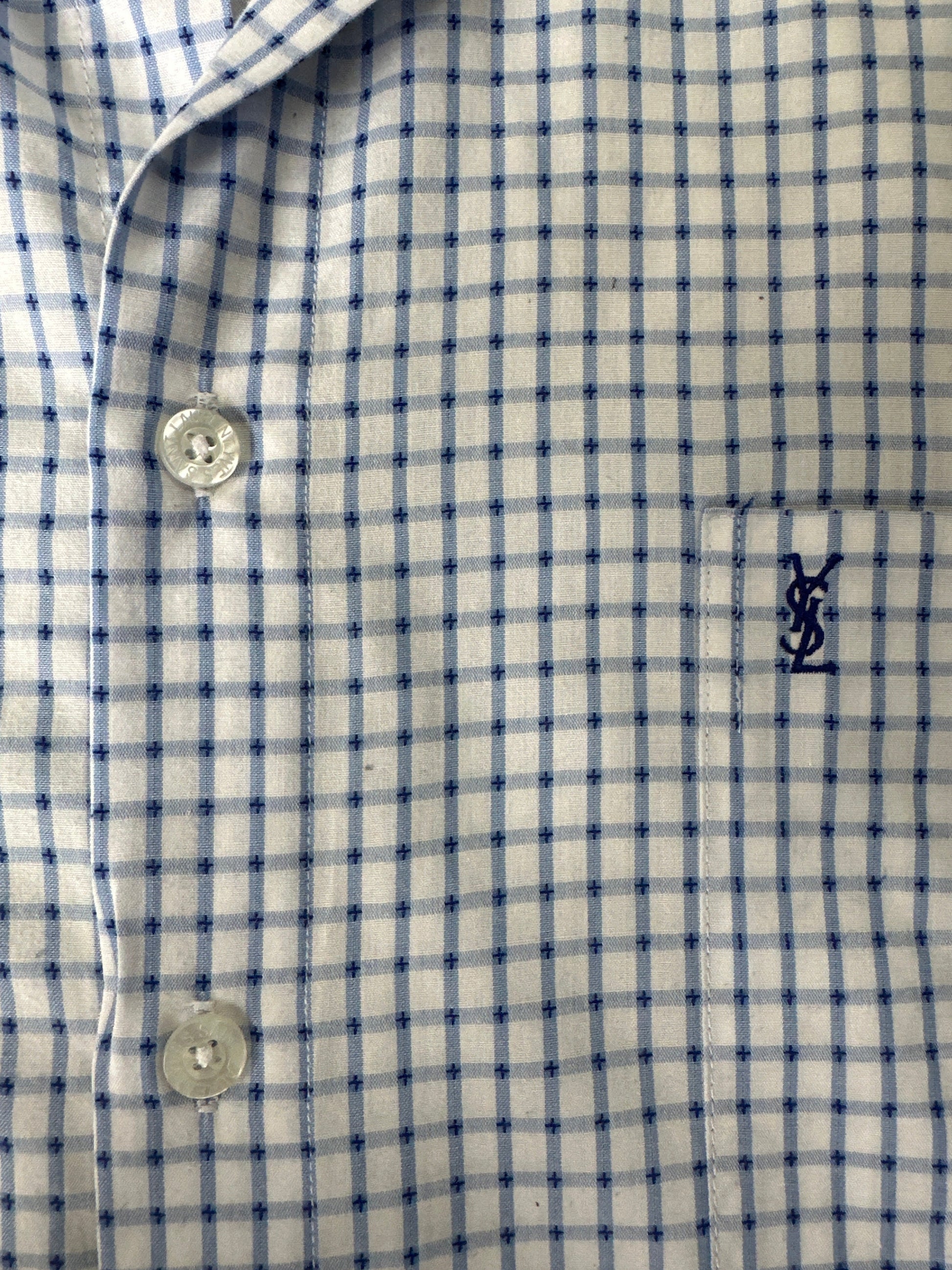 A YSL pour homme check shirt in a cotton grid pattern. Relaxed short sleeve cut with chest pocket and YSL logo embroidery.