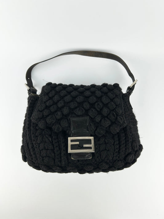 Vintage Fendi Black Crochet Bobble Knit Mamma Baguette Shoulder Bag