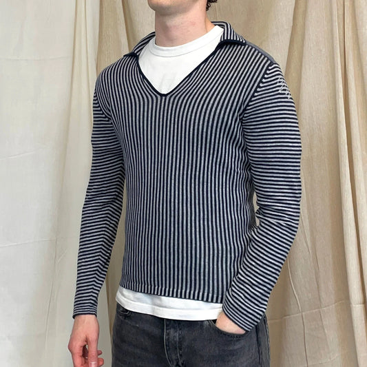Armani Jeans Grey & Navy Striped Cotton Knit Collared Jumper