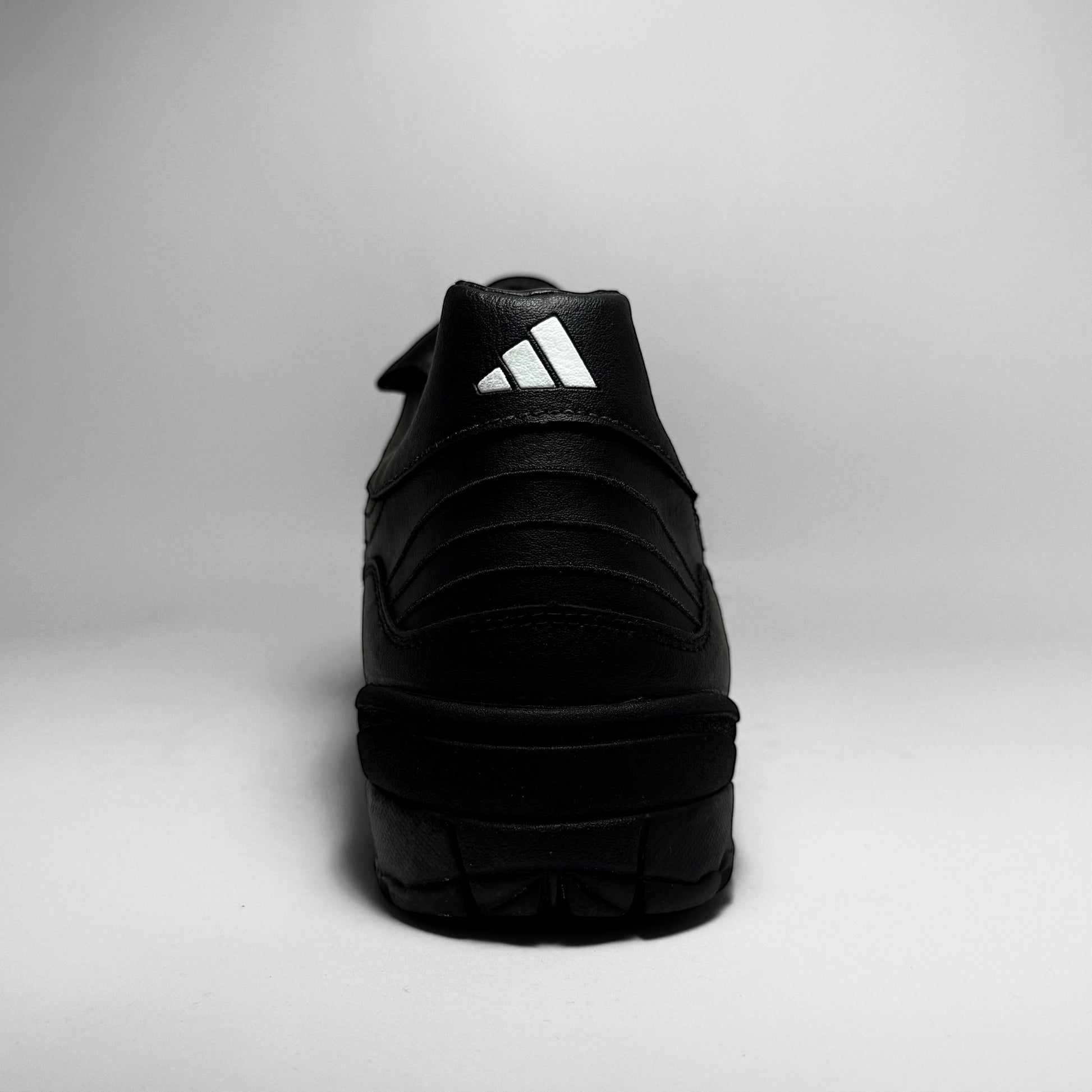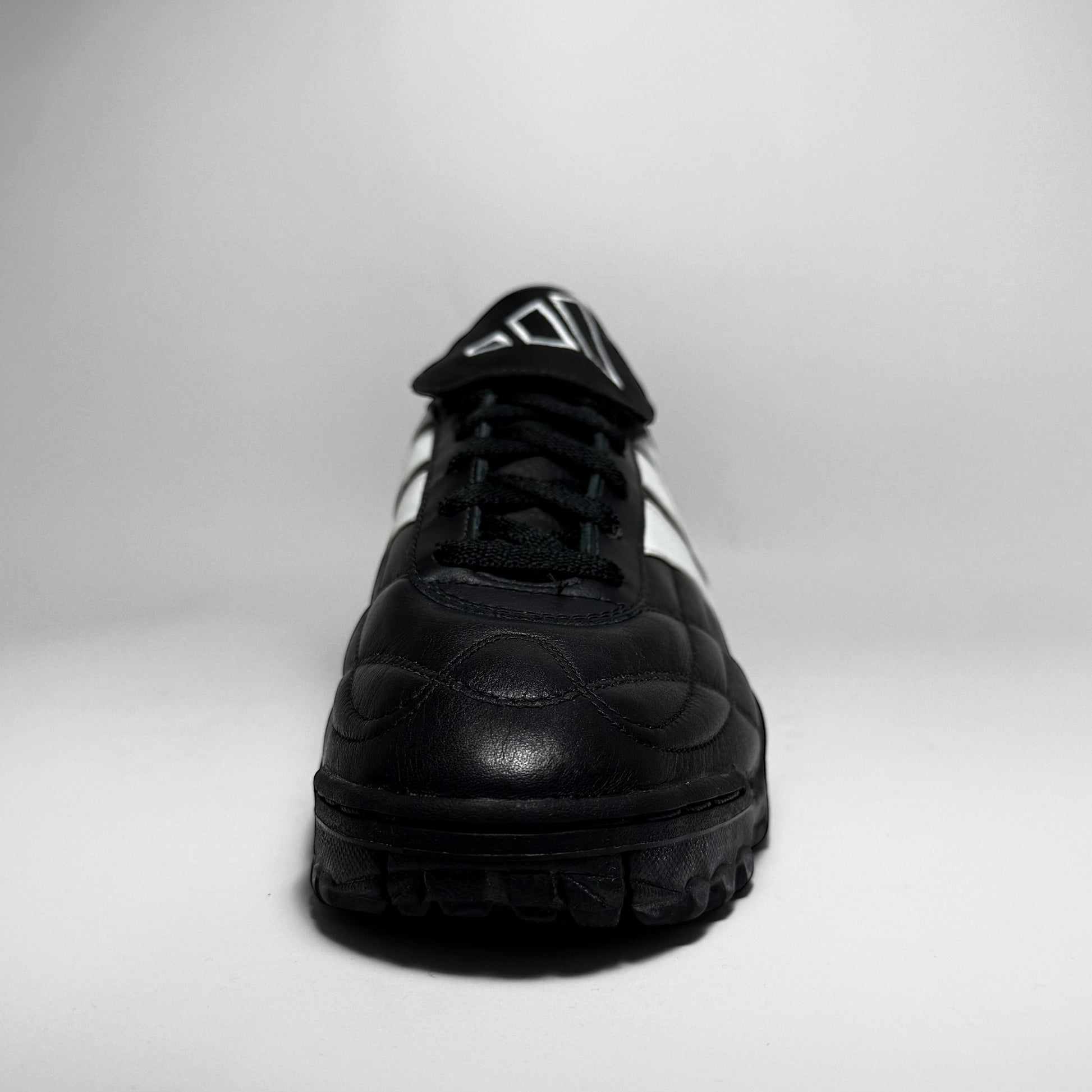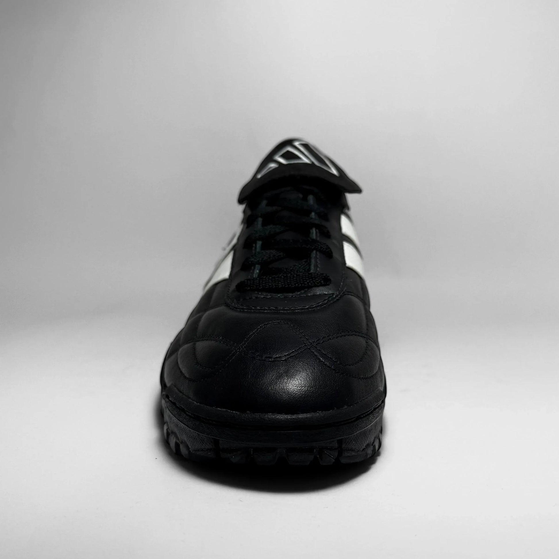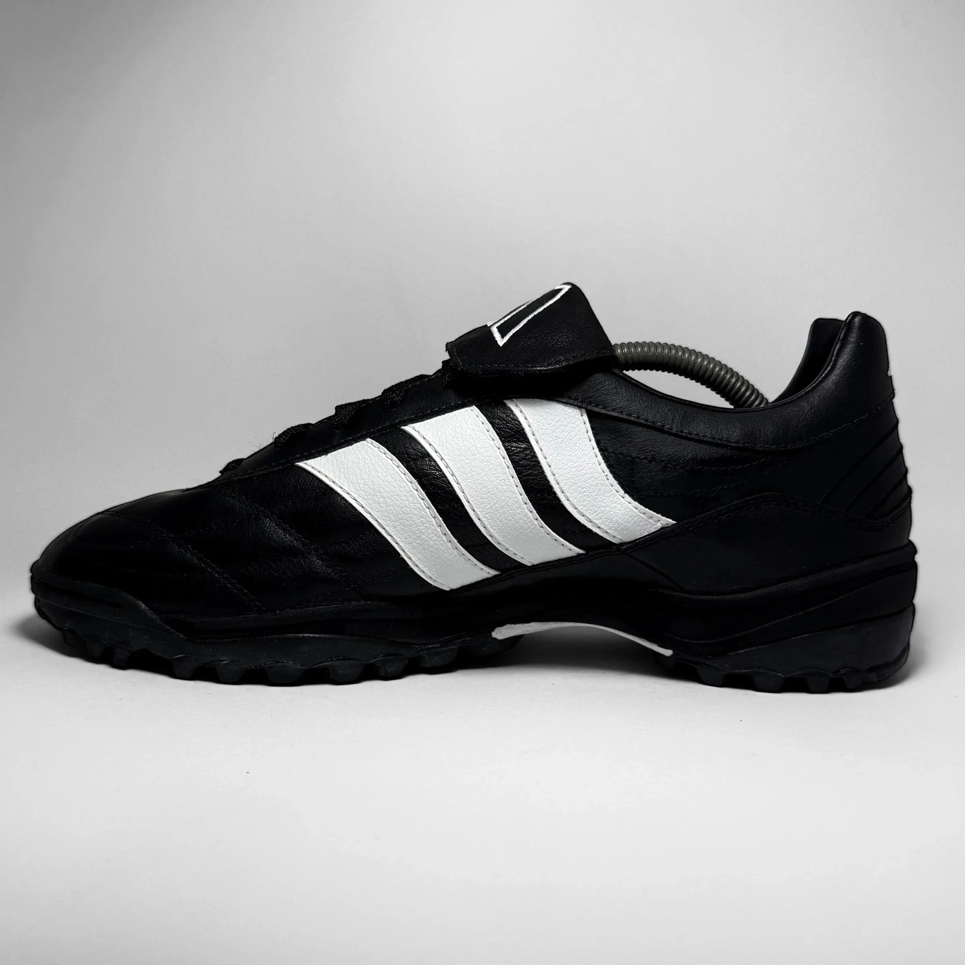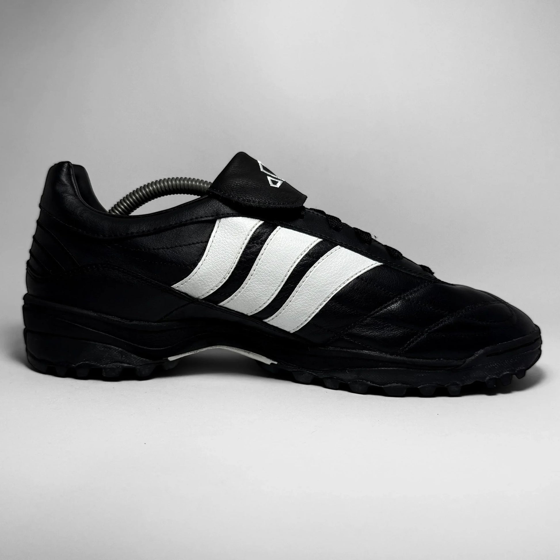 The Adidas Assalto TF from 1999 is a classic turf football shoe, designed for performance and durability. Featuring a sleek black leather upper with iconic white Three Stripes, it includes a fold-over tongue with geometric branding and a lugged rubber outsole for enhanced grip on artificial surfaces. A functional and nostalgic silhouette, it embodies late-’90s football aesthetics with timeless Adidas design cues.