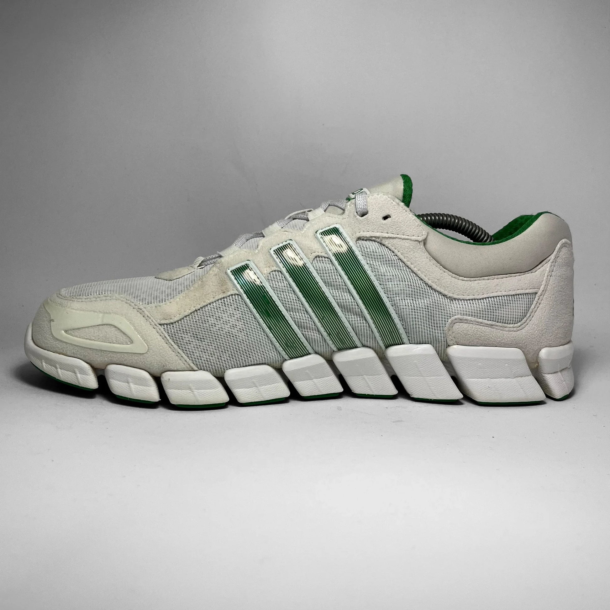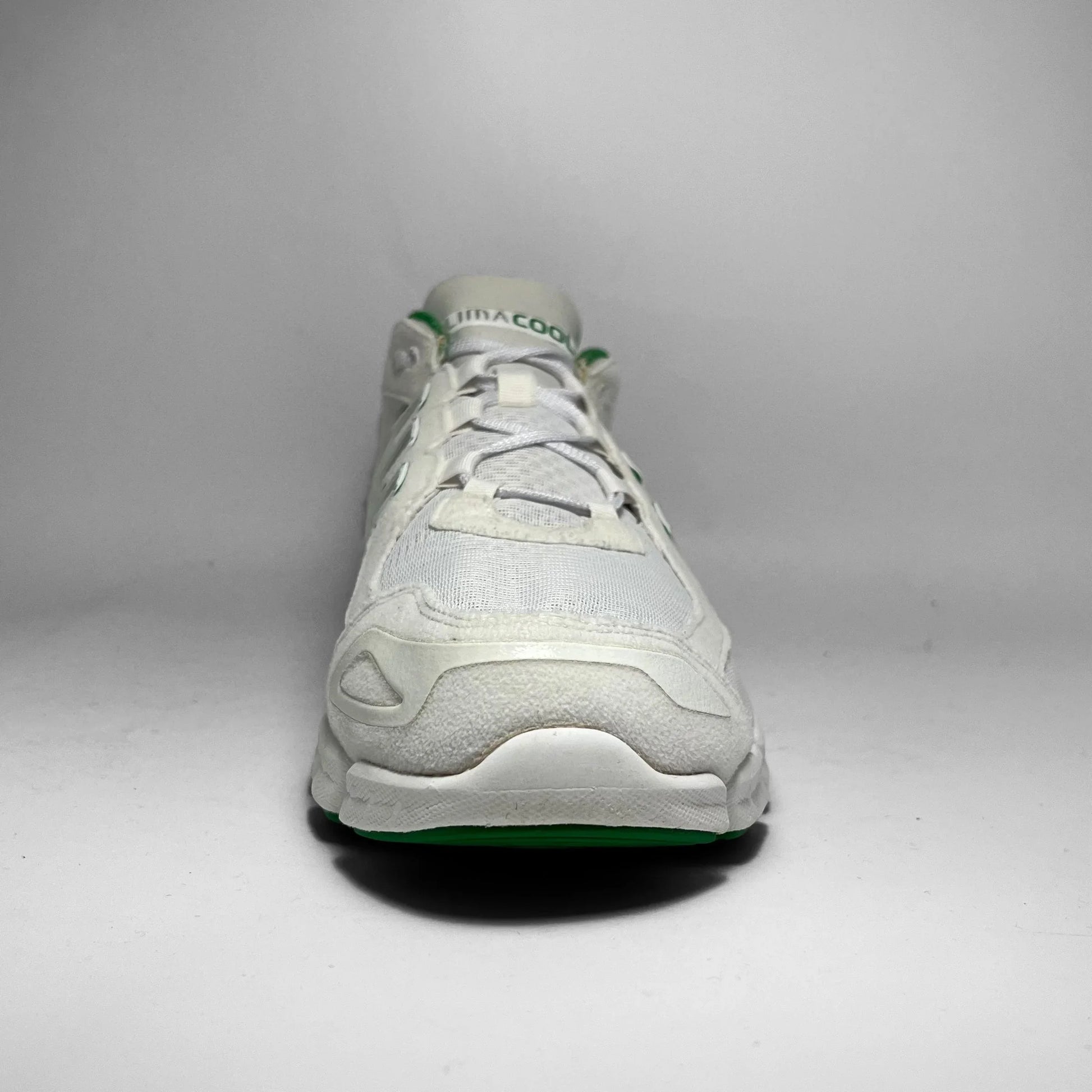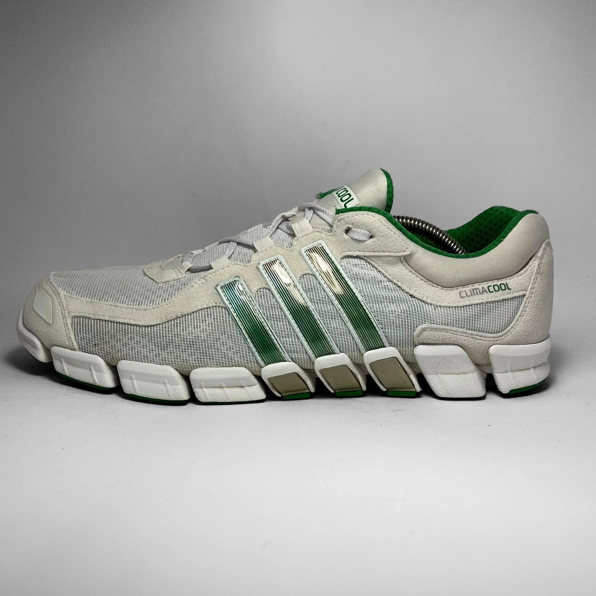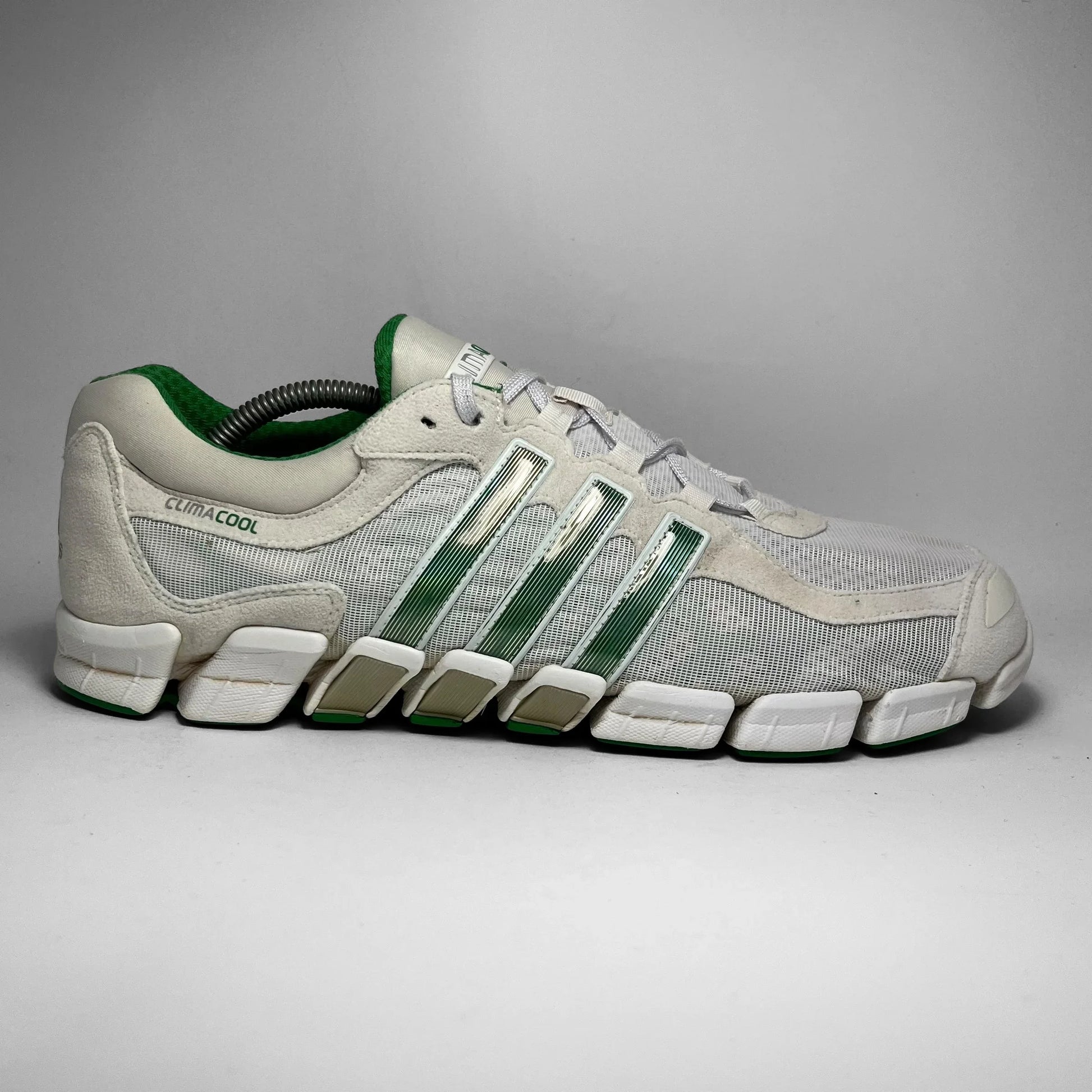 Released in 2011, this Adidas Climacool features a breathable white mesh upper with suede overlays, metallic green three-stripe detailing, and a segmented white and green midsole designed for maximum flexibility and airflow, completed with a green-lined interior and durable rubber outsole.