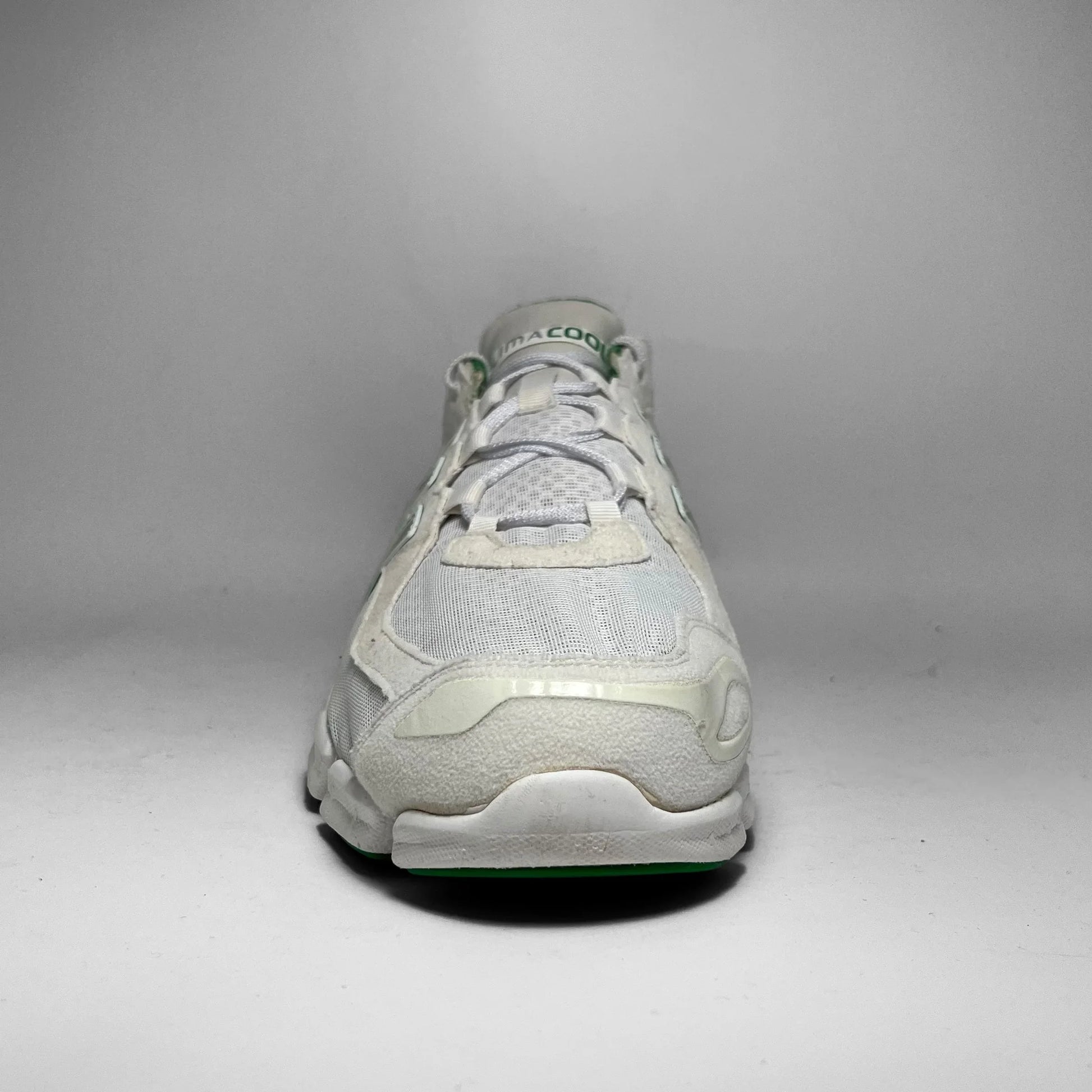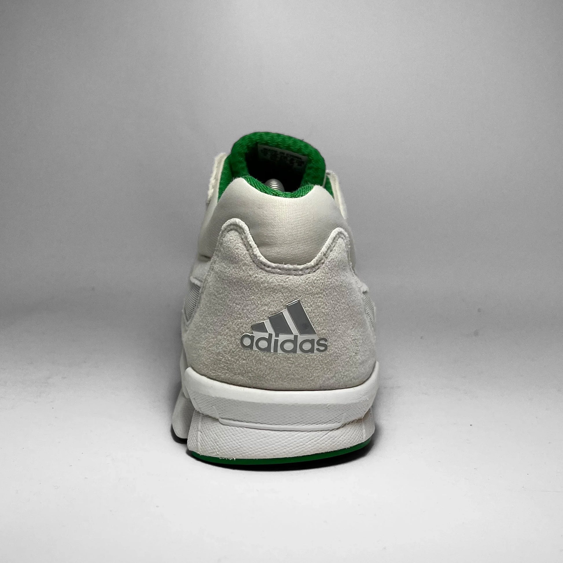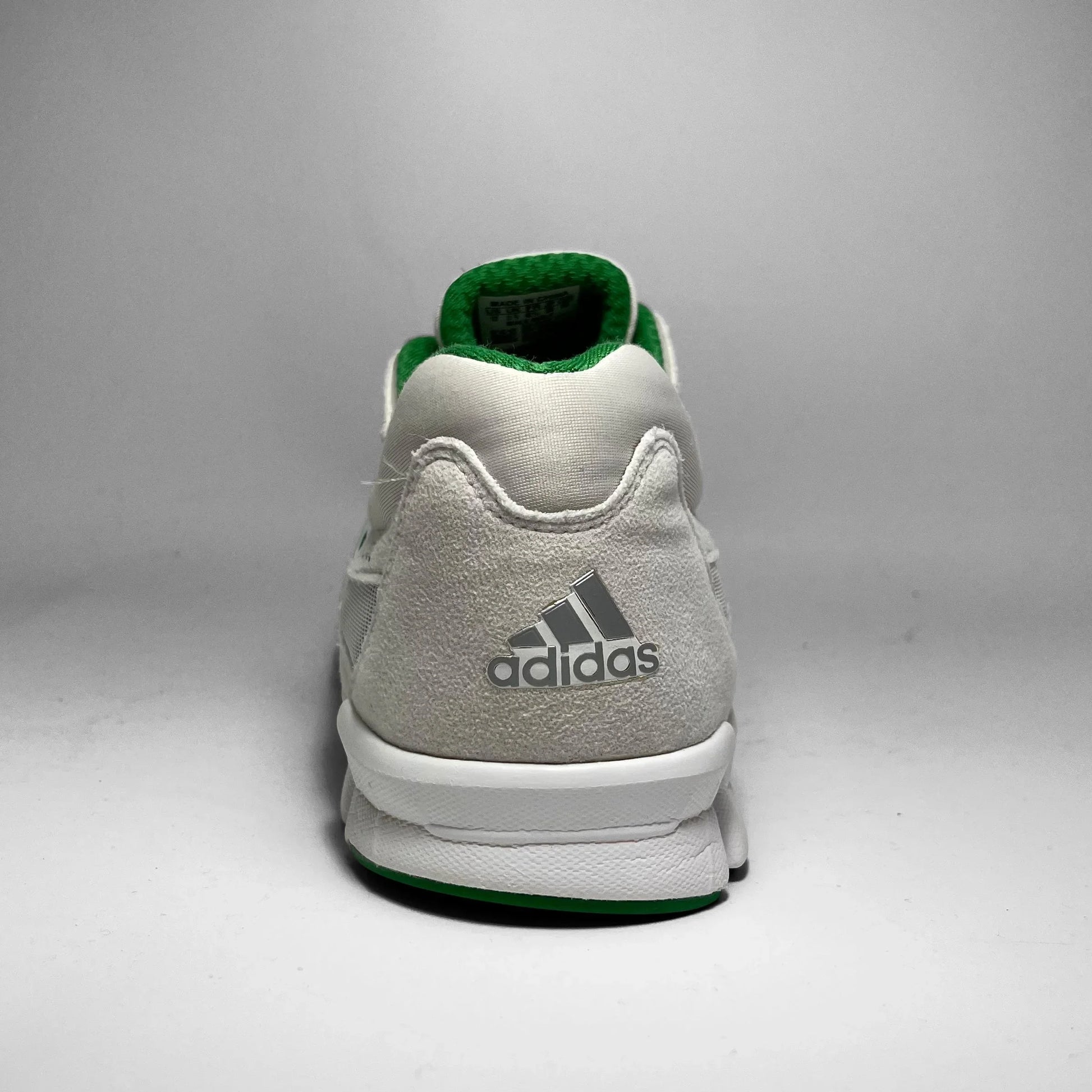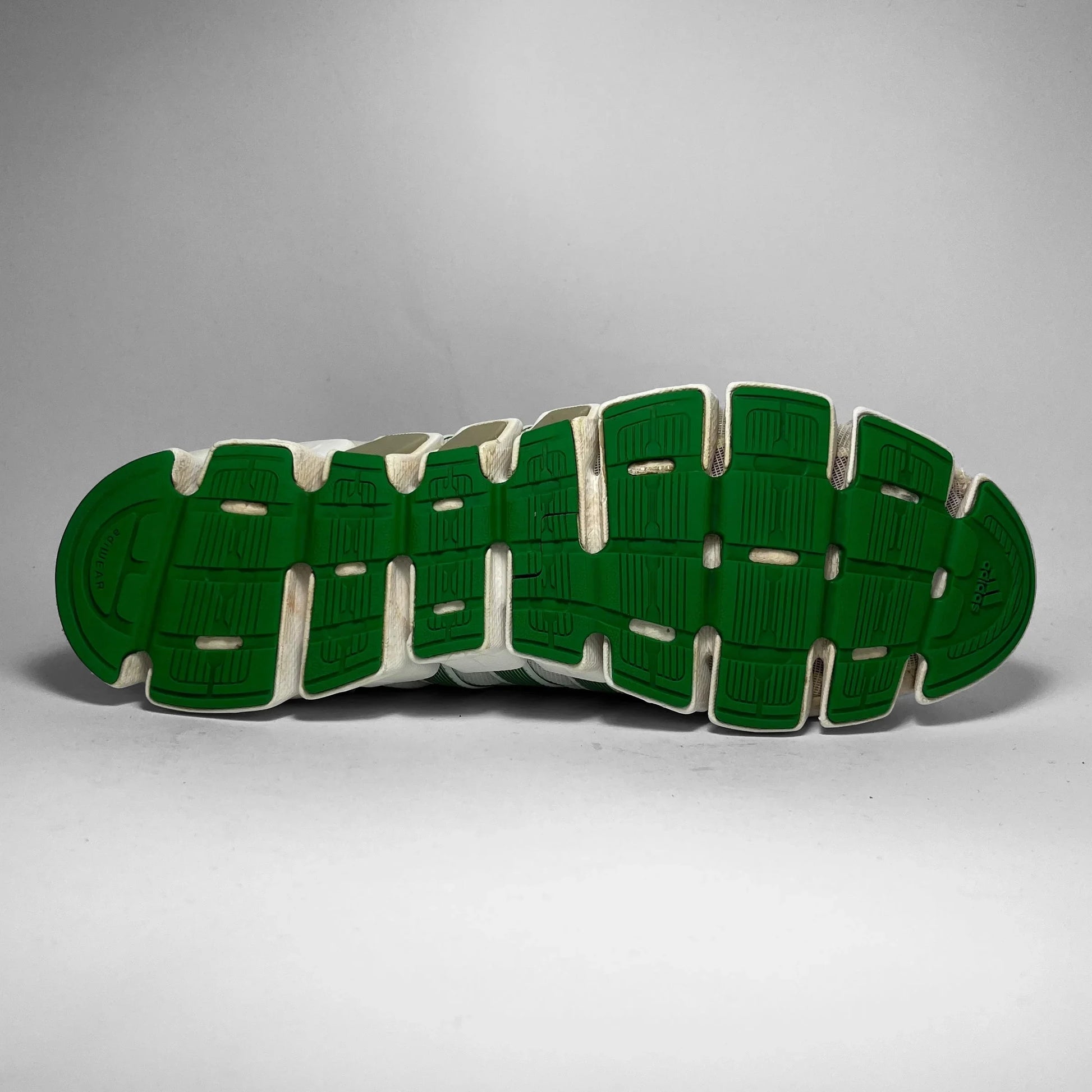 Released in 2011, this Adidas Climacool features a breathable white mesh upper with suede overlays, metallic green three-stripe detailing, and a segmented white and green midsole designed for maximum flexibility and airflow, completed with a green-lined interior and durable rubber outsole.
