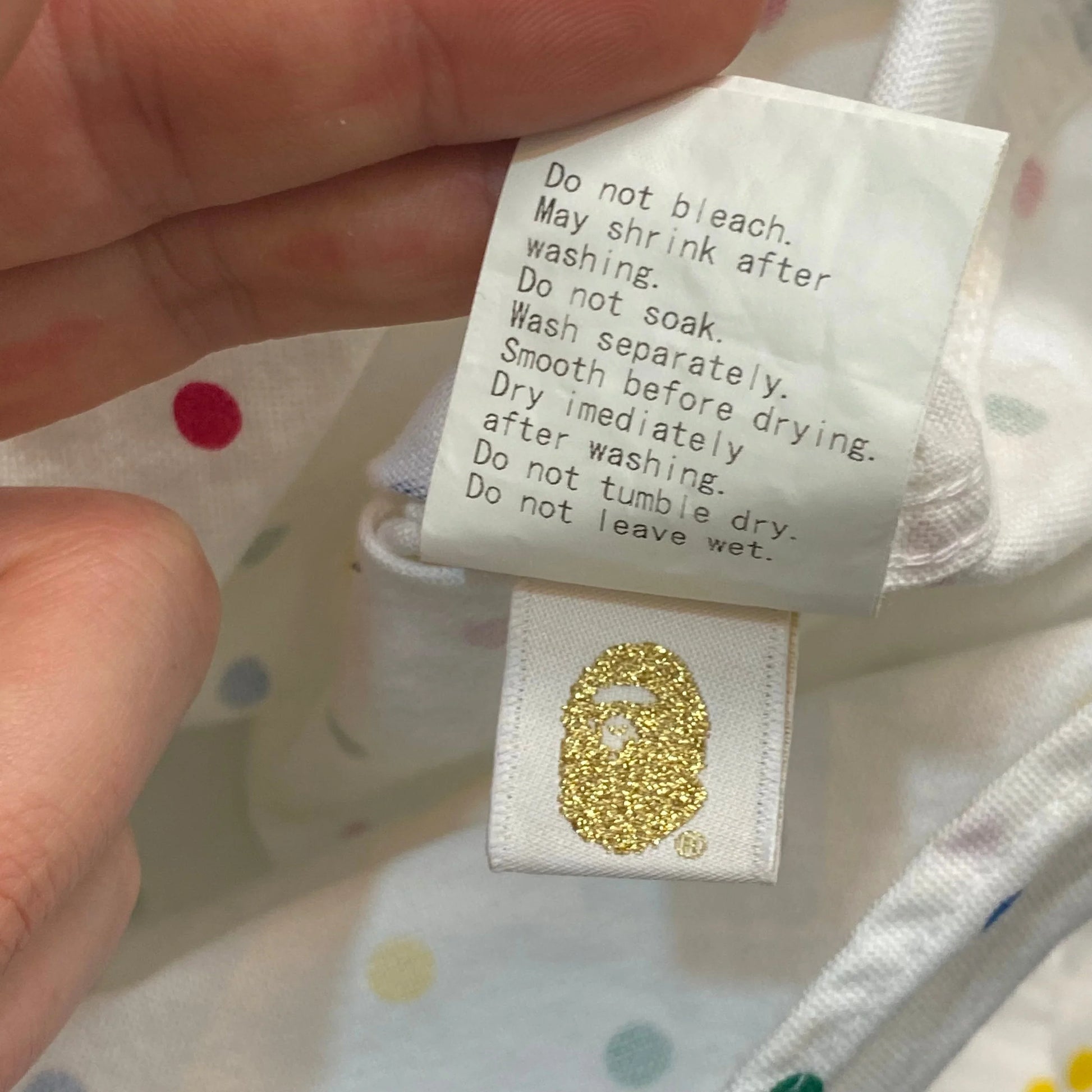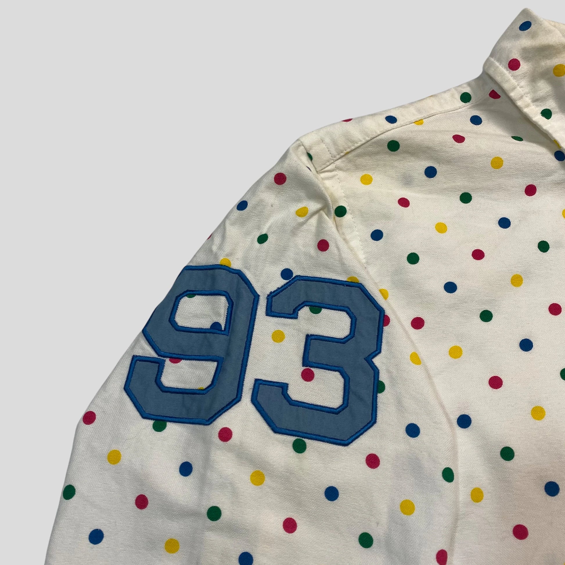 Lovely Damien Hirst style Bape Polka Dot shirt, button down collar, embroidered 93 logo on the arm and a big embroidered ape head to the chest.