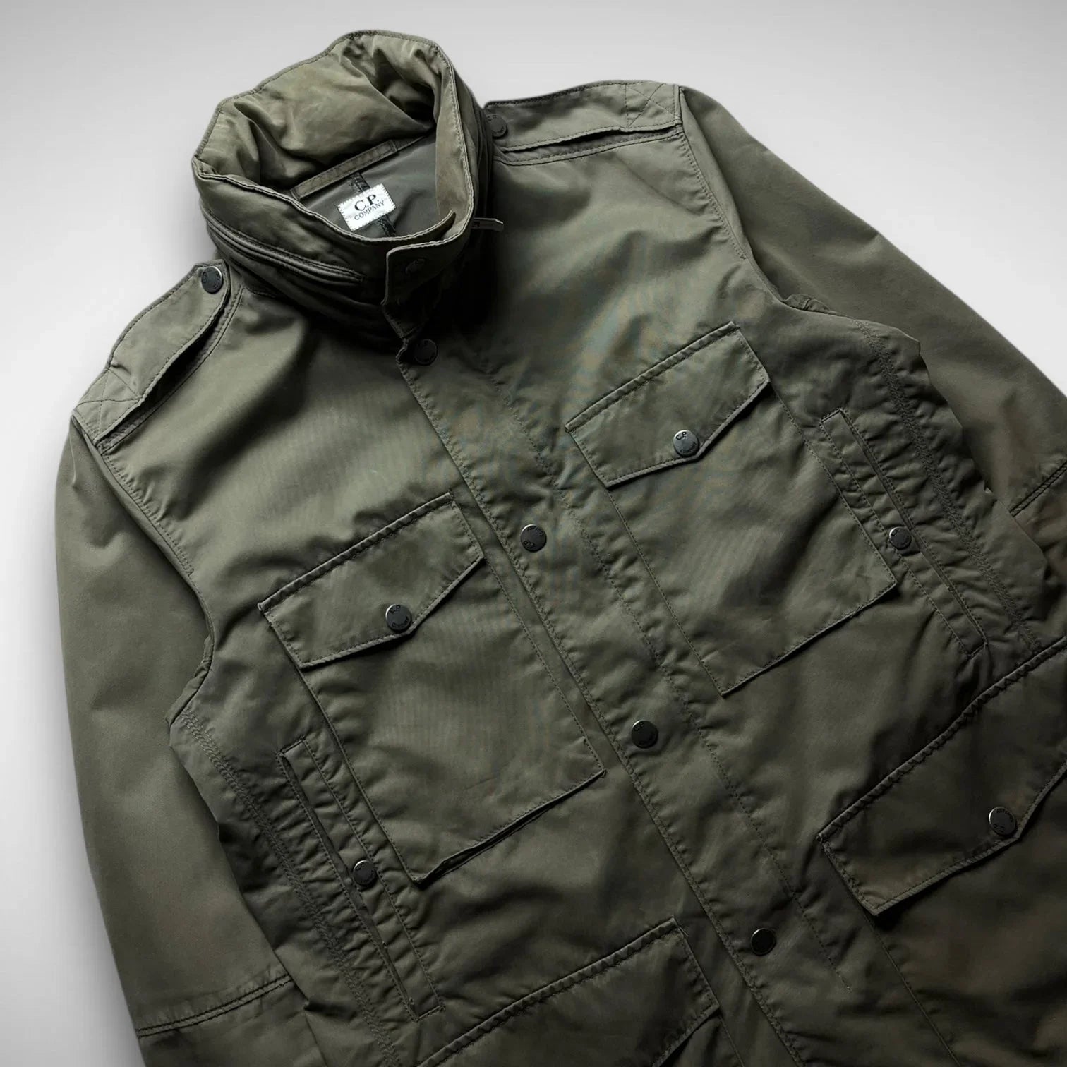 Classic M65-inspired field parka constructed from robust cotton with a clean, utilitarian finish. Features four front flap pockets, double handwarmer pockets, concealed zip and button closure, epaulettes, and an integrated hood that zips into the high stand collar. The interior is unlined, keeping it lightweight for spring wear, with adjustable drawcords at the waist and hem for a customisable fit. Finished with tonal stitching and subtle panel construction throughout.