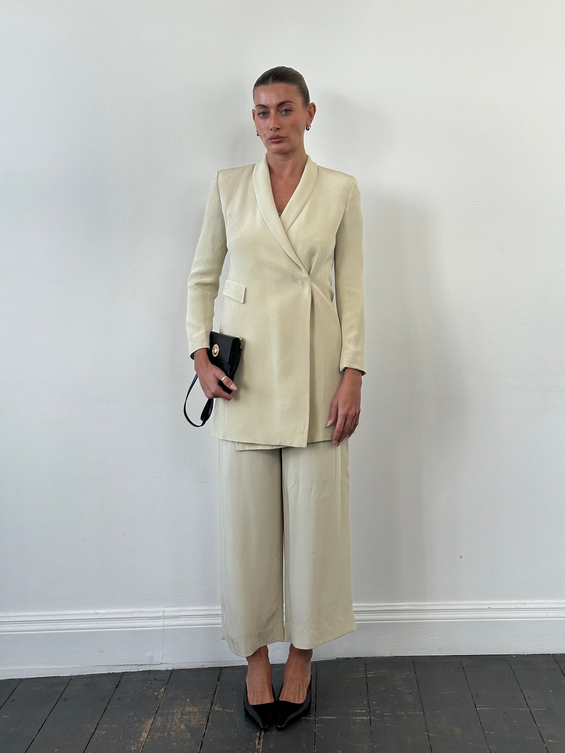 A cream Emporio Armani 1990s two-piece suit featuring a clean fitted blazer paired with wide-leg trousers, crafted in a smooth acetate-viscose fabric with a soft structured drape.