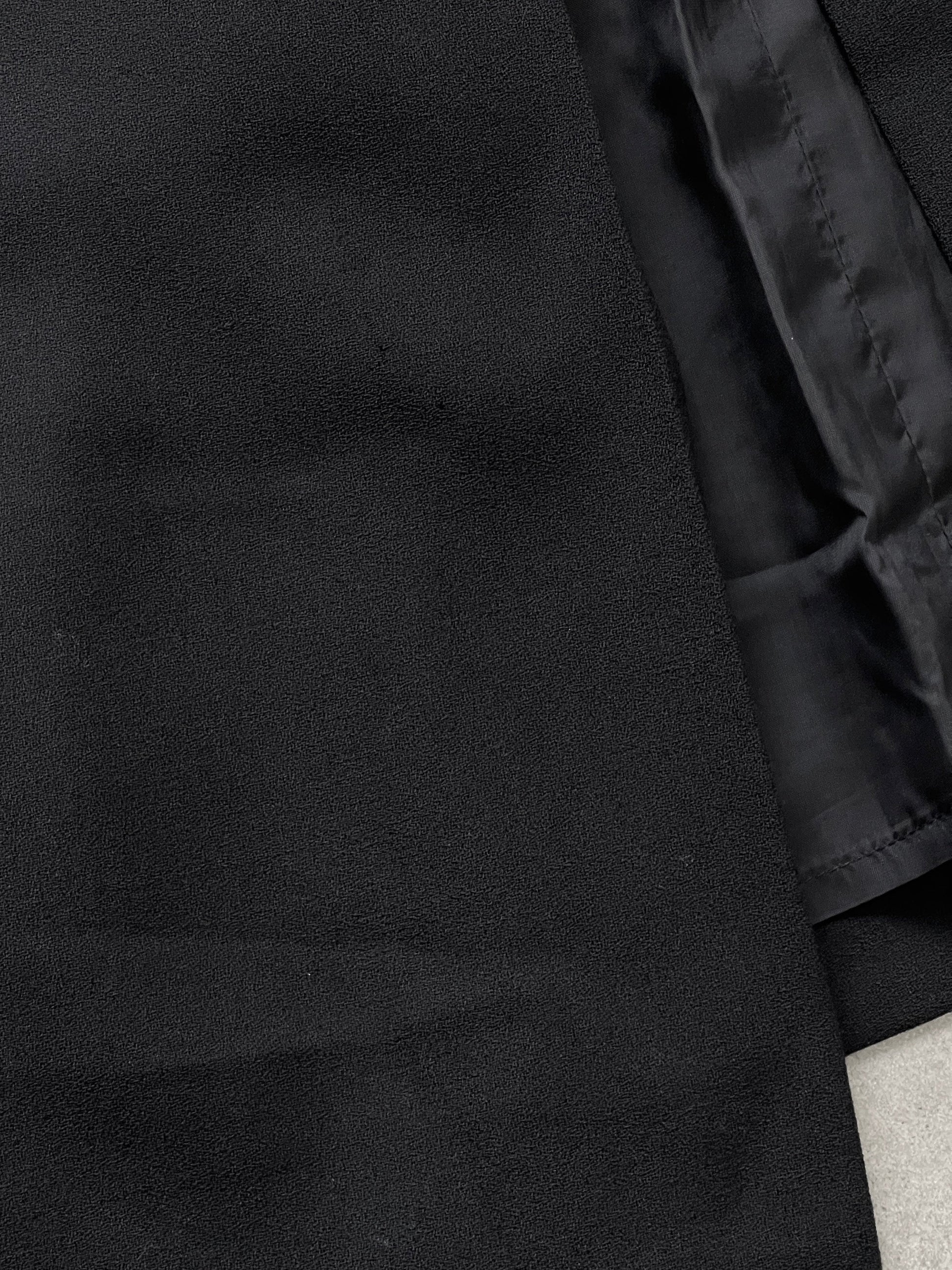 Jaeger full length maxi skirt in deep black pure new wool with a clean straight silhouette and central split. Designed with a subtle double layered front panel that creates soft movement through the hem, offering refined 1990s minimal tailoring.