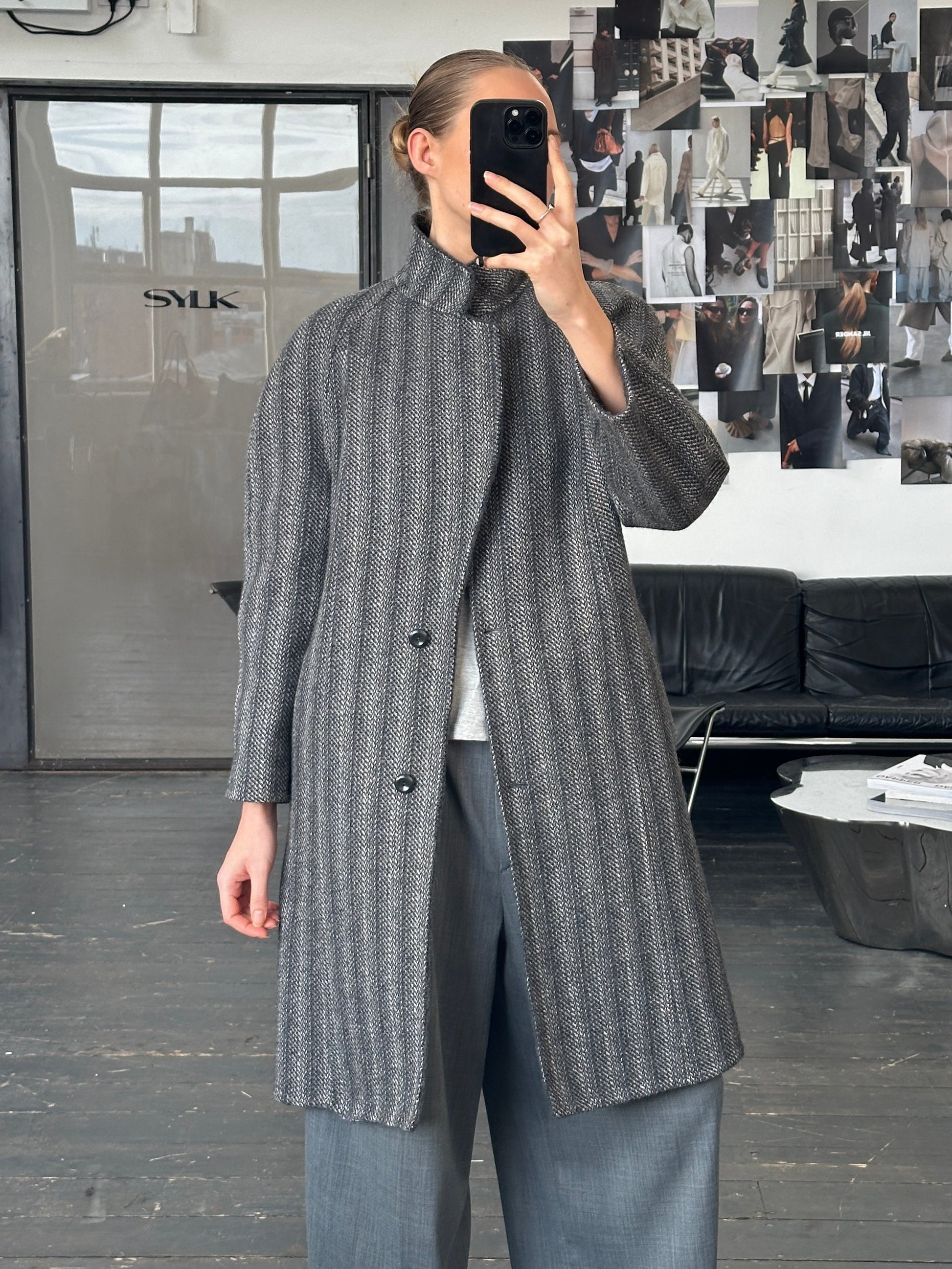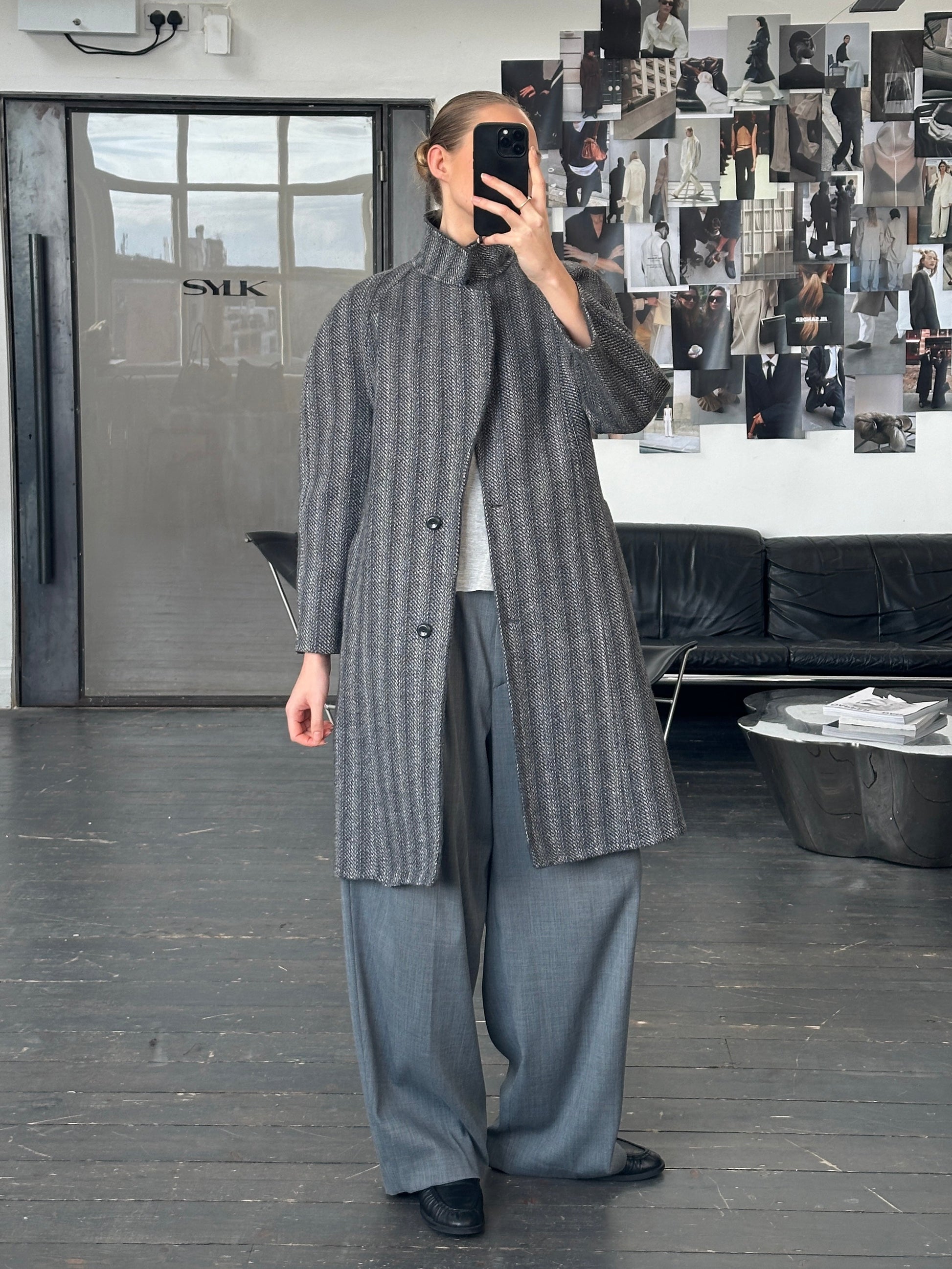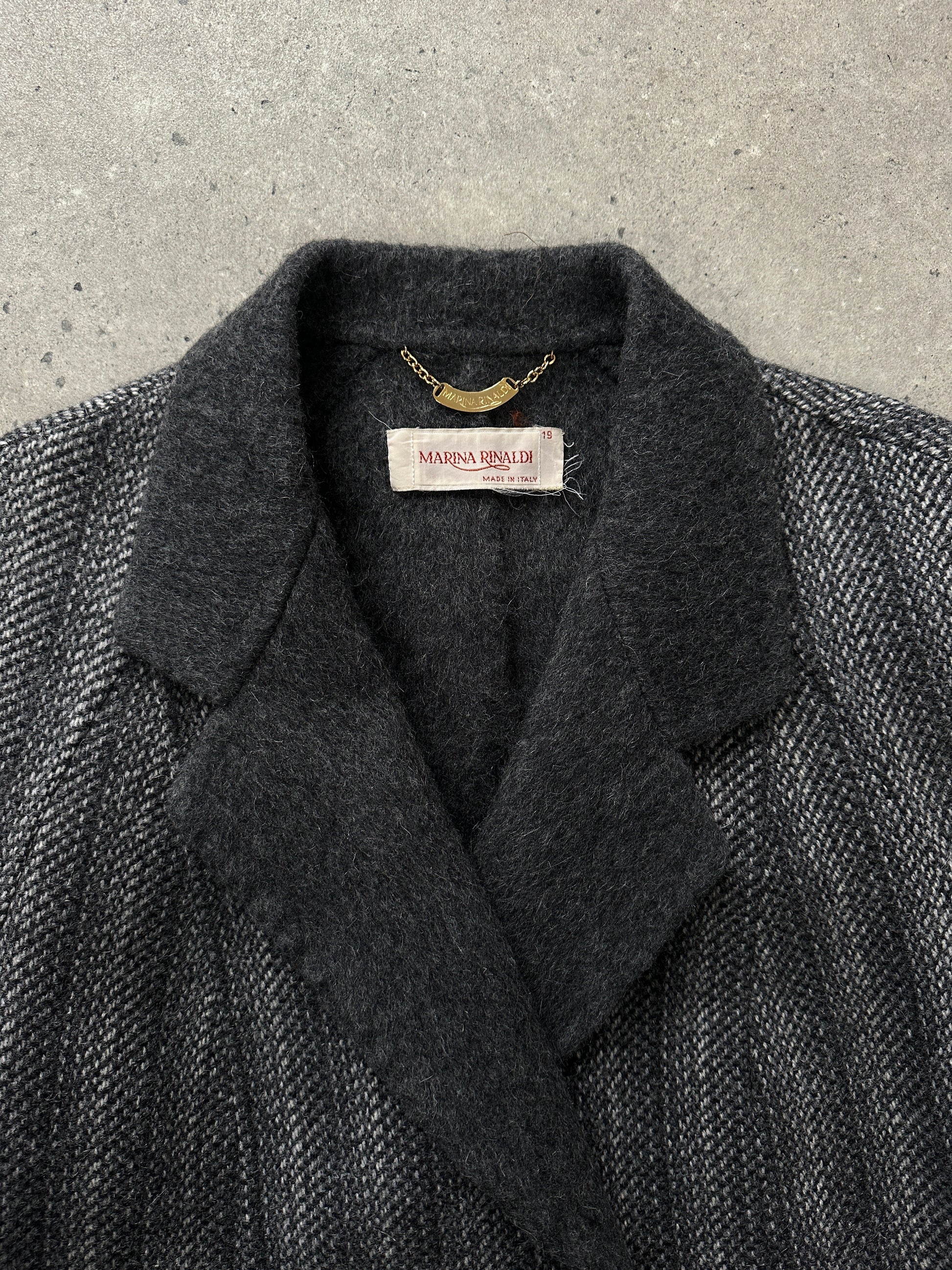 Vintage Marina Rinaldi by Max Mara grey single breasted coat with a double faced wool construction and contrast collar detailing. Clean woven finish with a structured silhouette typical of the 1990s.