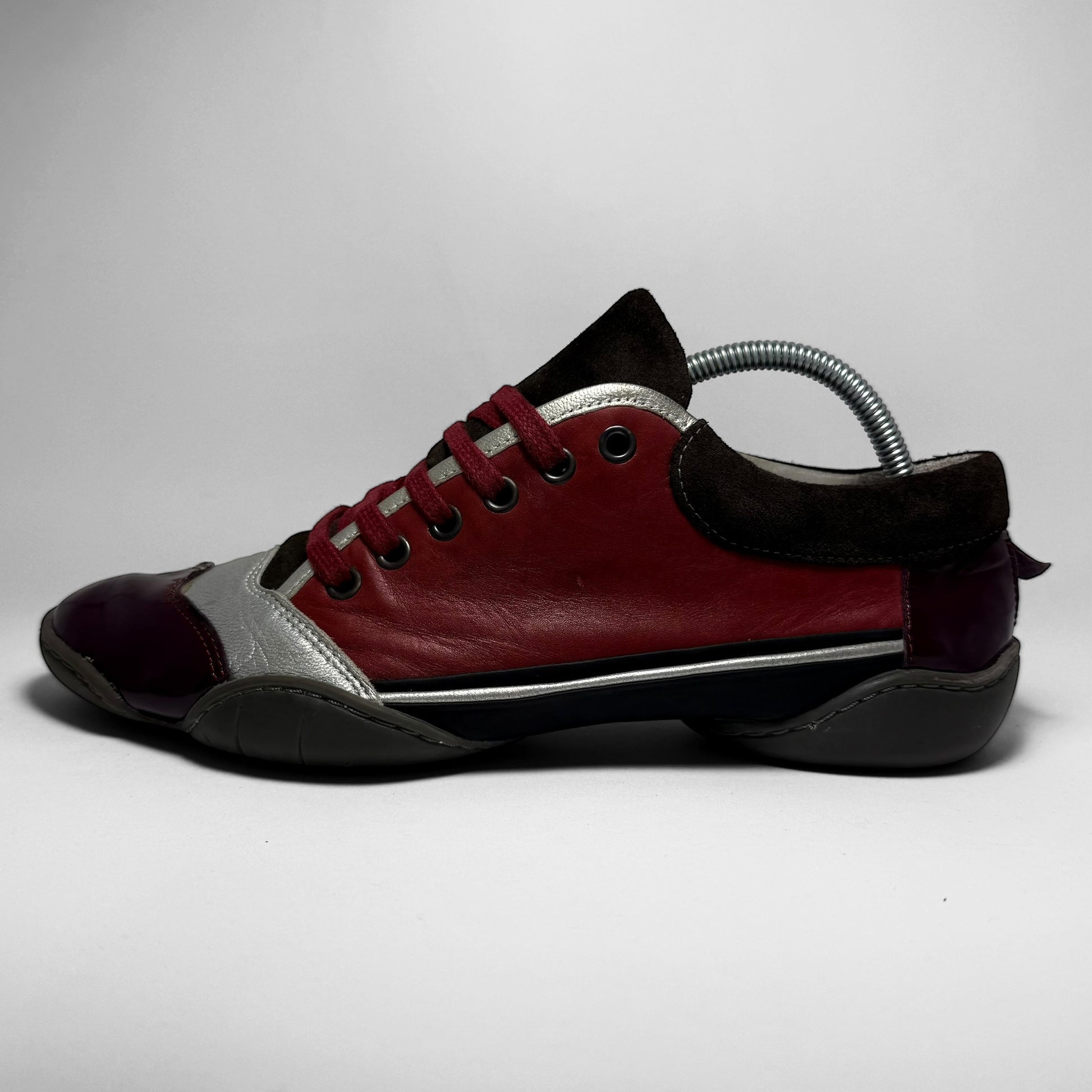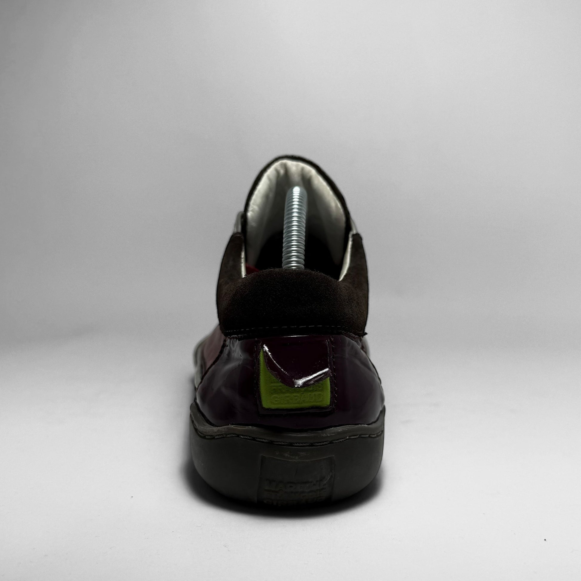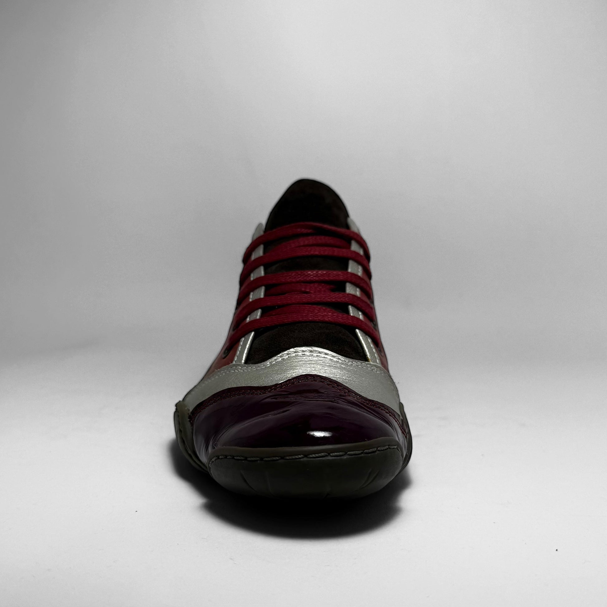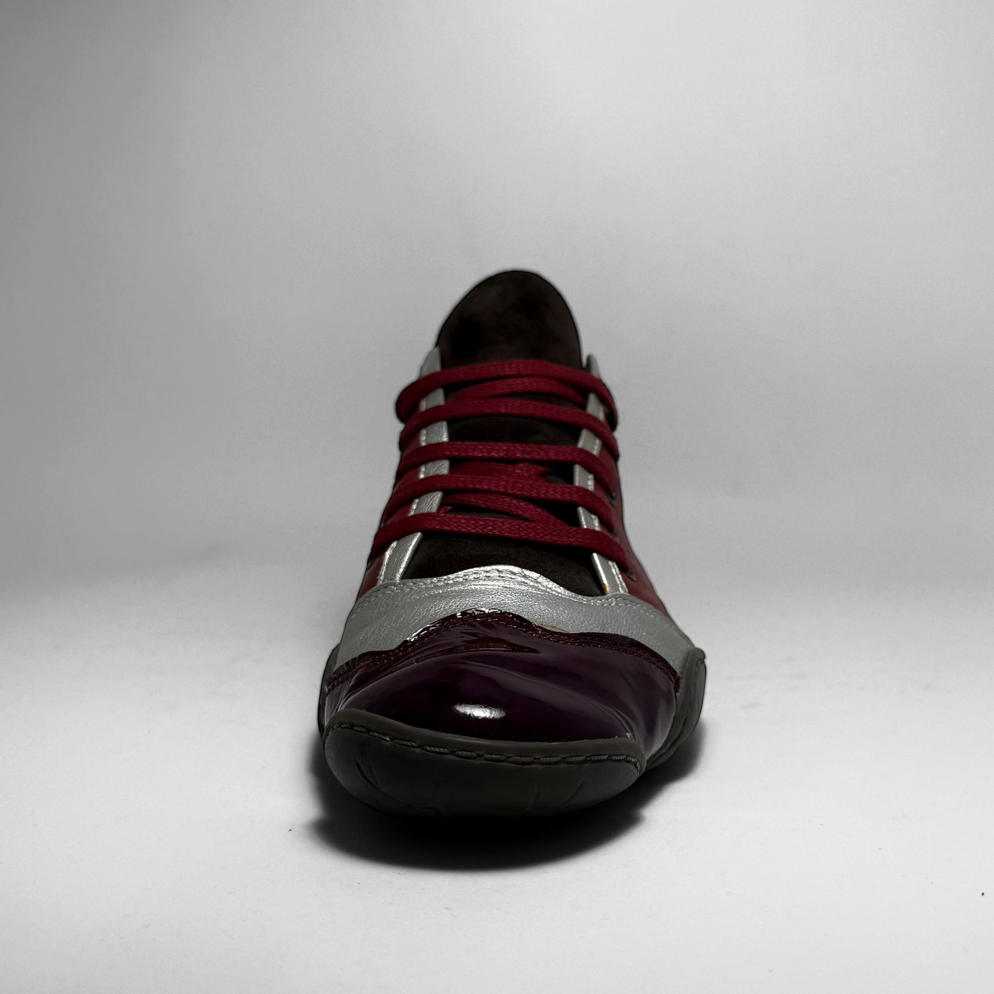 Crafted in a mix of burgundy leather, metallic silver, dark suede, and glossy patent accents. A split rubber sole with bright green detailing and embossed branding.