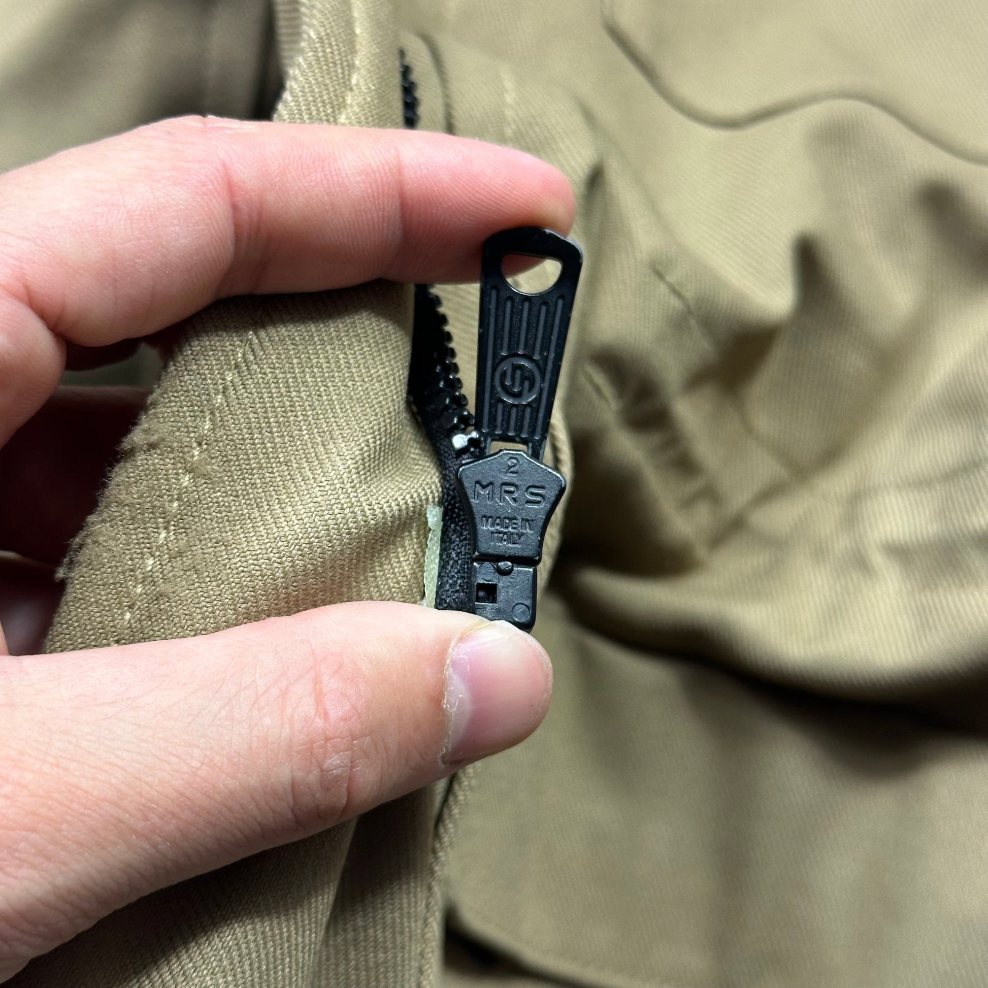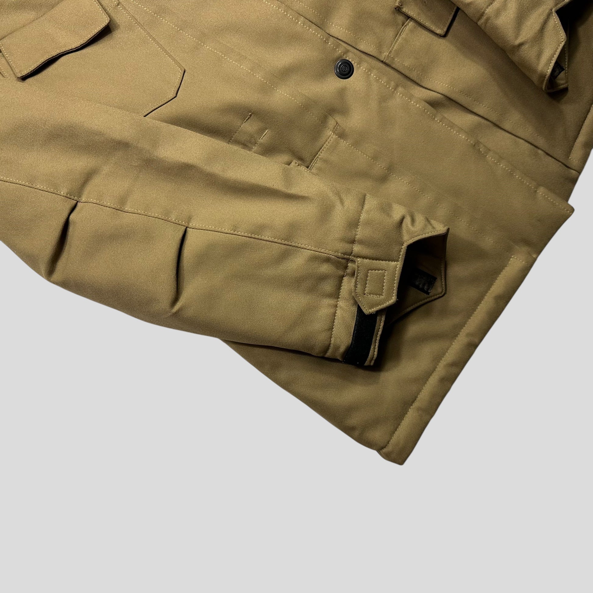 Very rare 1999 Massimo Osti Studio tan field jacket, super warm and weather resistant with padded down lining, multipocket construction, unique angled velcro asymmetric cuffs, packable grey constrast hood, lovely quality made in Italy.