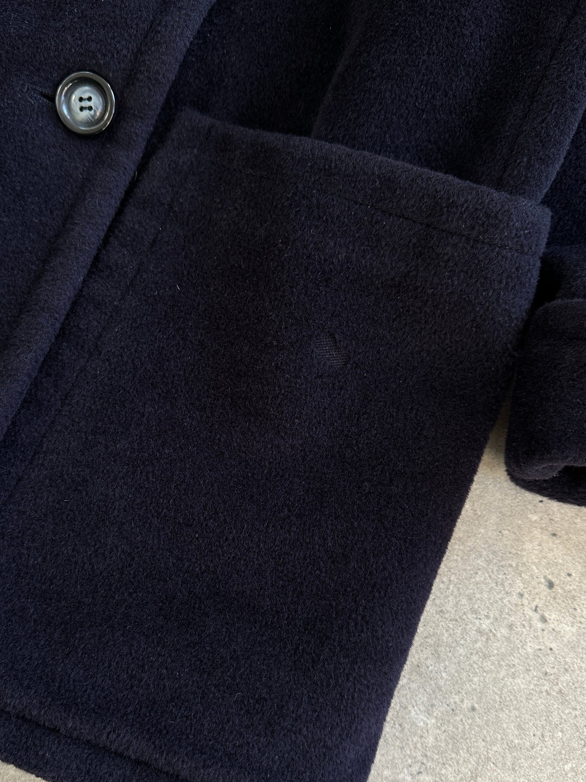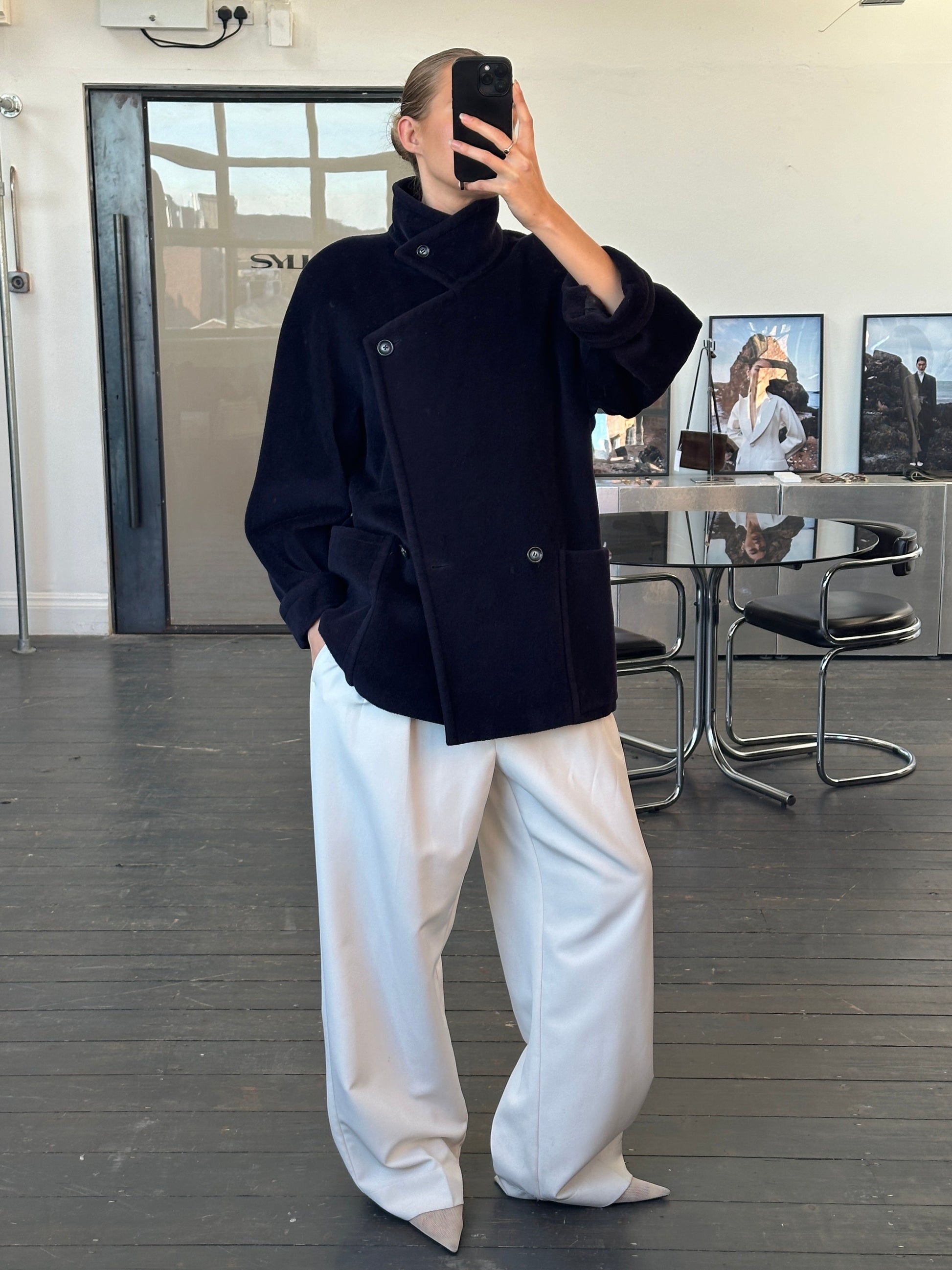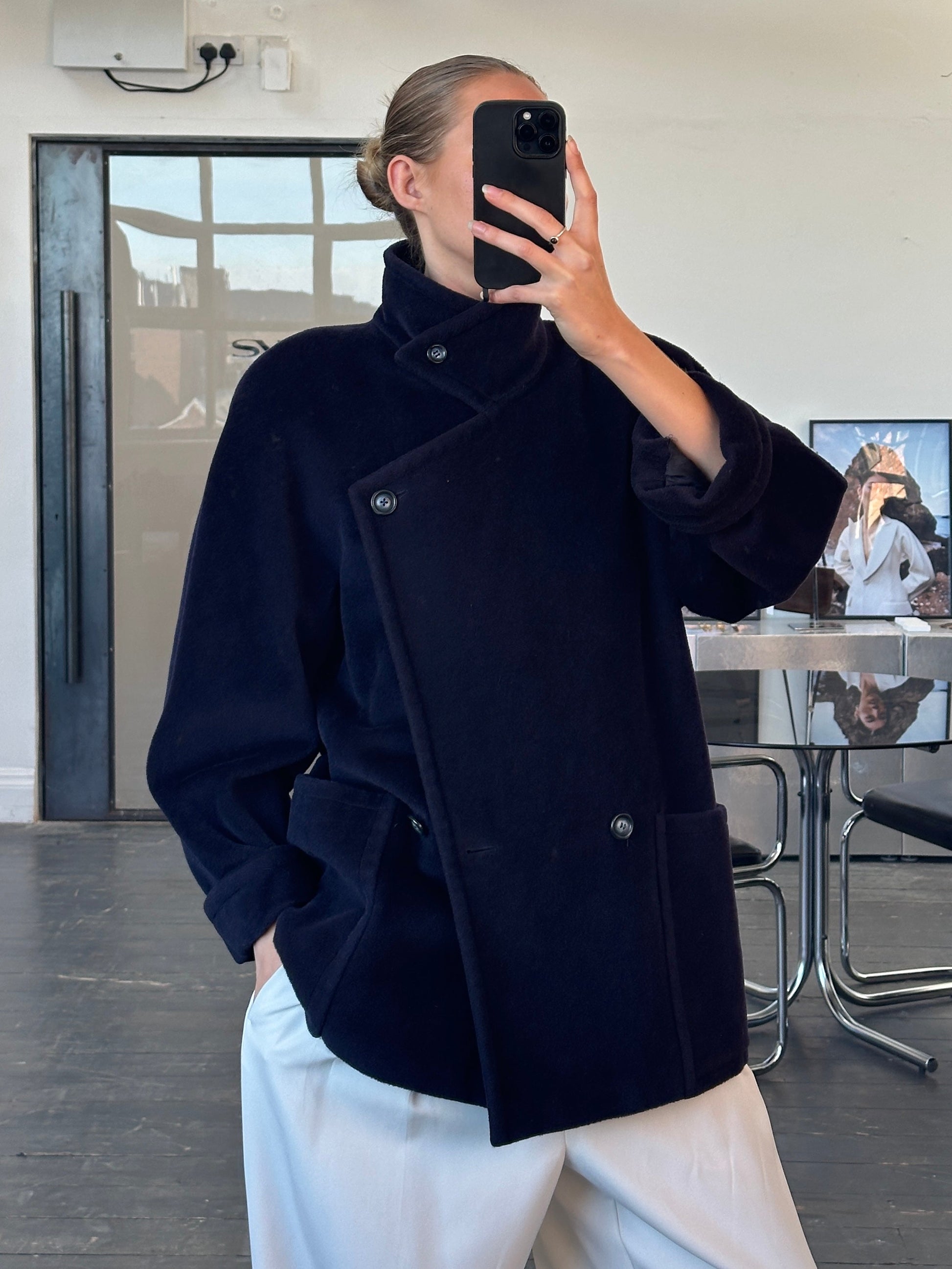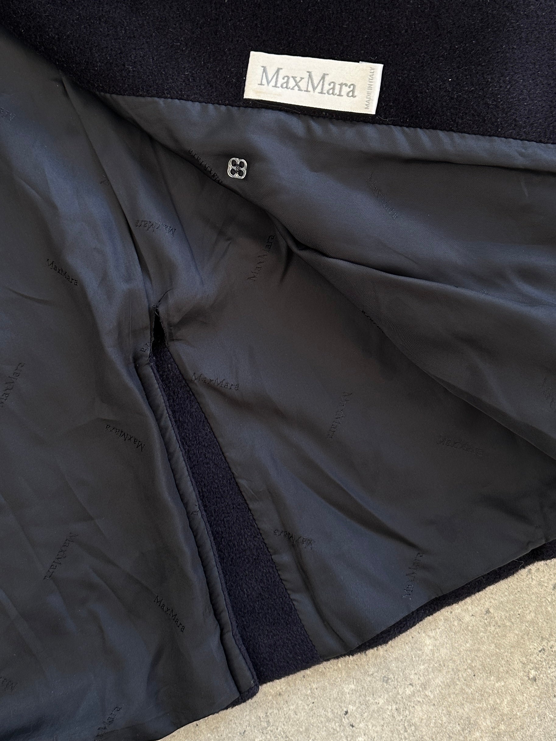 Max Mara vintage 1990s sculptural wrap-front in deep navy. Crafted in Italy from a warm wool & mohair blend. Featuring asymmetric fastening and Max Mara monogram lining.
