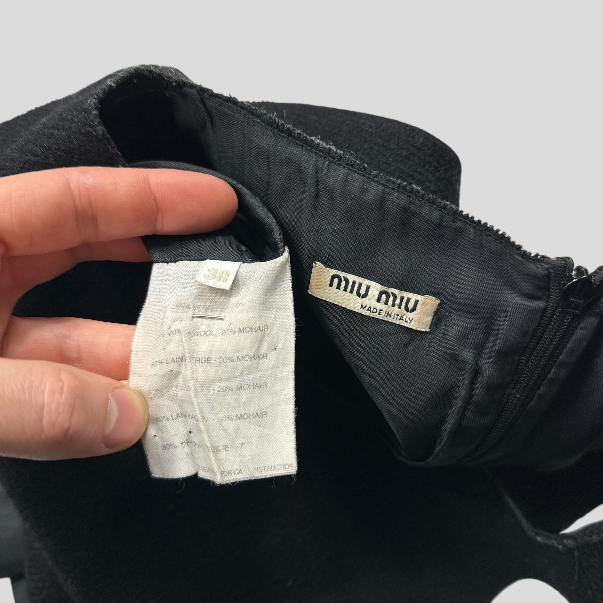 Beautiful early 2000’s Miu Miu black wool and mohair blend material sleeveless tank top that’s very chic and high end, the cut and fit is very fitted / flattering with a corset style shape, silky soft lining, zip at back to put on.