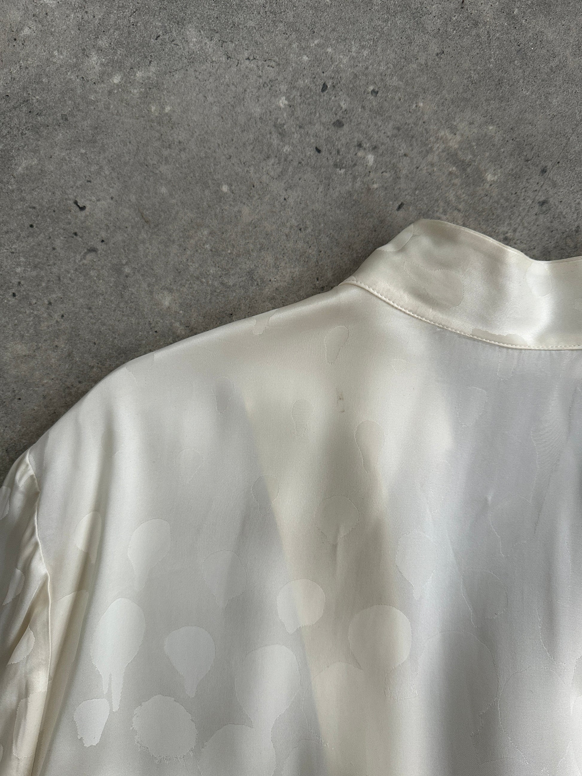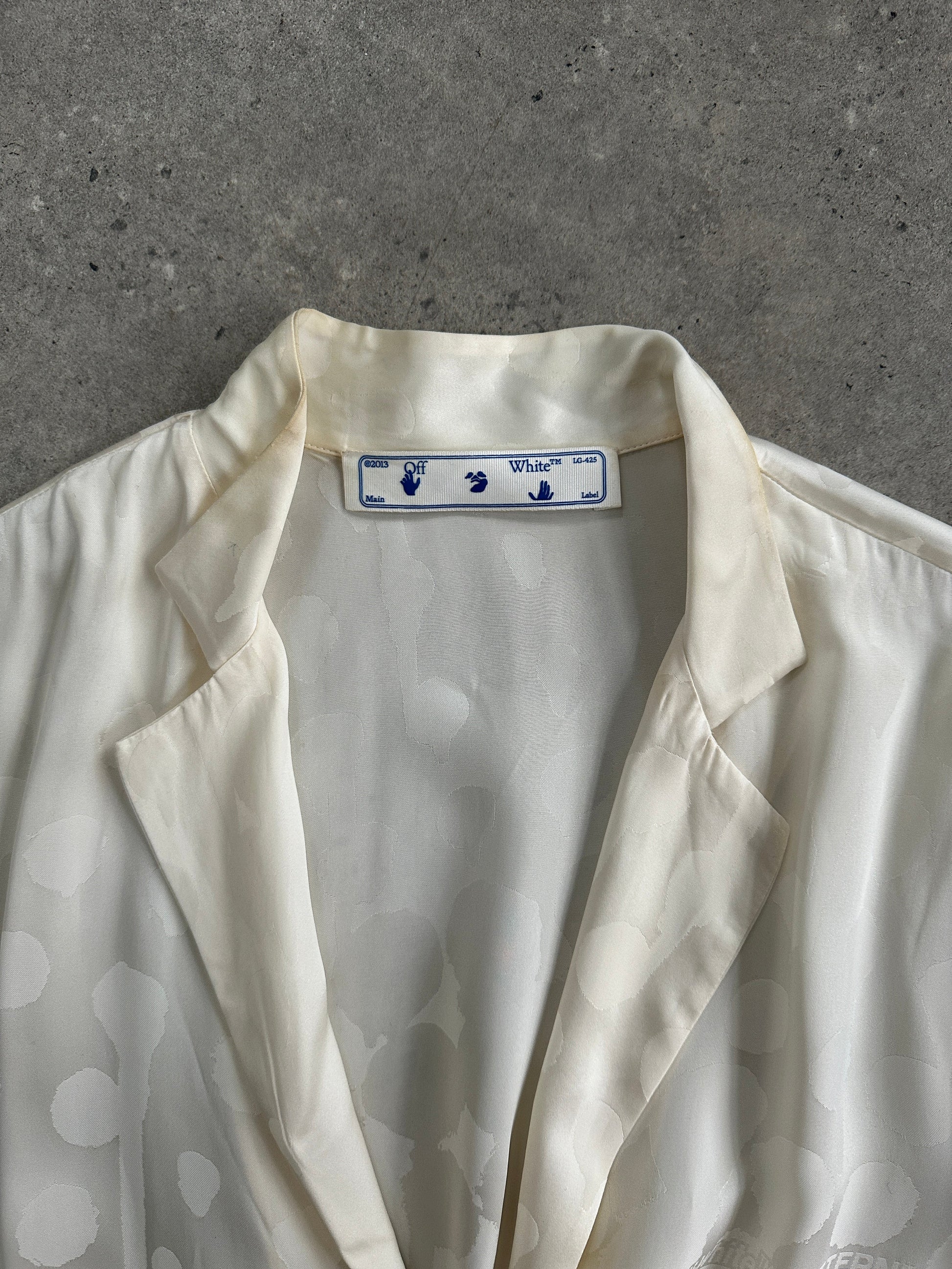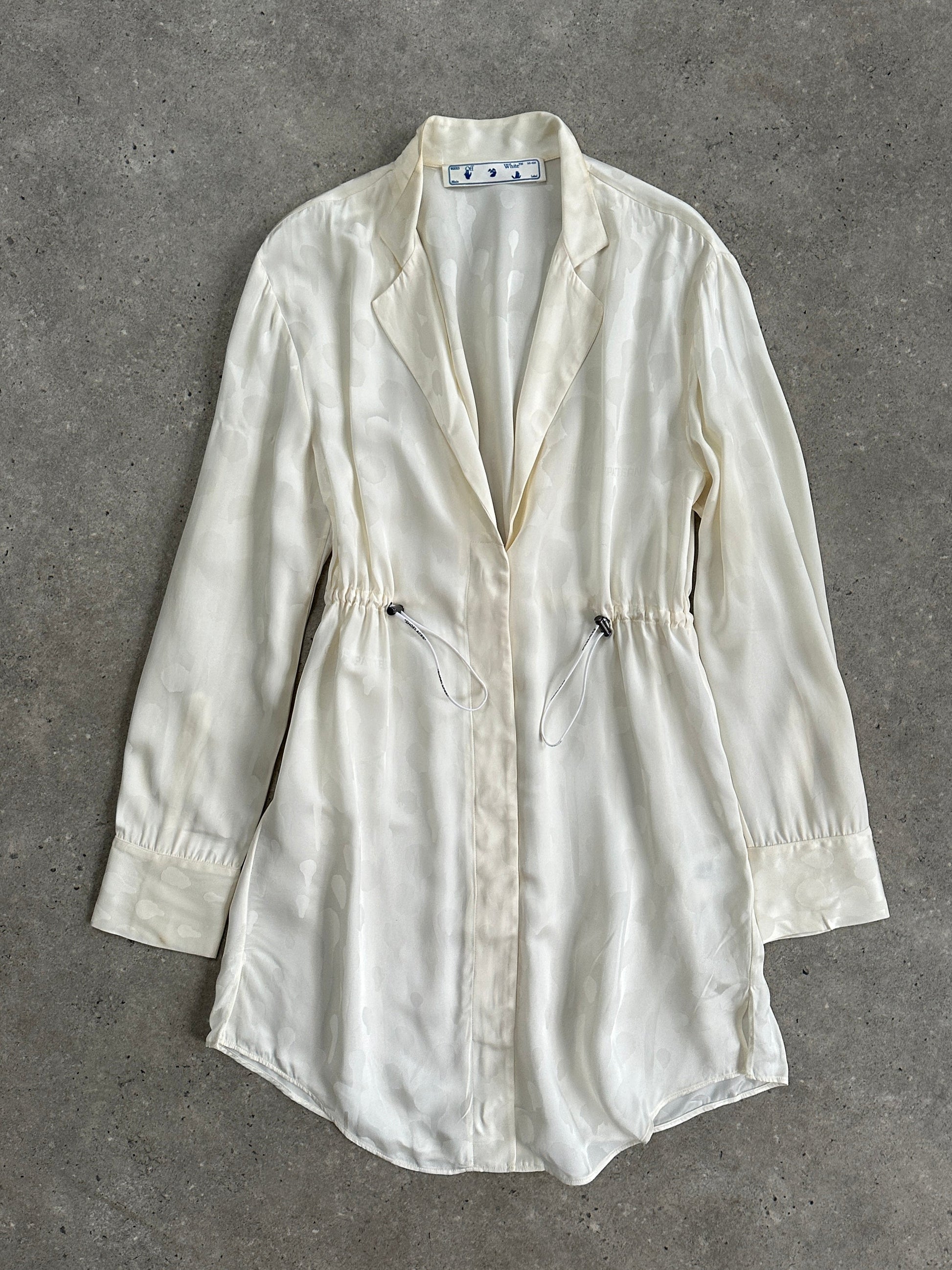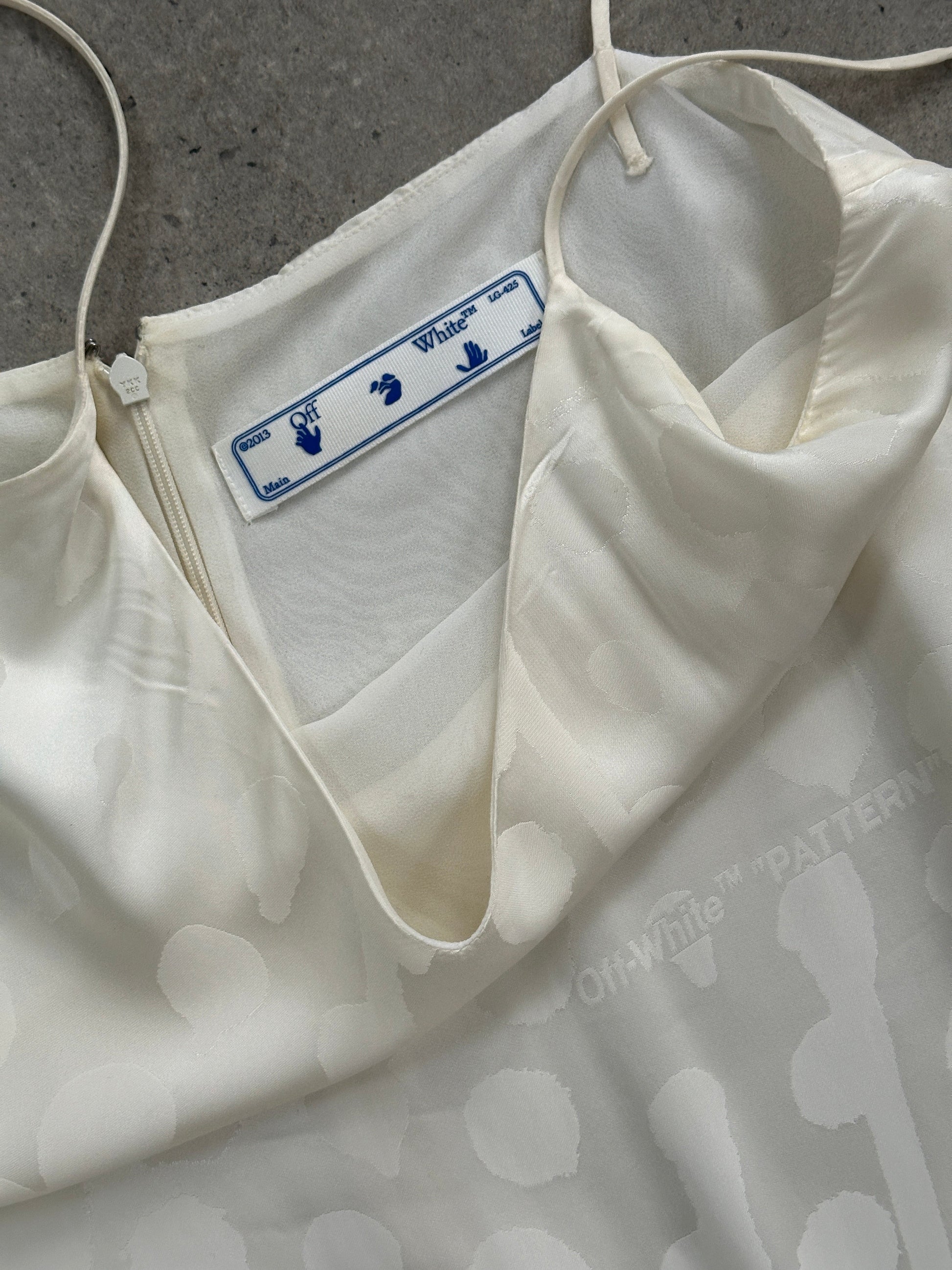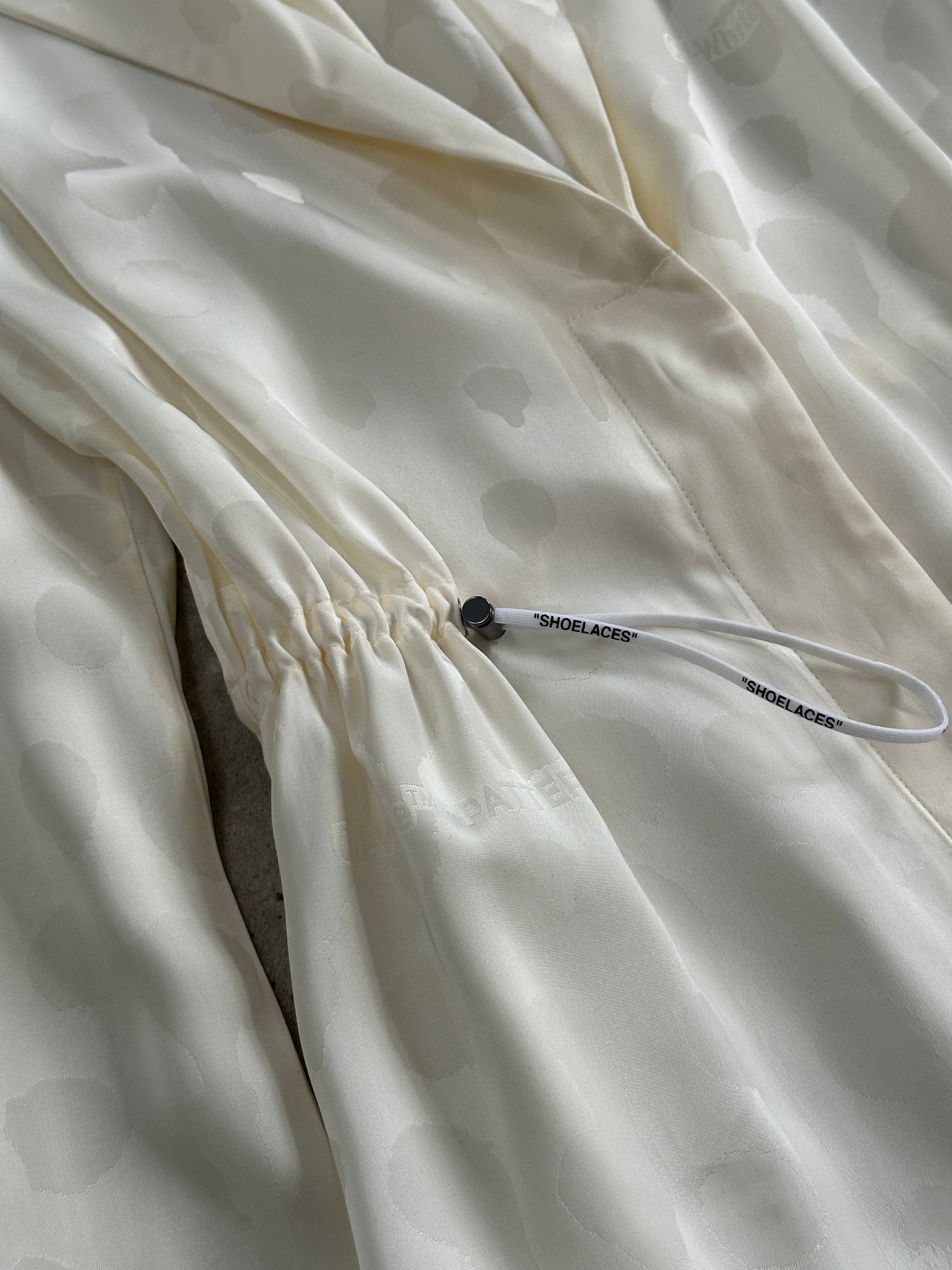 Early-era Off-White in lustrous jacquard, featuring the brand’s signature “PATTERN” motif. A fluid slip dress with asymmetric hem layers under a cinched shirt-dress.
