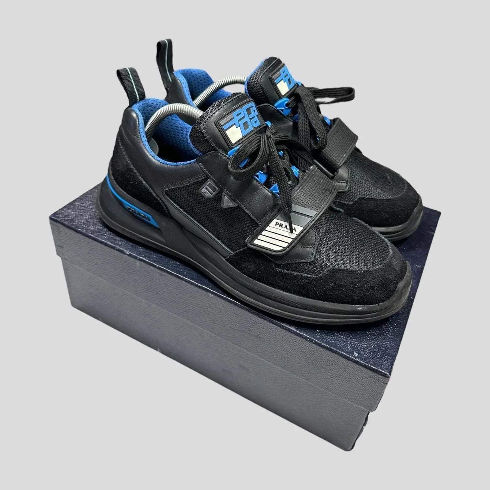 Extremely rare Prada 2018 Chunky Mechano Sneakers, logos to strap, heel tab, tongue outsole, sole, crazy pair with great blue rubber and black leather detailing, made in Italy.