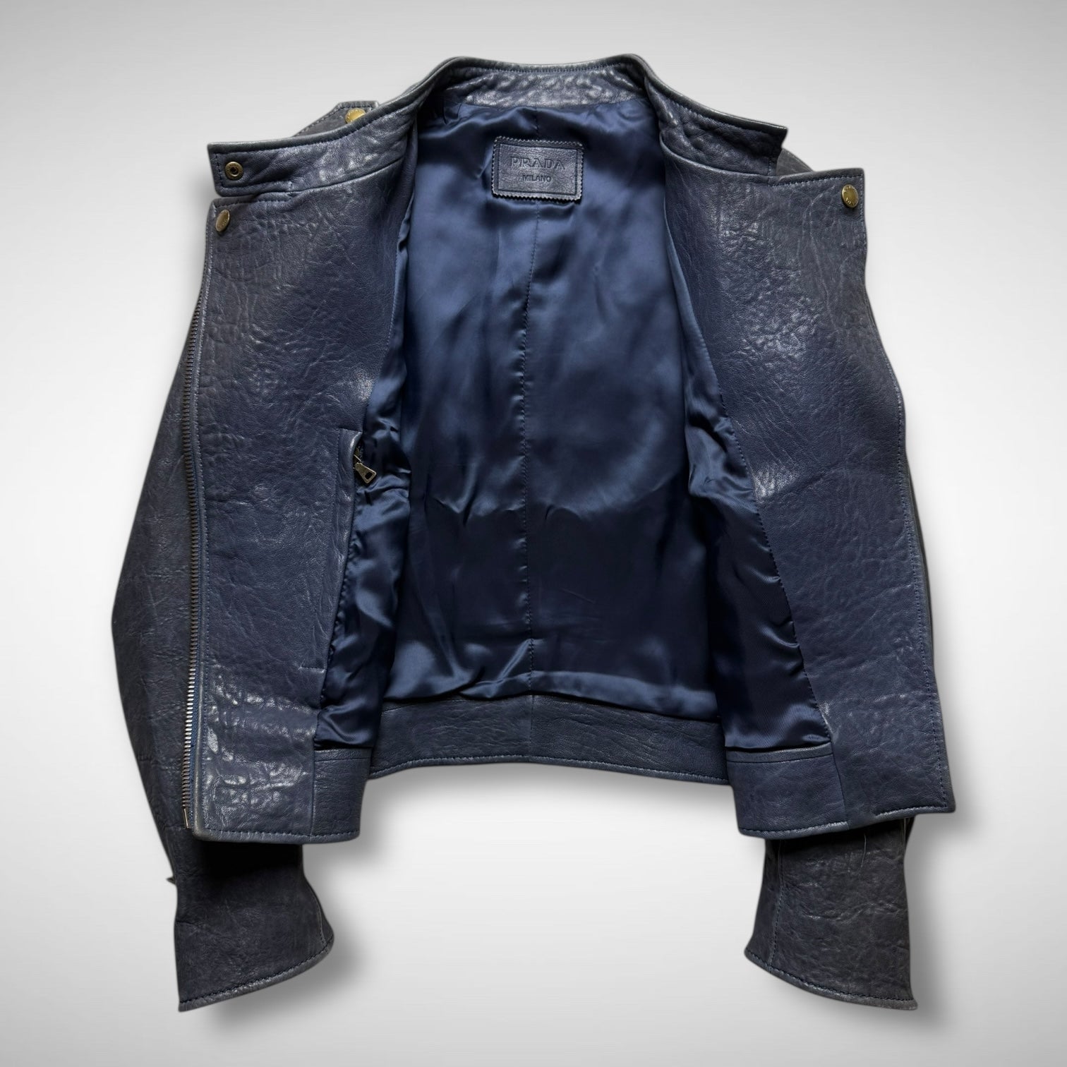 Thick, structured biker jacket in deep purple leather with rich patina and visible grain. Features shoulder epaulettes, angled zip closure, two front zip pockets, zipped cuffs, and a buttoned collar. Fully lined in satin with interior Prada Milano leather label and hidden zip pocket. Brass-tone hardware throughout.