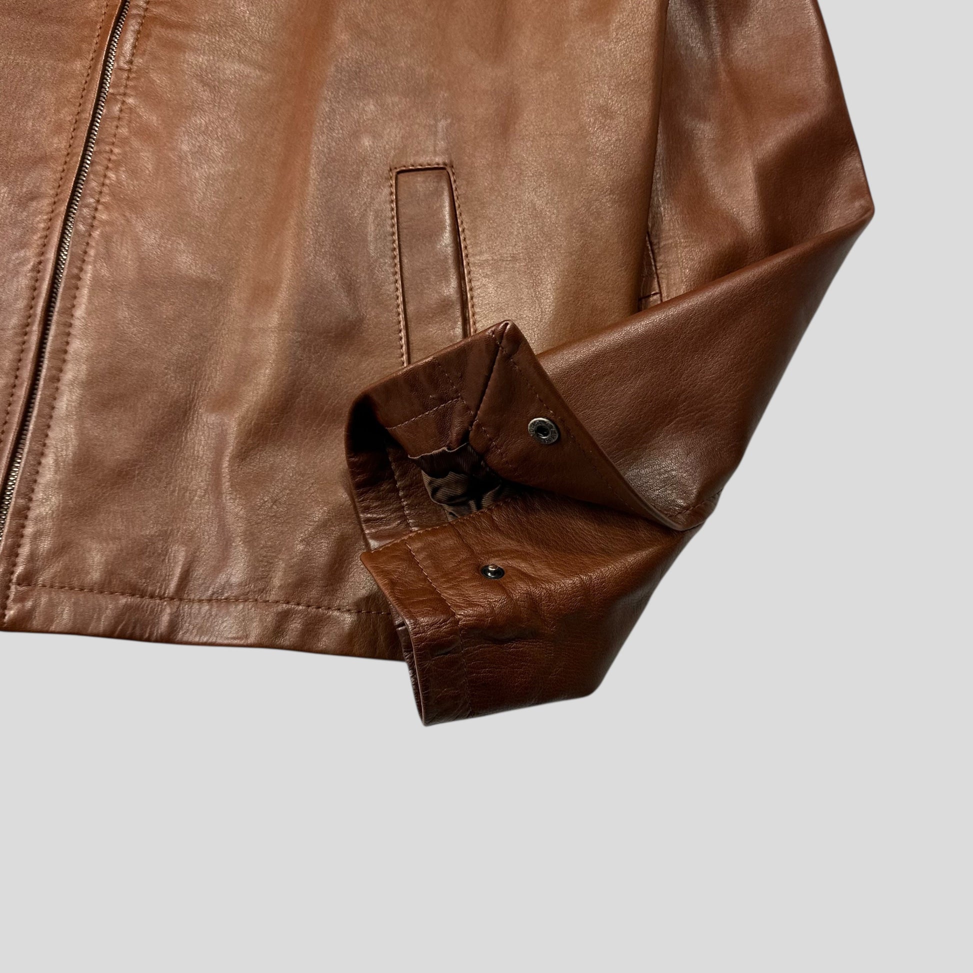 Beautiful Prada mainline fall winter 1998 warm whiskey brown lambskin leather jacket, very buttery soft luxurious leather yet feels tough and not too delicate, incredible colour lovely warm tone, unique work jacket style with zip-up front and pop buttons cuffs, nylon suit jacket style lining.