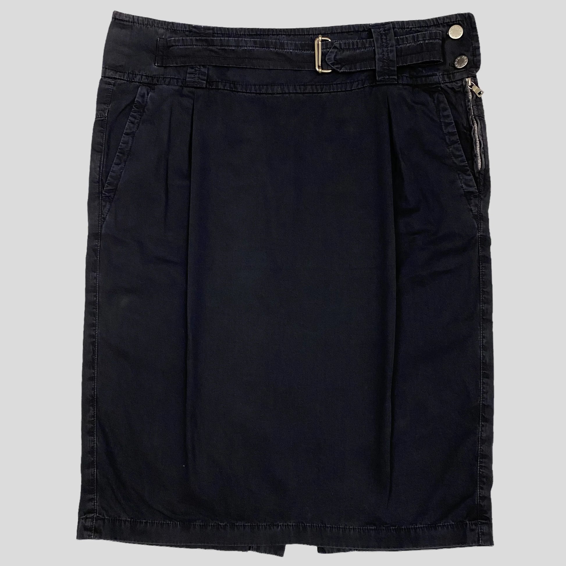 Lovely Prada Sport 2004 Belted Mid-length Cotton Skirt, really nice cut with double buttoned pockets to the back and an entirely adjustable waist via attached belt, Prada branded metal buttons to the side and an exposed metal RIRI side zipper.