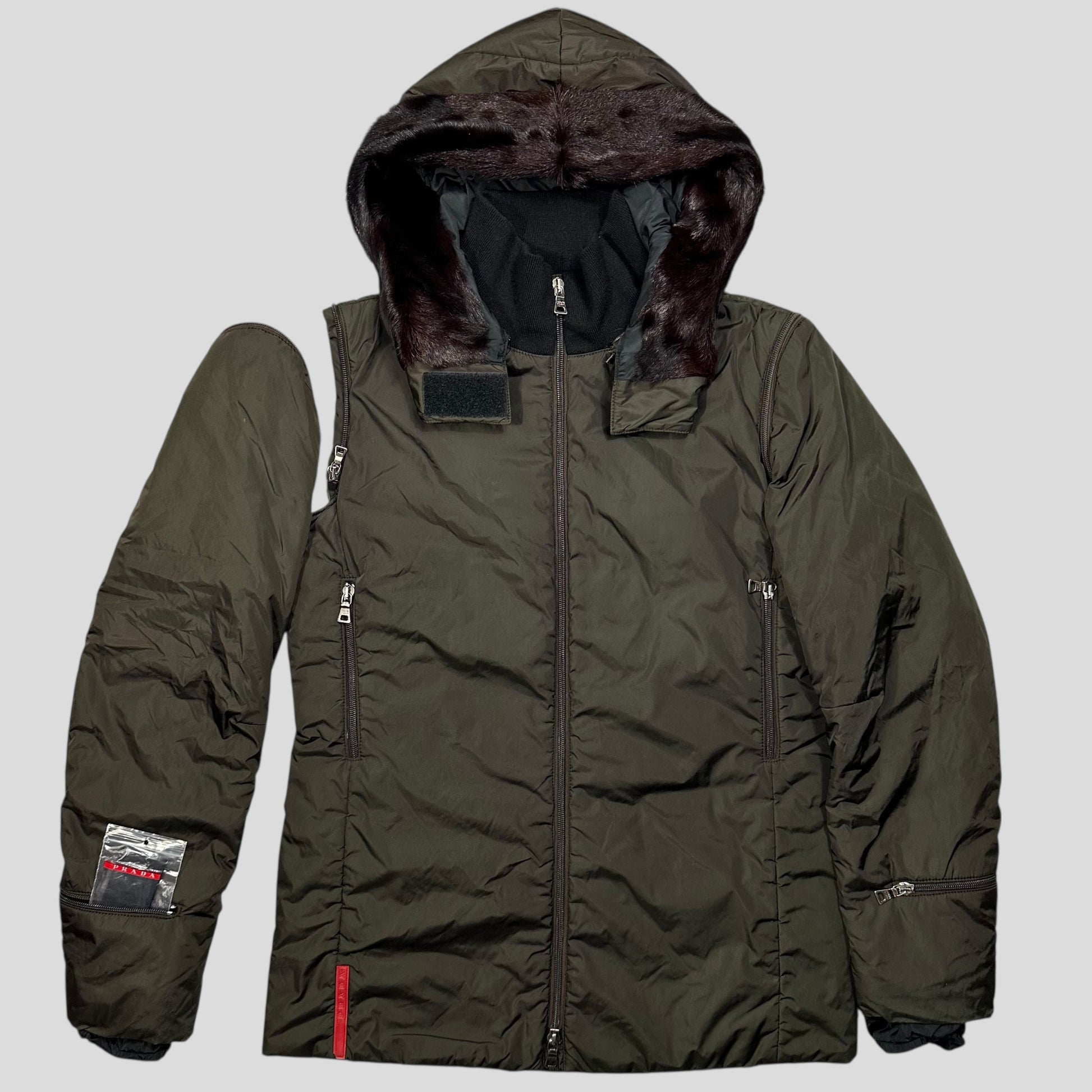 Extremely rare Autumn Winter 2000 Prada Sport khaki nylon padded ski jacket, jacket can be worn 7 different ways, each arm can be zipped off, hood removed and the jacket can be turned into a packable bag with the Prada Sport Red tab.