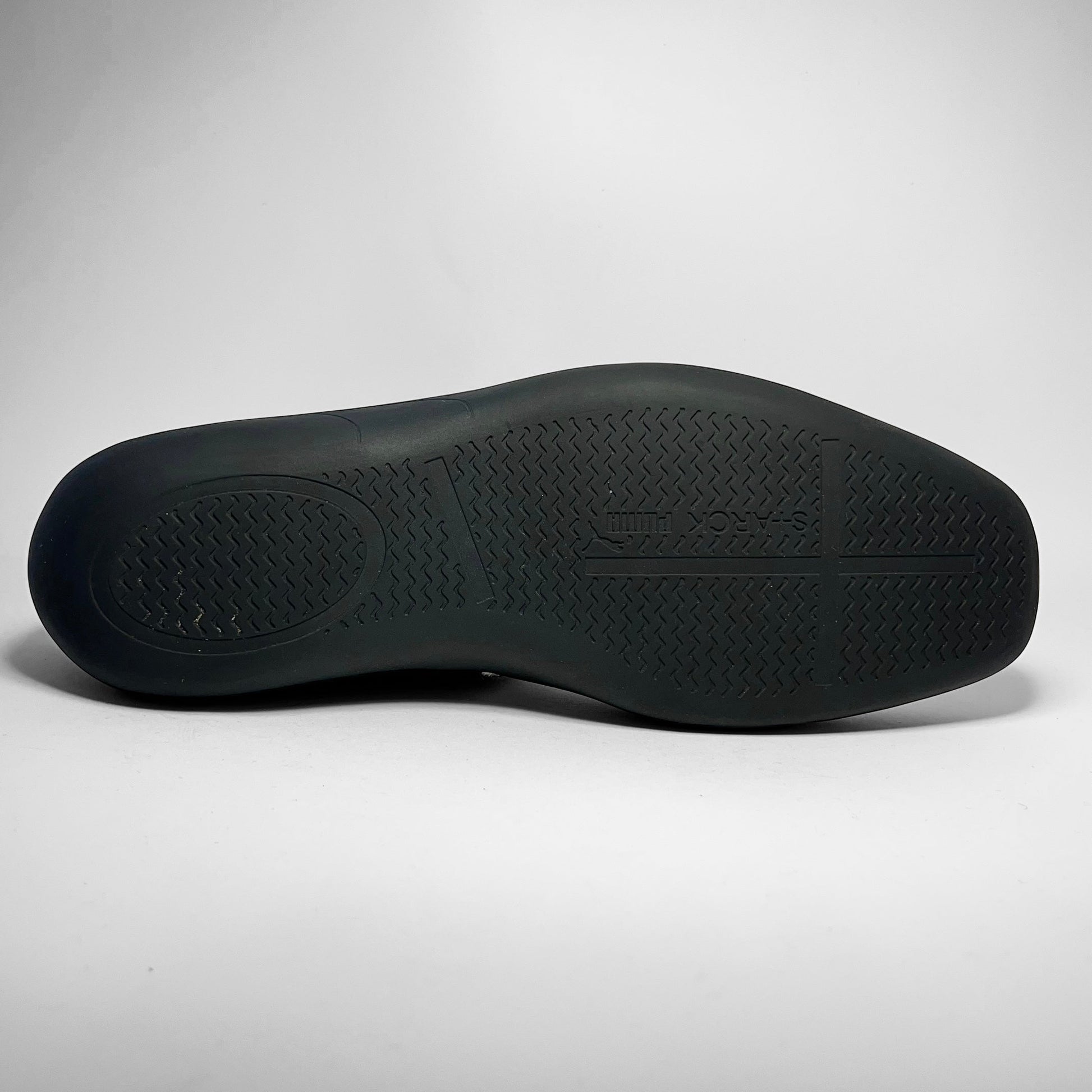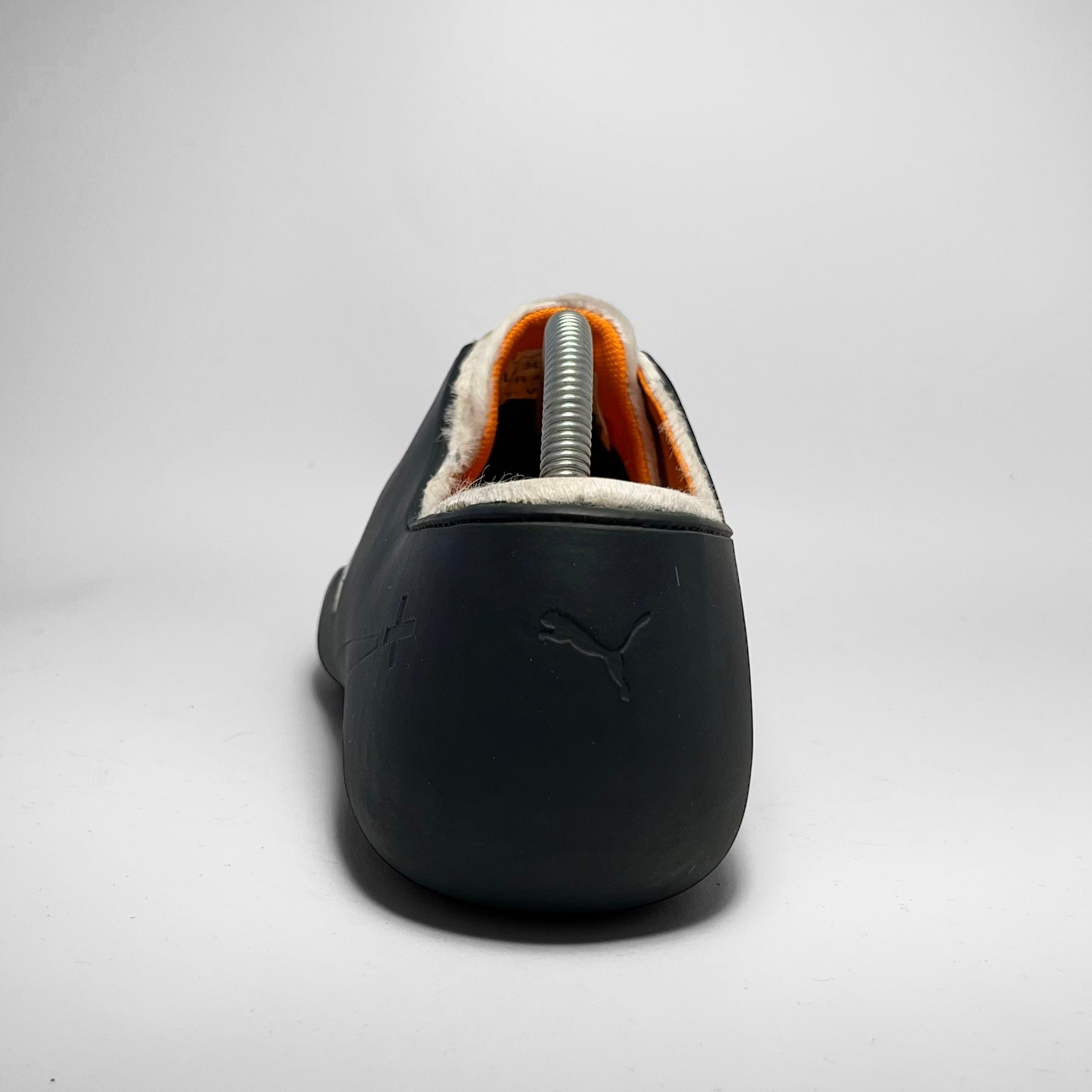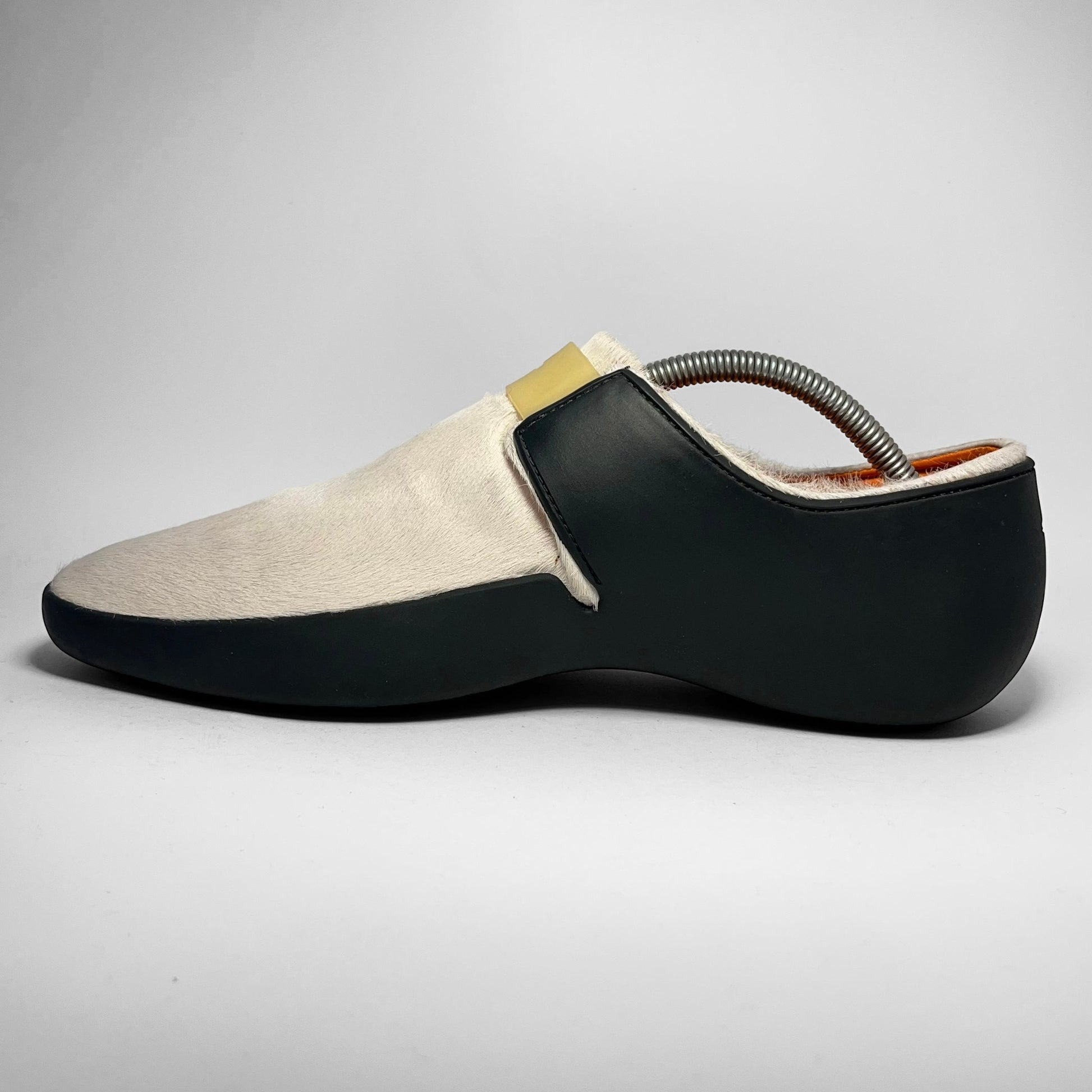 An ultra-minimal slip-on silhouette combining sleek black rubberized panels with a white pony-hair upper. Features a bright orange leather lining and subtle embossed Puma and Starck branding on  both inside and outside, as well as the top rubber part.