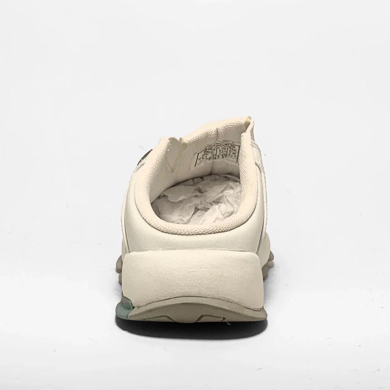 White leather upper panels with stretchable woven parts on top for comfort and easy access, grey and blue outsole, and UK emblem to top it off.
