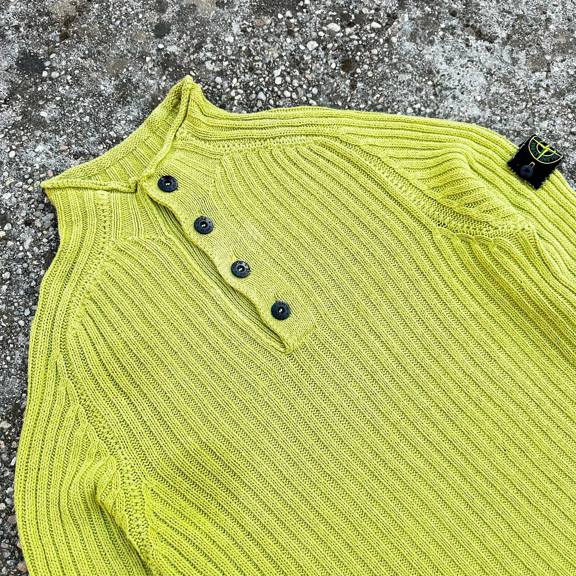 2000s Stone Island button down pullover. Crafted in a woven ribbed construction. Engraved buttons throughout in a key lime colour way.