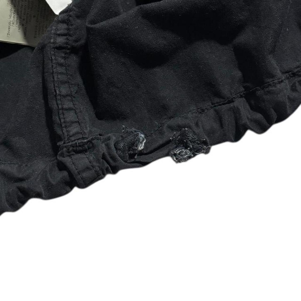 Good condition, with a small tear on the back of the right arm and some broken drawstrings at the hem.
