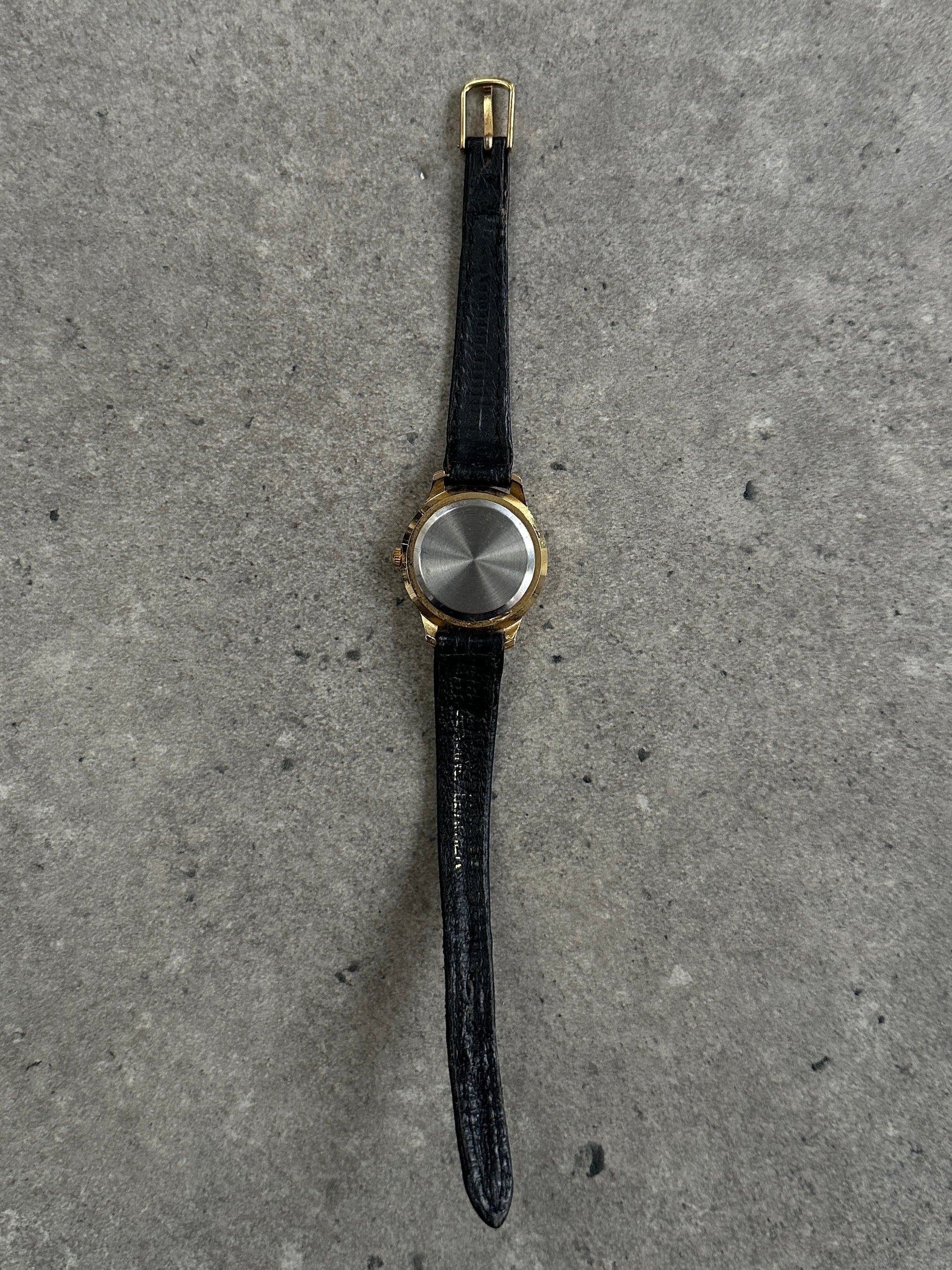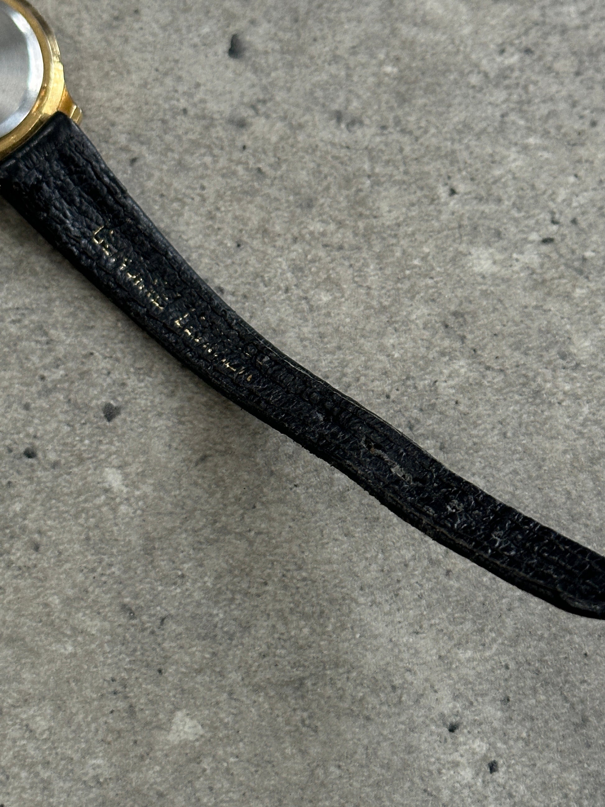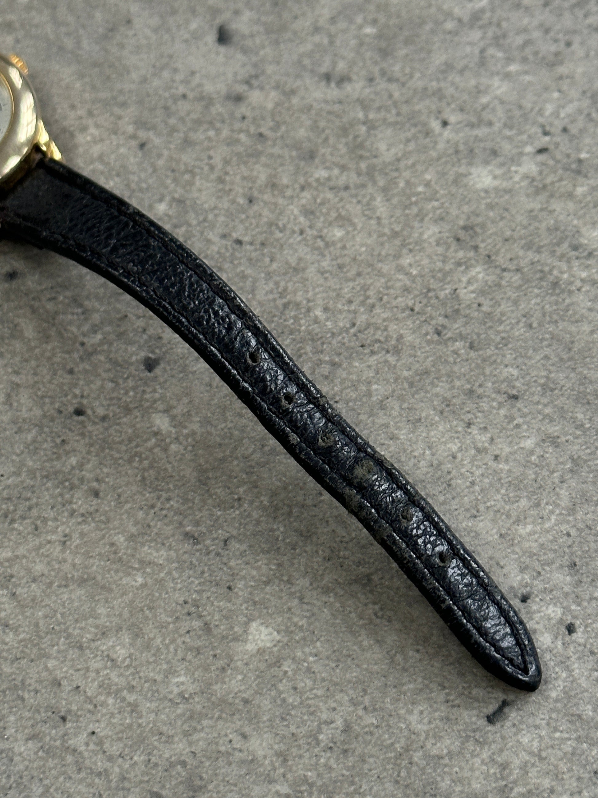 Vintage 1990s Avalon gold tone quartz watch featuring a Roman numeral dial and black leather strap.