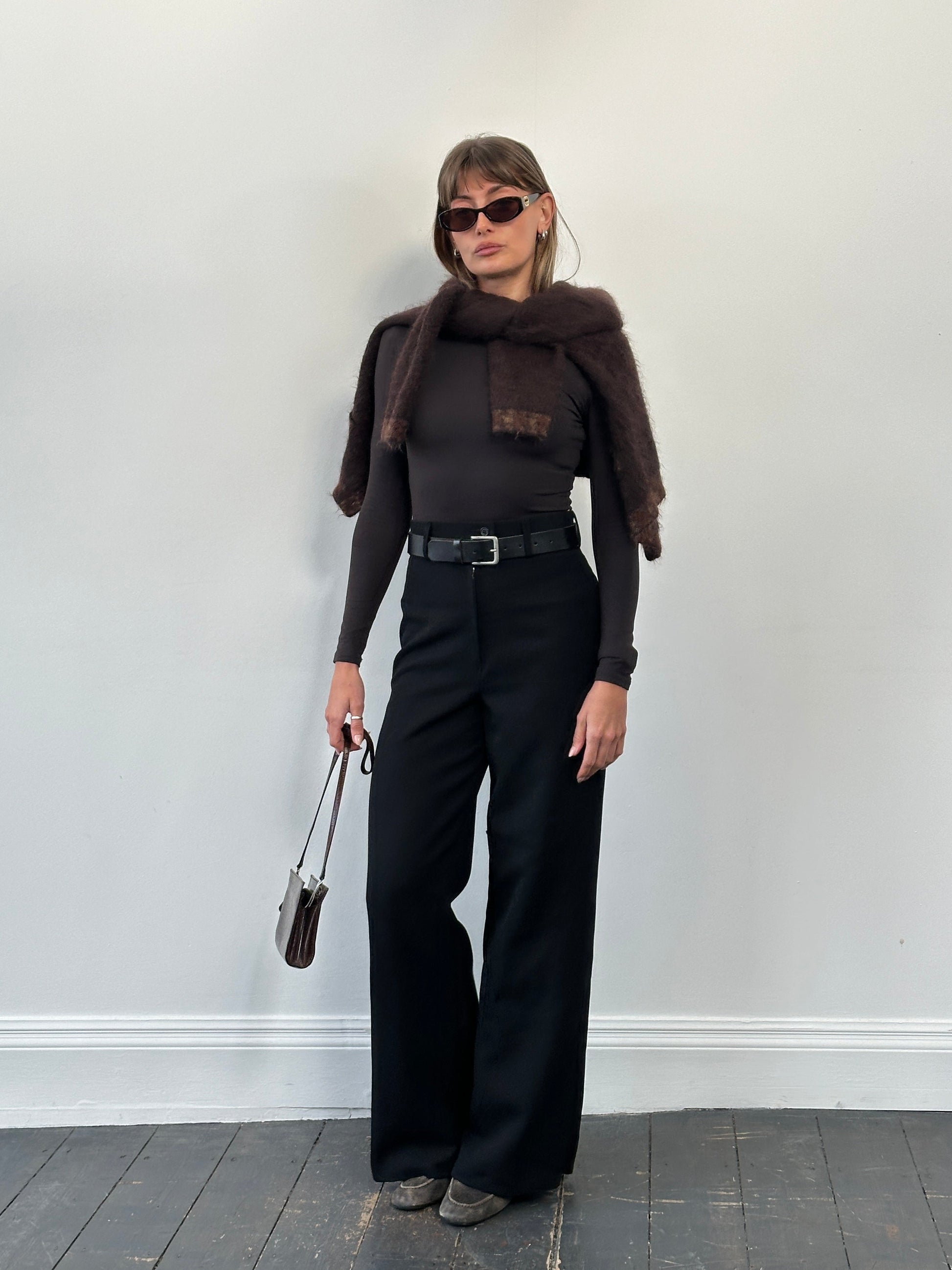 Vintage 1990s black women’s trousers cut in a fluid wide leg silhouette with a clean high rise and softly tailored drape. Crafted from pure wool with a minimal finish, offering an elegant, timeless shape suited to both tailored and relaxed styling.