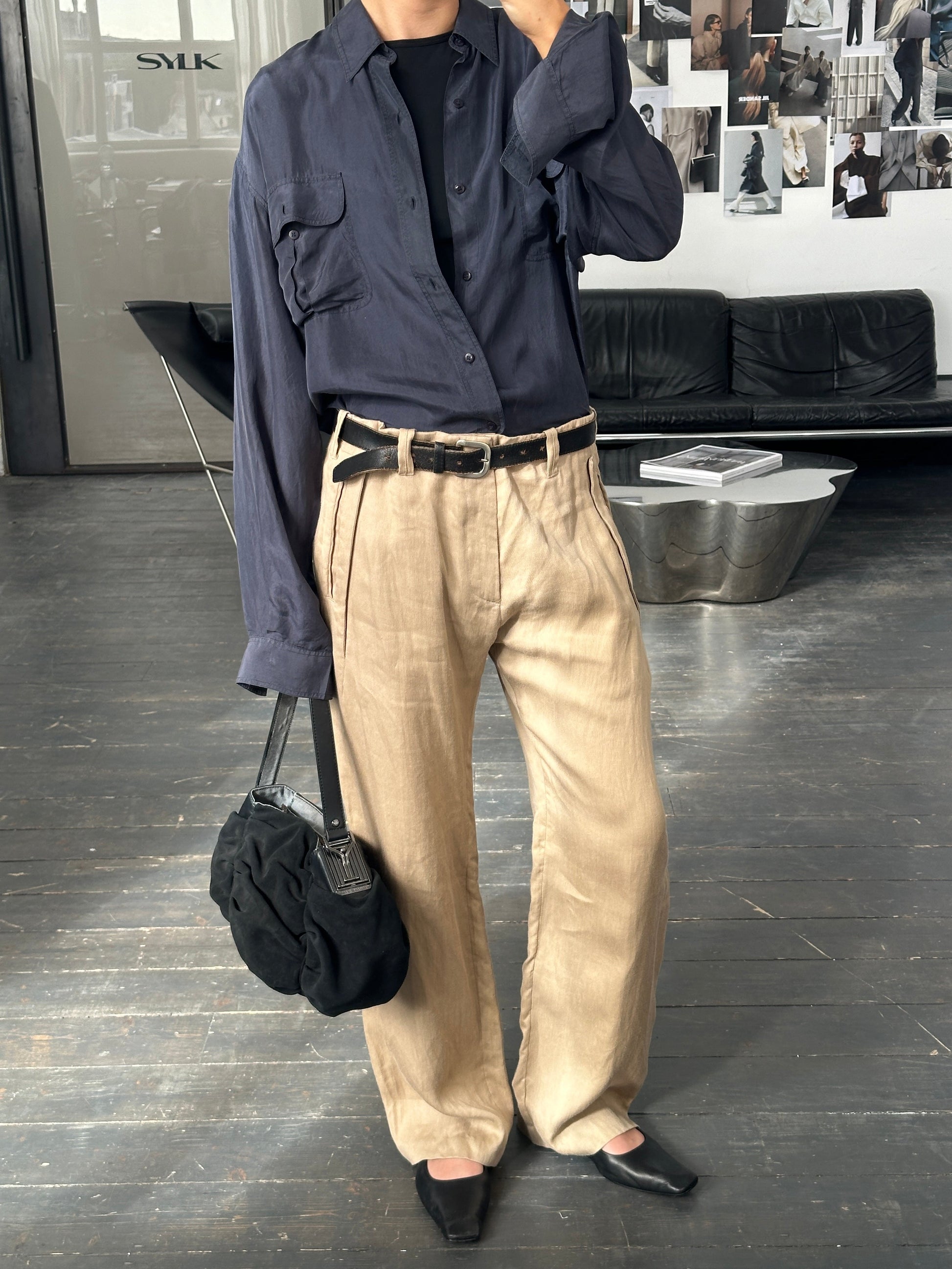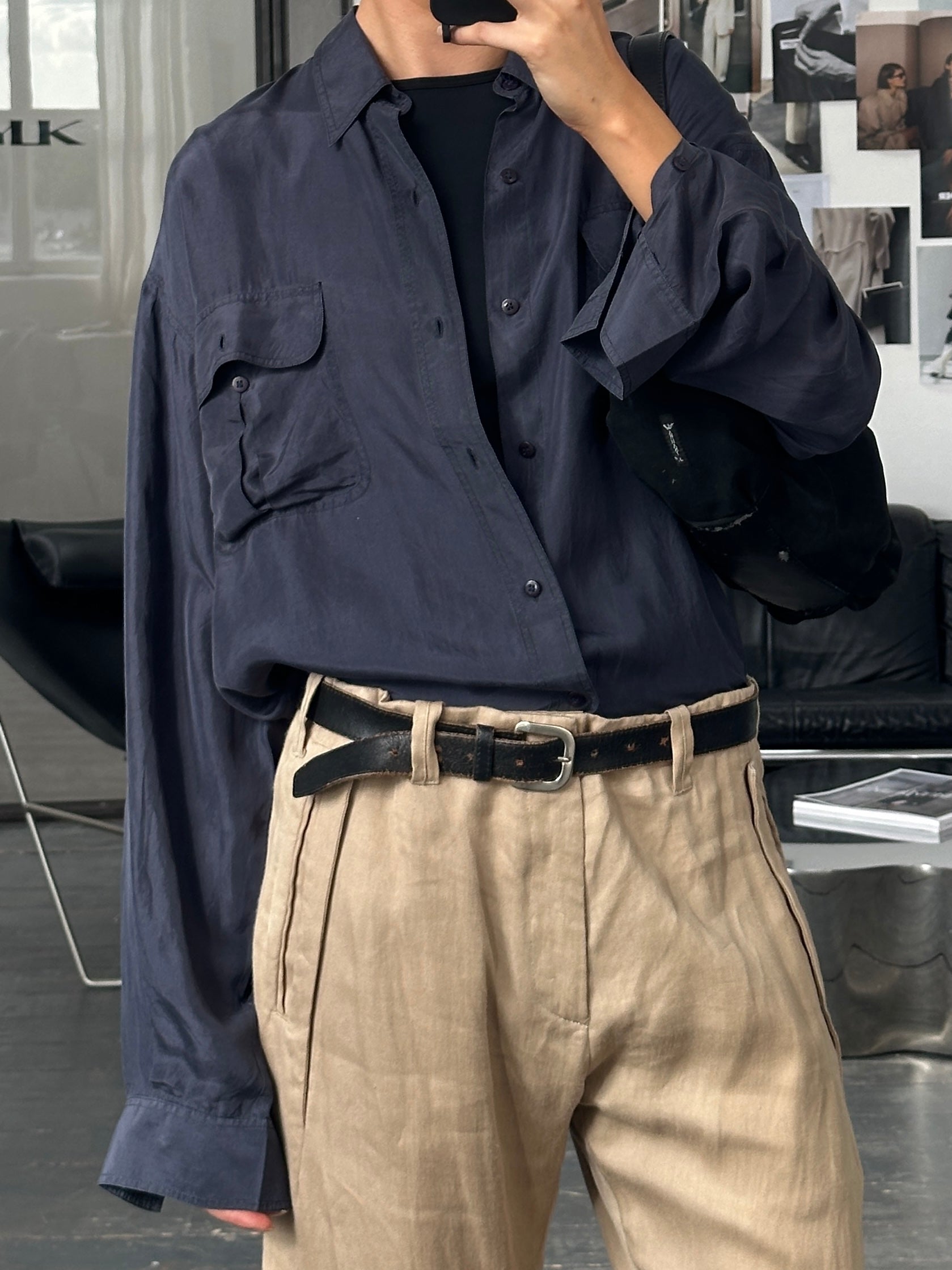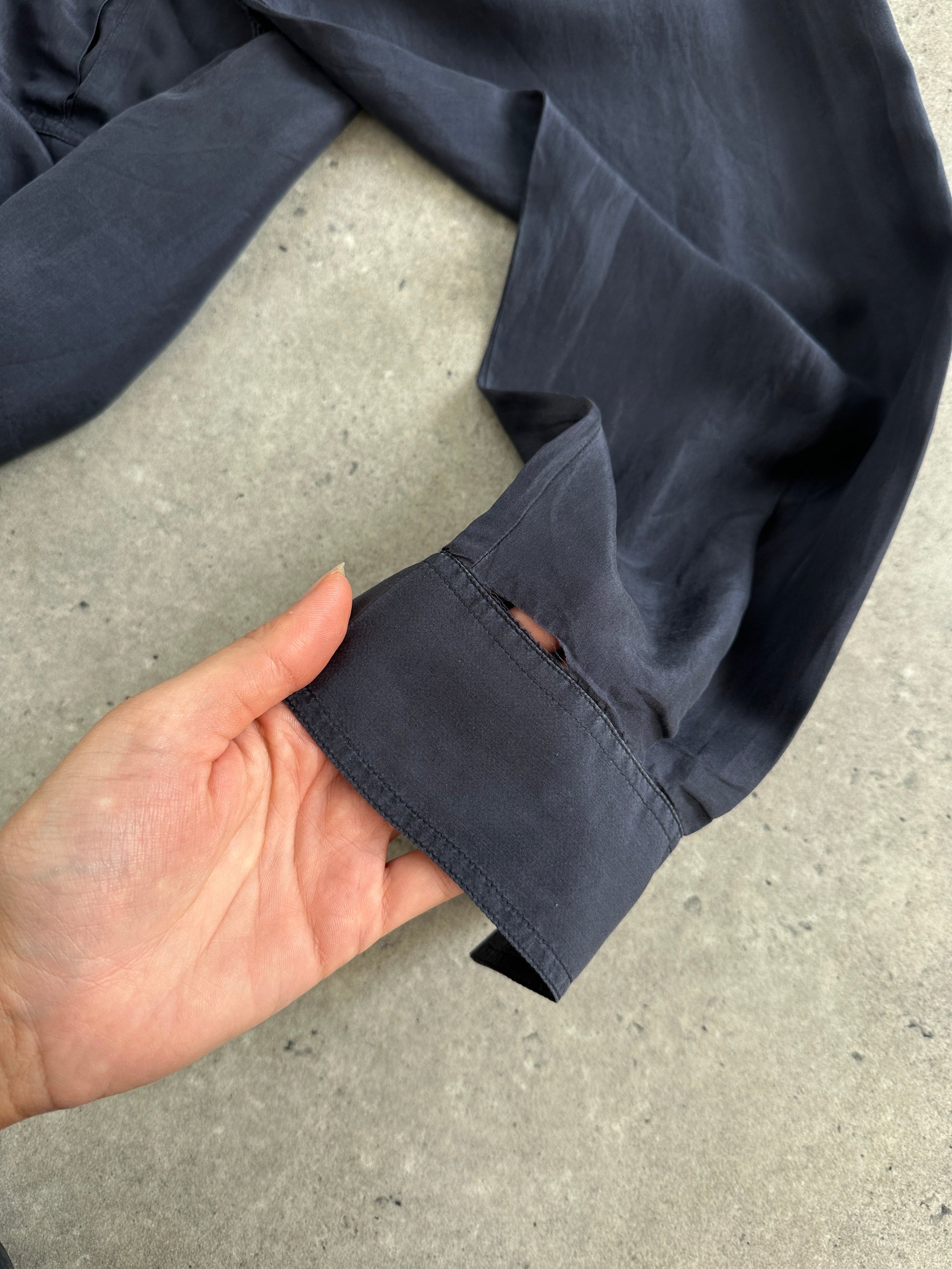Italian 100% silk utility shirt in deep navy, cut to a relaxed oversized fit with chest pockets and a softly draped finish
