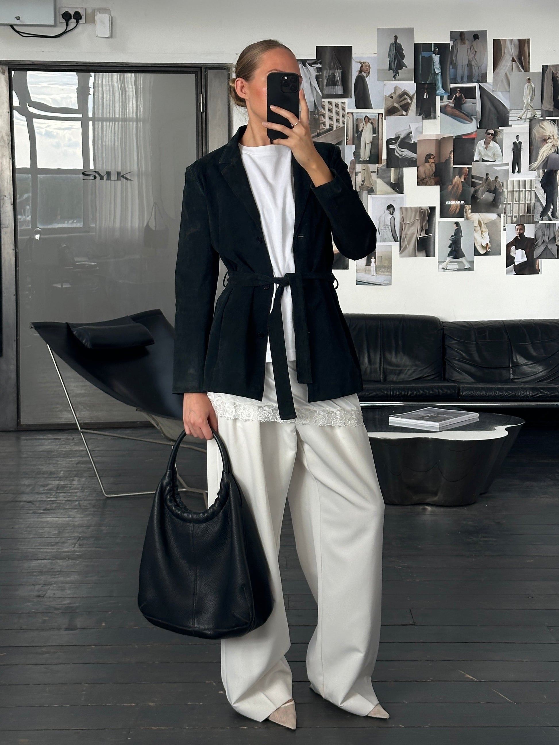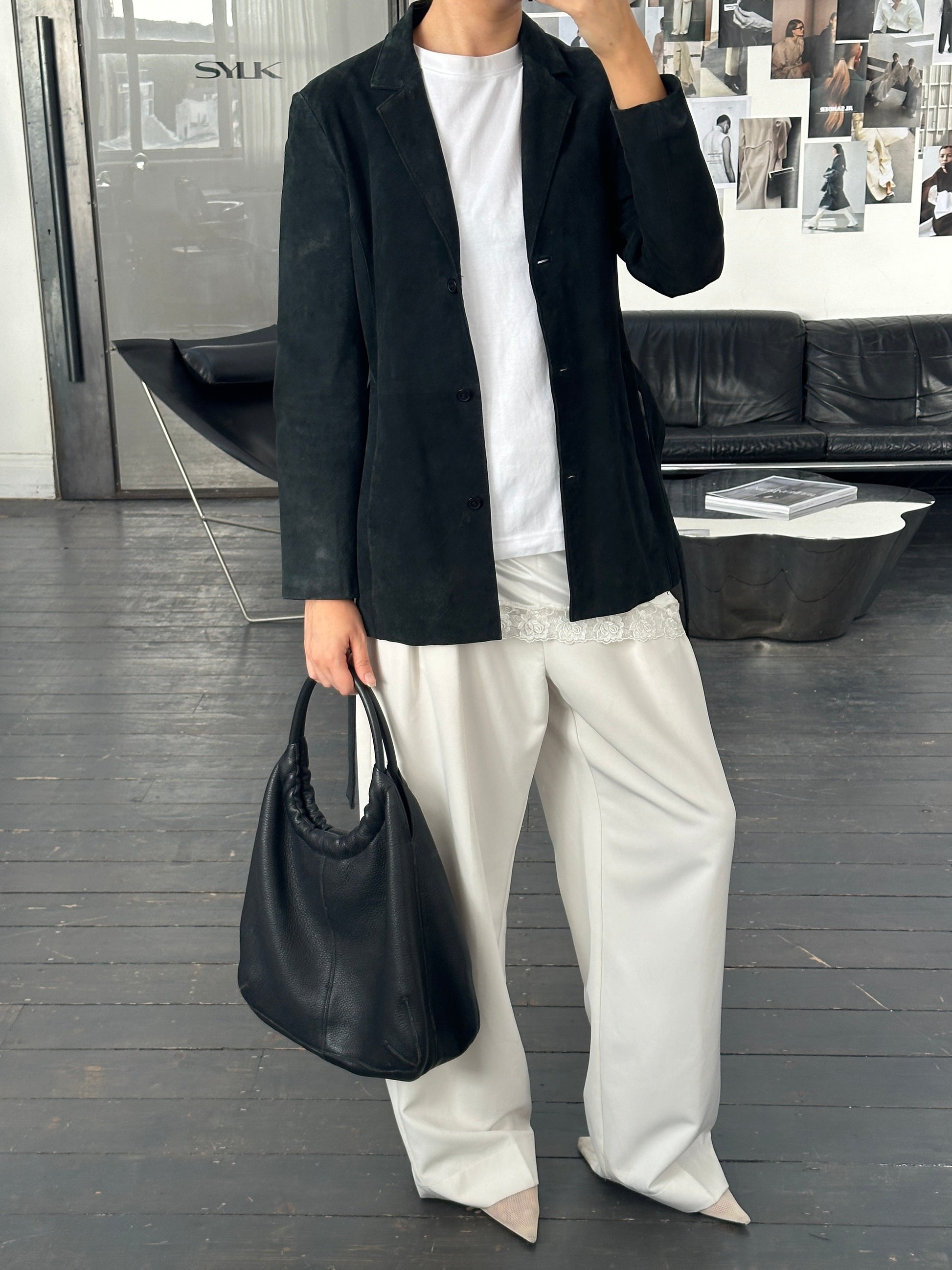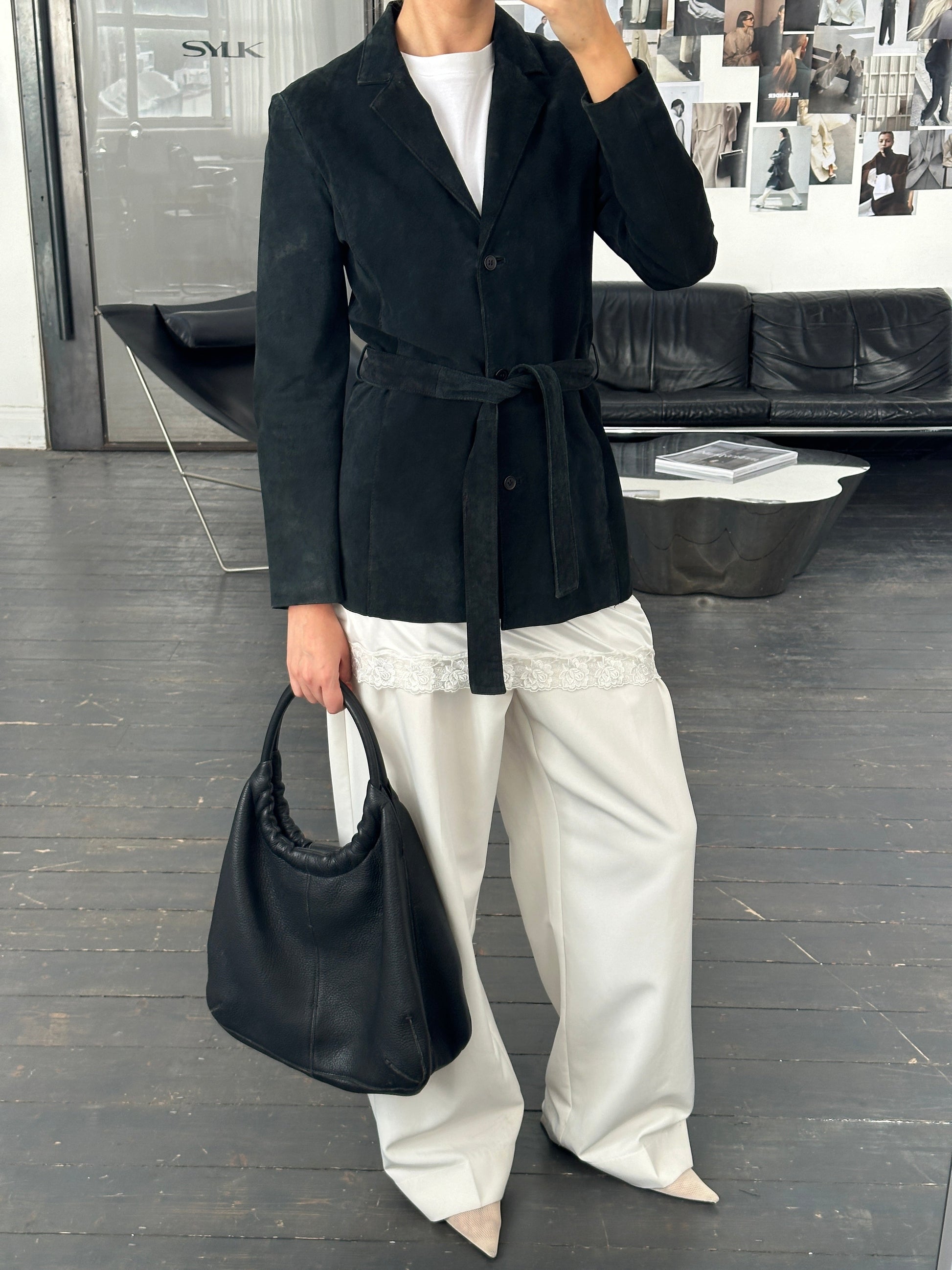A refined Windsor suede jacket in deep navy, tailored with a belted waist for effortless structure and timeless sophistication.