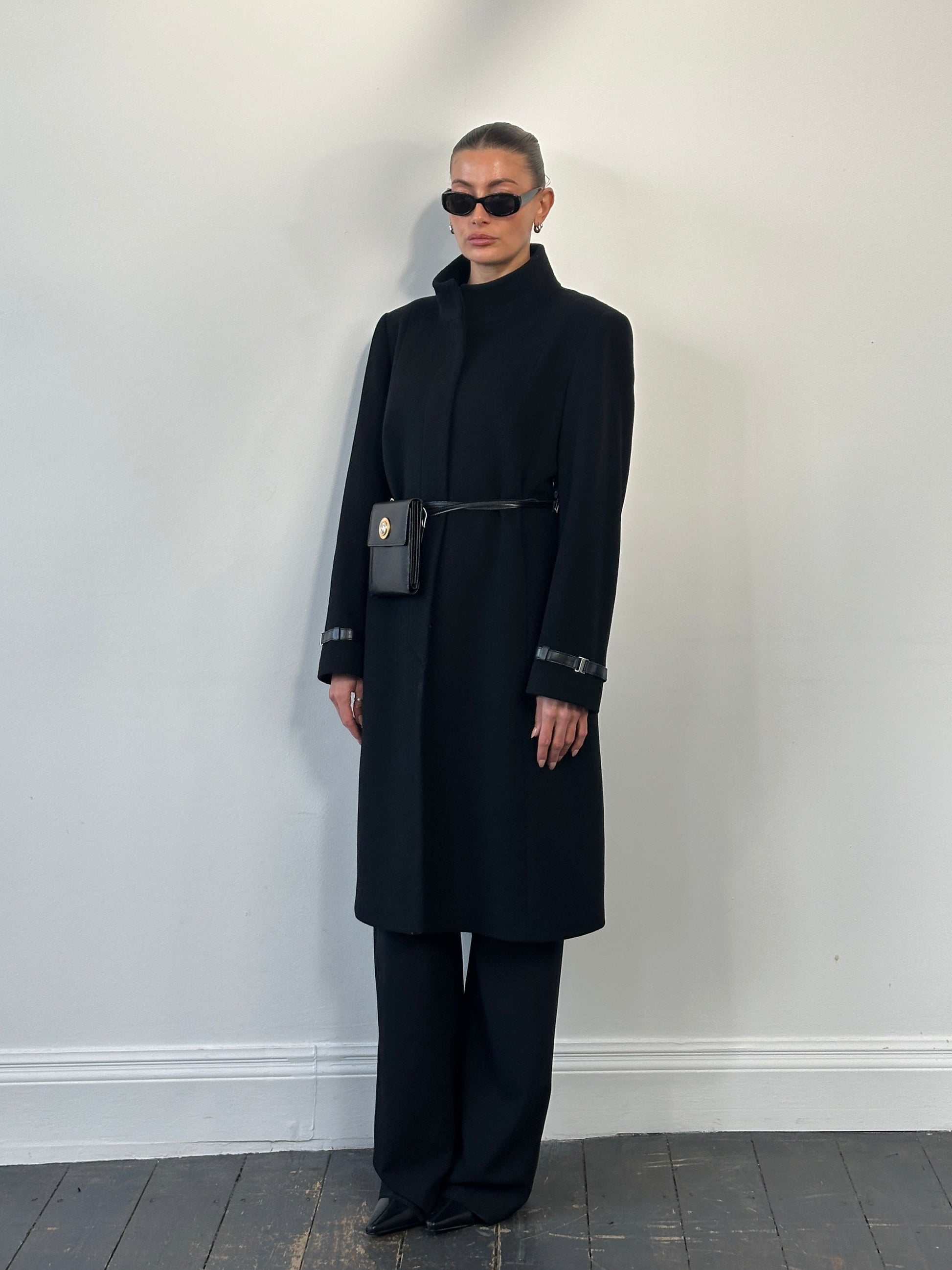 A vinatge 1990s black wool coat by Windsmoor with a clean concealed placket, structured funnel neckline, and subtle faux leather cuff detailing. Cut with a longline silhouette and soft tailoring.