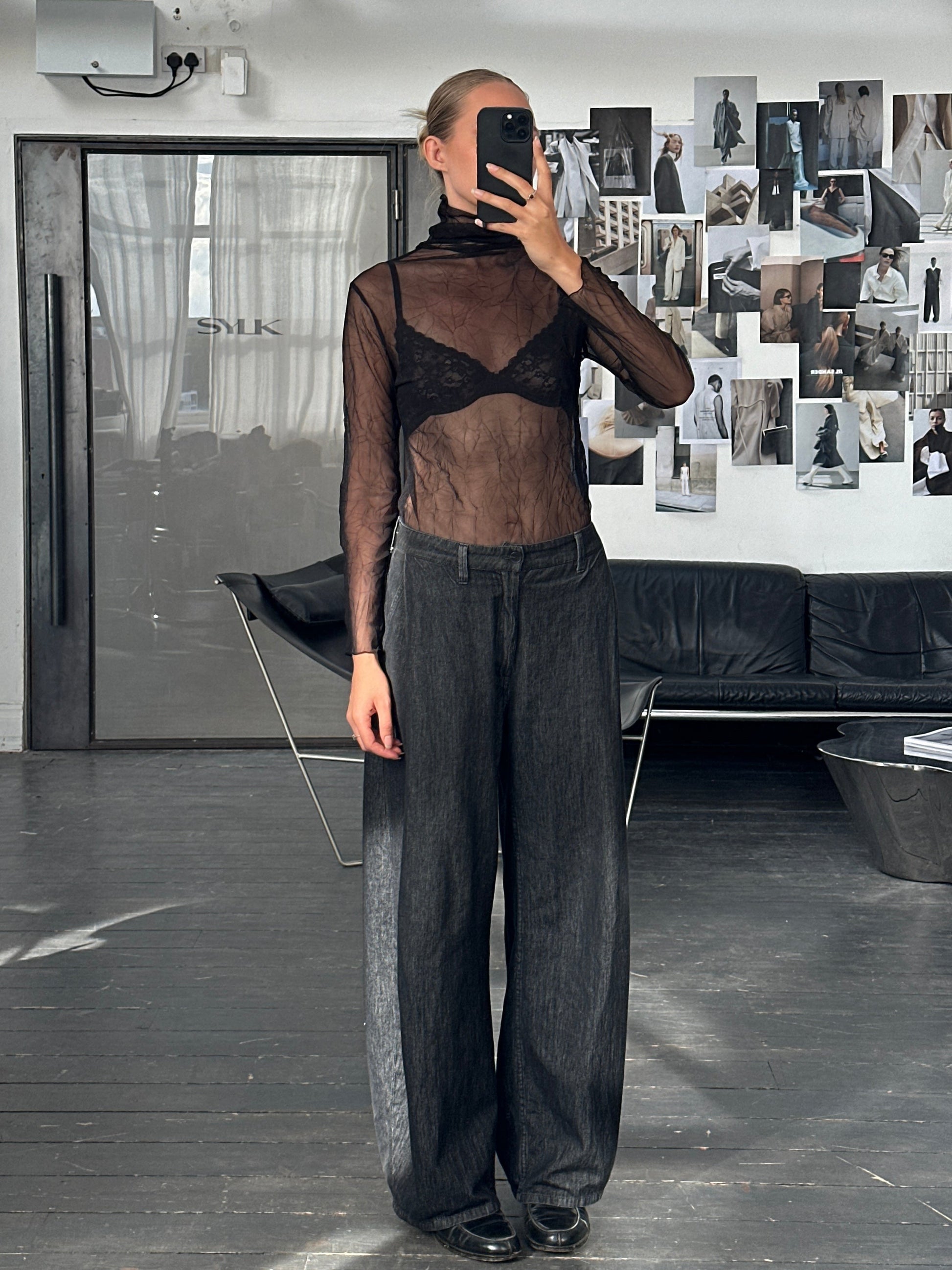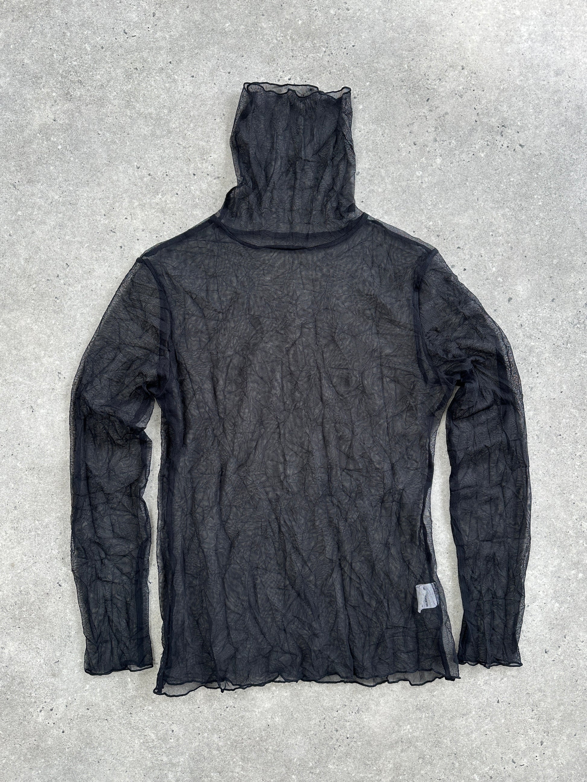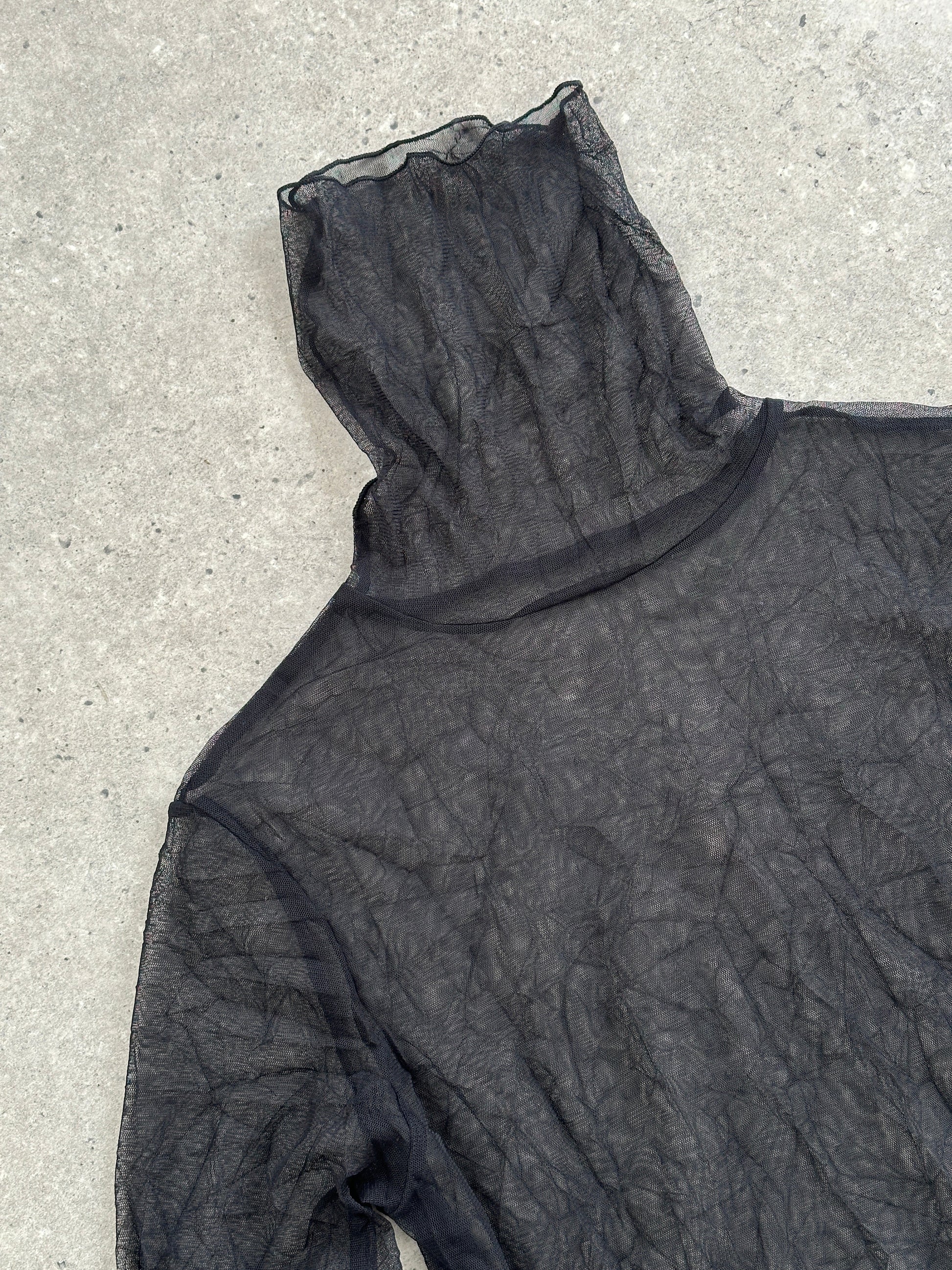 Y2K sheer crinkled black roll neck top in lightweight polyester mesh, designed for layering with a subtle textured finish.