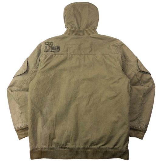 Beautiful jacket with a plain khaki side & a unique Maharishi camo on the reverse. This camo was recently revisited for the collaboration with Palace. The camo side has a stash zipped pocket on the chest & the khaki side has two zipped pockets either side of the body. The camo has sections that have been outlined with stitching giving it a 3D effect. Features the signature two-tone zipper teeth, branded riri zip pulls, a stowaway hood, expandable cuffs & a peaked/elasticated hood. Size fits Small (tagged Women's 10) - 20" p2p & 24" nape to hem Good Condition - very good for age, some light marks on the khaki side