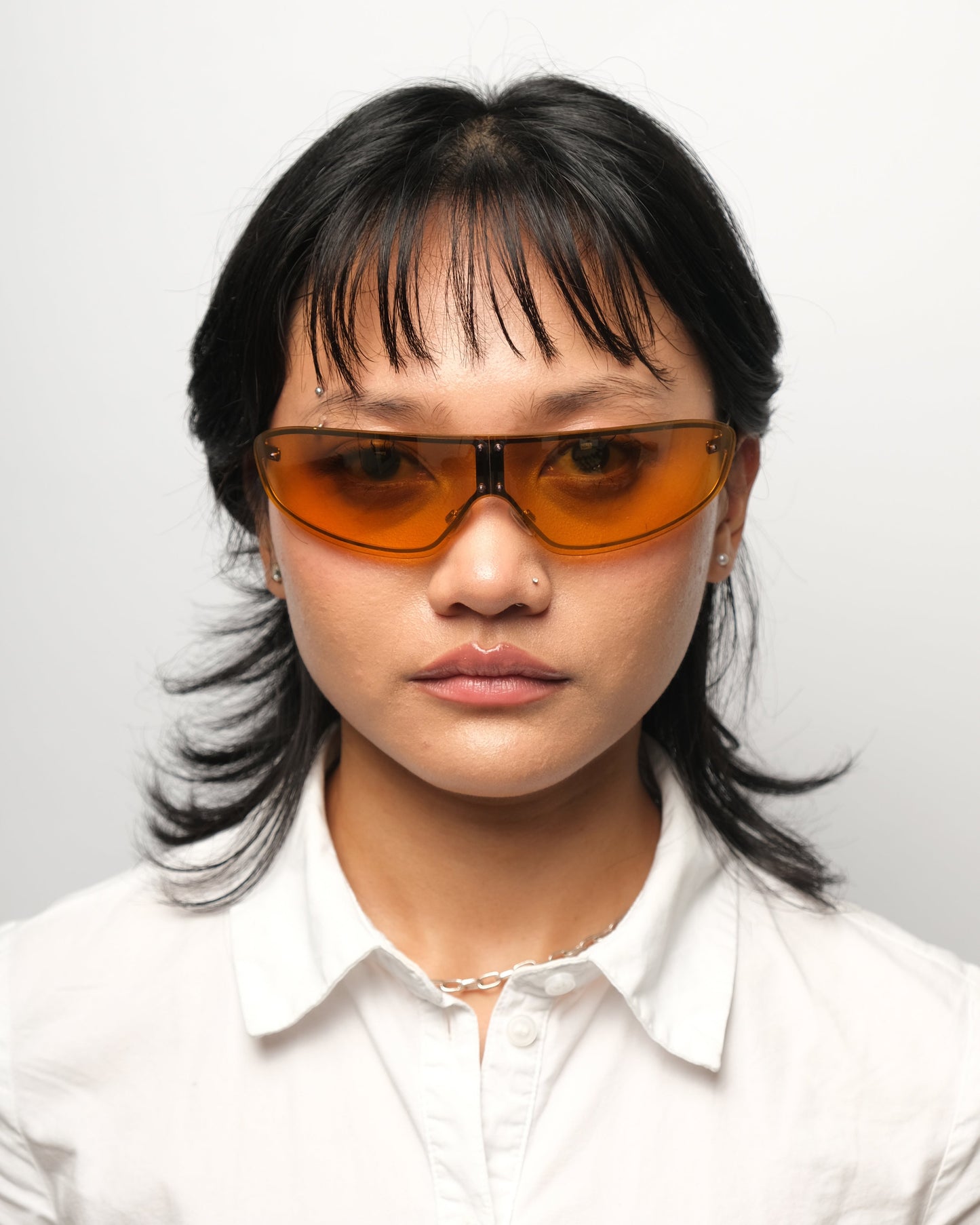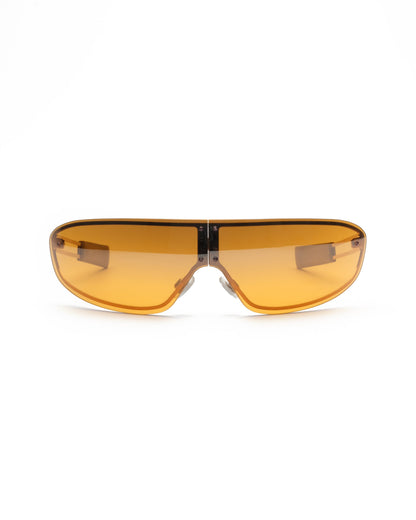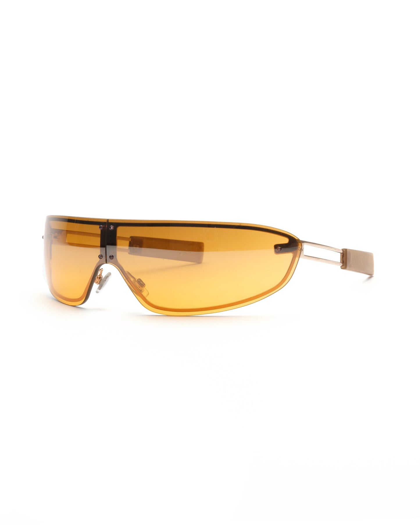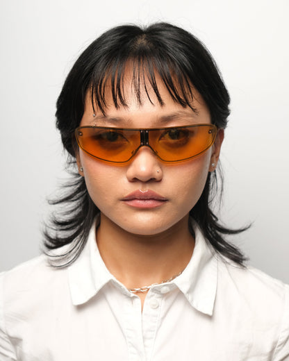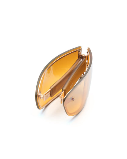 Intricate design composed of a folding gradient orange lens with subtle reflective coating and collapsible copper/gold temples with frosted amber temple tips. Excellent condition. Comes with an Oxydo case accommodating the glasses in a traditionally folded position.